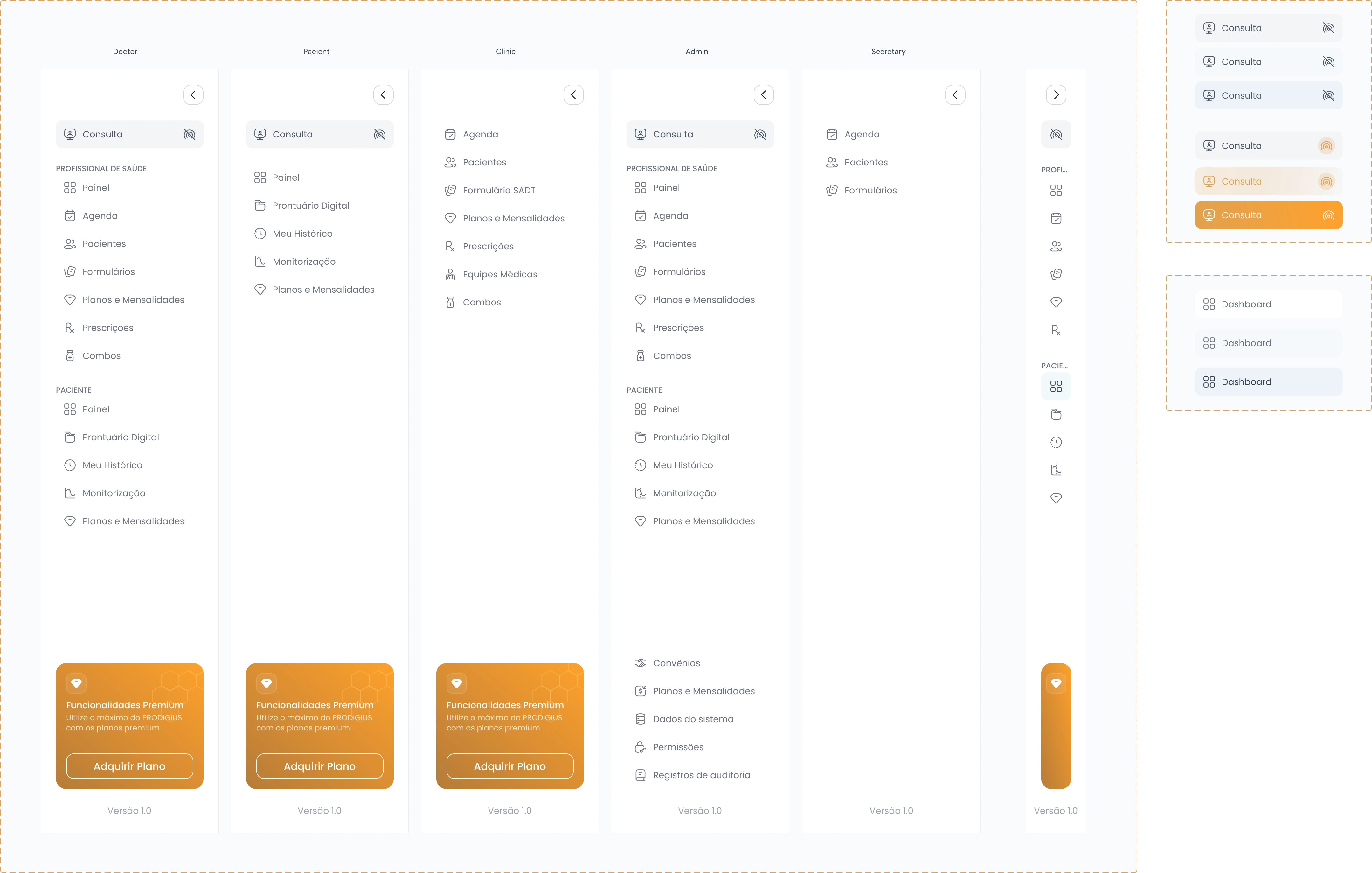 What I changed: Created a role-based navigation system with customized sidebars for each user type (Doctor, Patient, Clinic, Admin, Secretary). Each role sees only the features relevant to them, organized into clear sections (e.g., Doctor: Consulta, Painel, Agenda, Pacientes, Formulários, Prescrições, etc.).