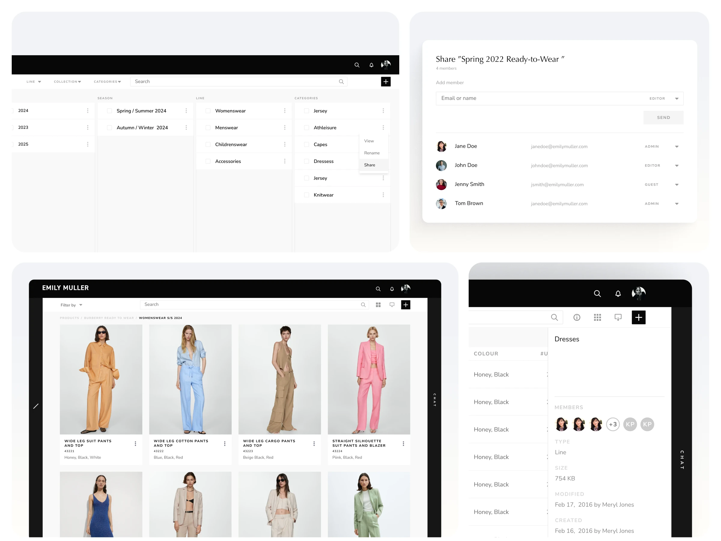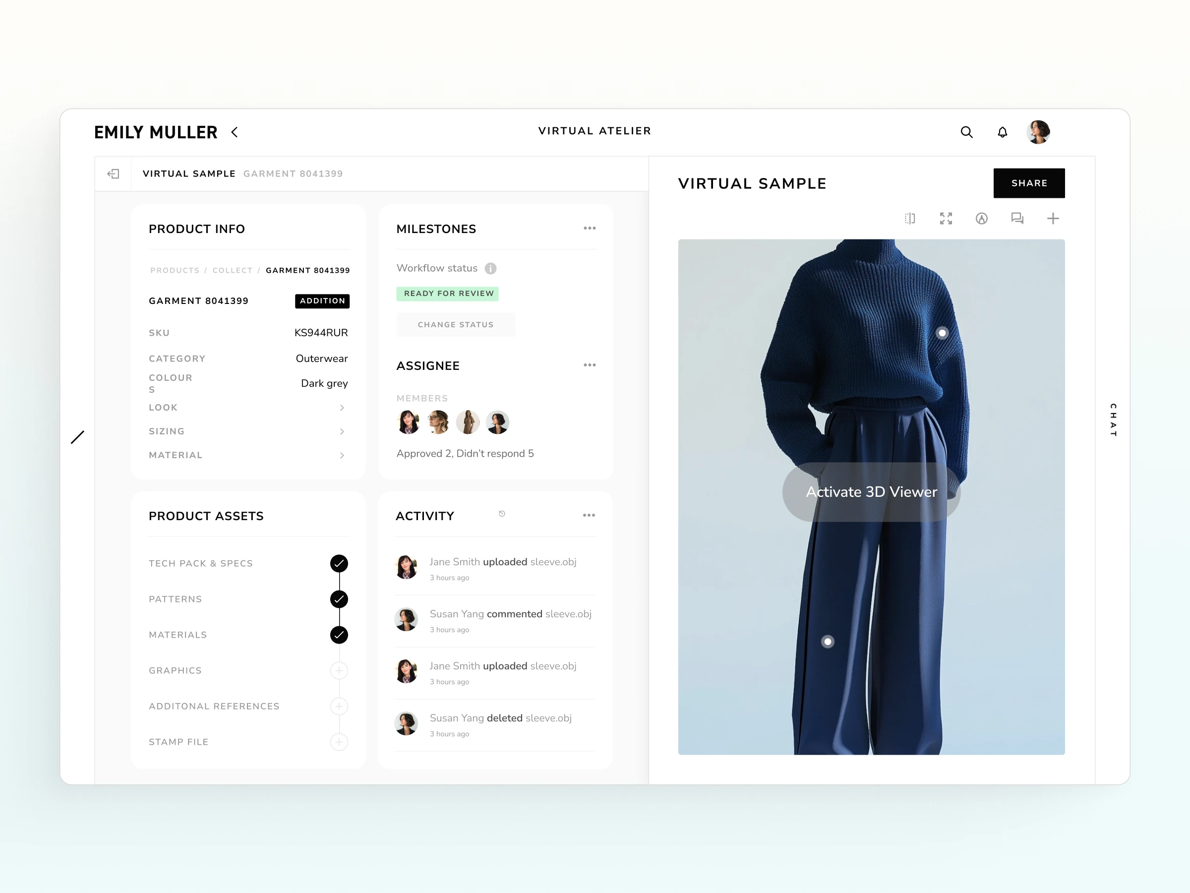 Designed a centralized product workspace where teams can view and manage all related information for a single garment. The left panel displays product metadata, linked assets (tech packs, materials, patterns), and a live activity feed showing recent actions. On the right, users can interact with a 3D virtual sample, enabling annotation, commenting, and sharing.