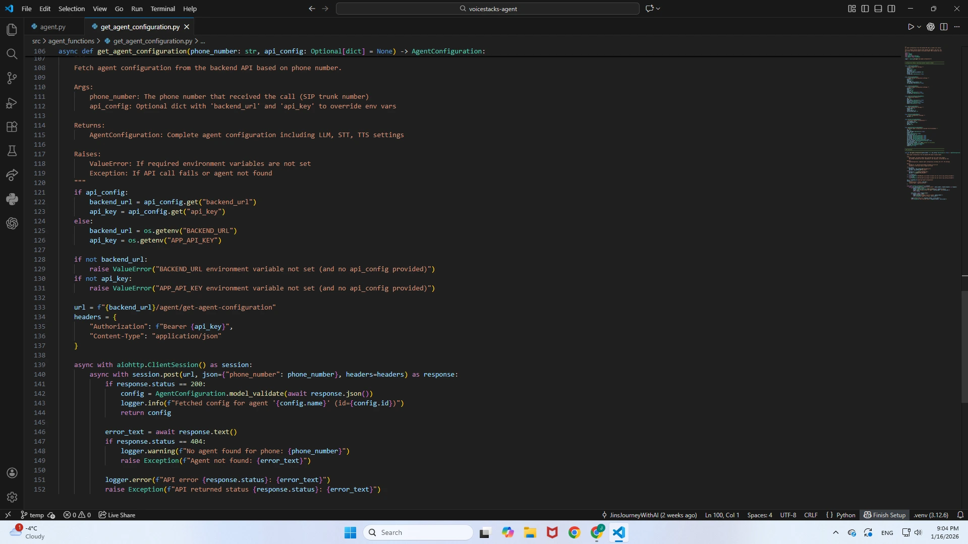 This function is responsible for the real-time hydration of the voice agent. Instead of hardcoding behavior, it executes a synchronous API call to the application backend immediately upon call initialization.Agent Name, System Prompt, Welcome Message, Temperature, and Voice ID associated with the phone number.