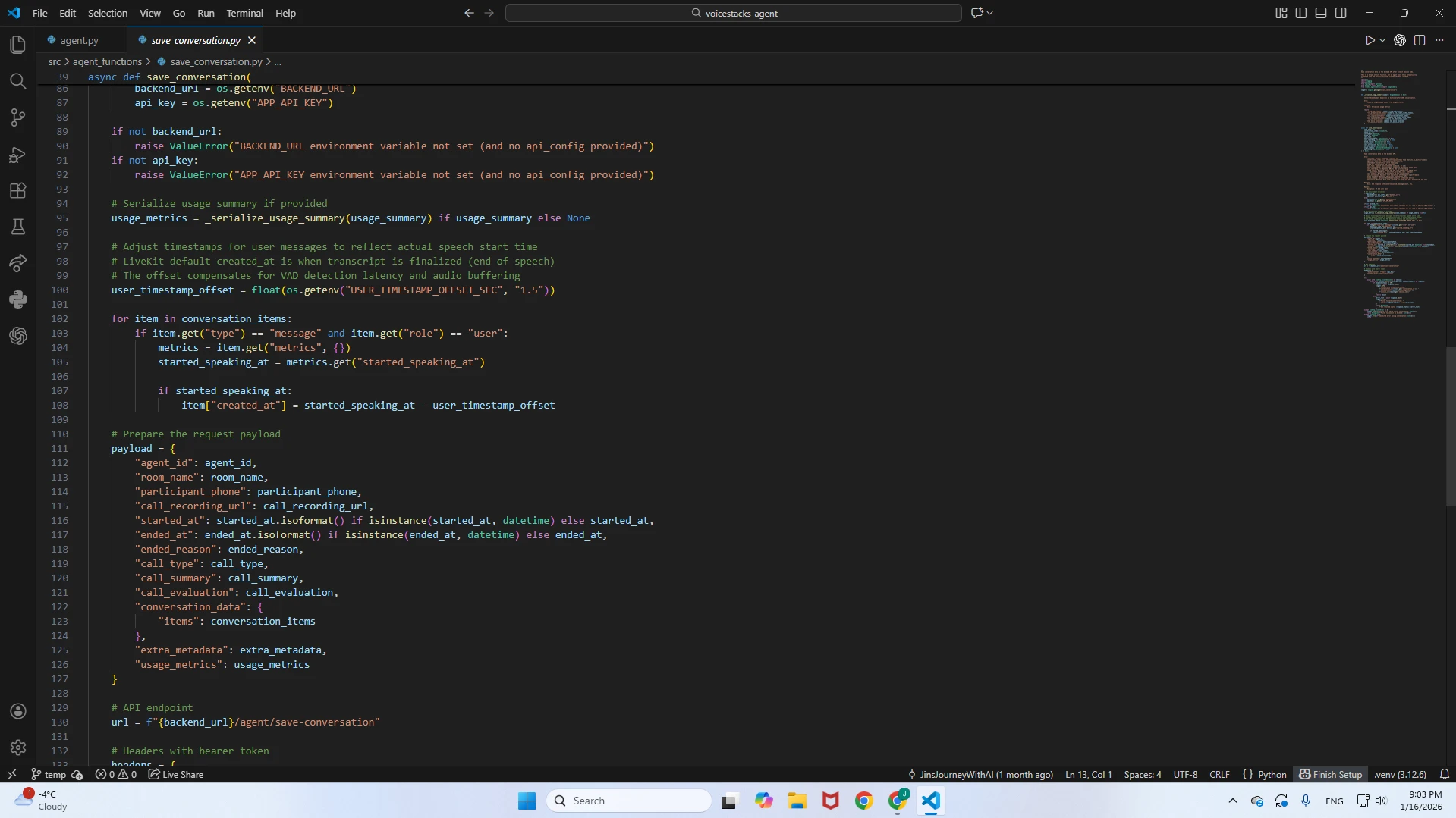 get_agent_configuration function that executes an API call to the application backend upon initialization.save_conversation function that aggregates the session payload and pushes it back to the backend. This triggers two critical sub-functions:get_agent_configuration.py