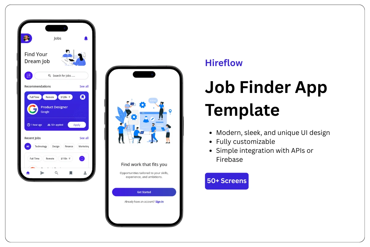 A user-friendly FlutterFlow job app with job browsing, saved listings, applications, and recruiter management features.