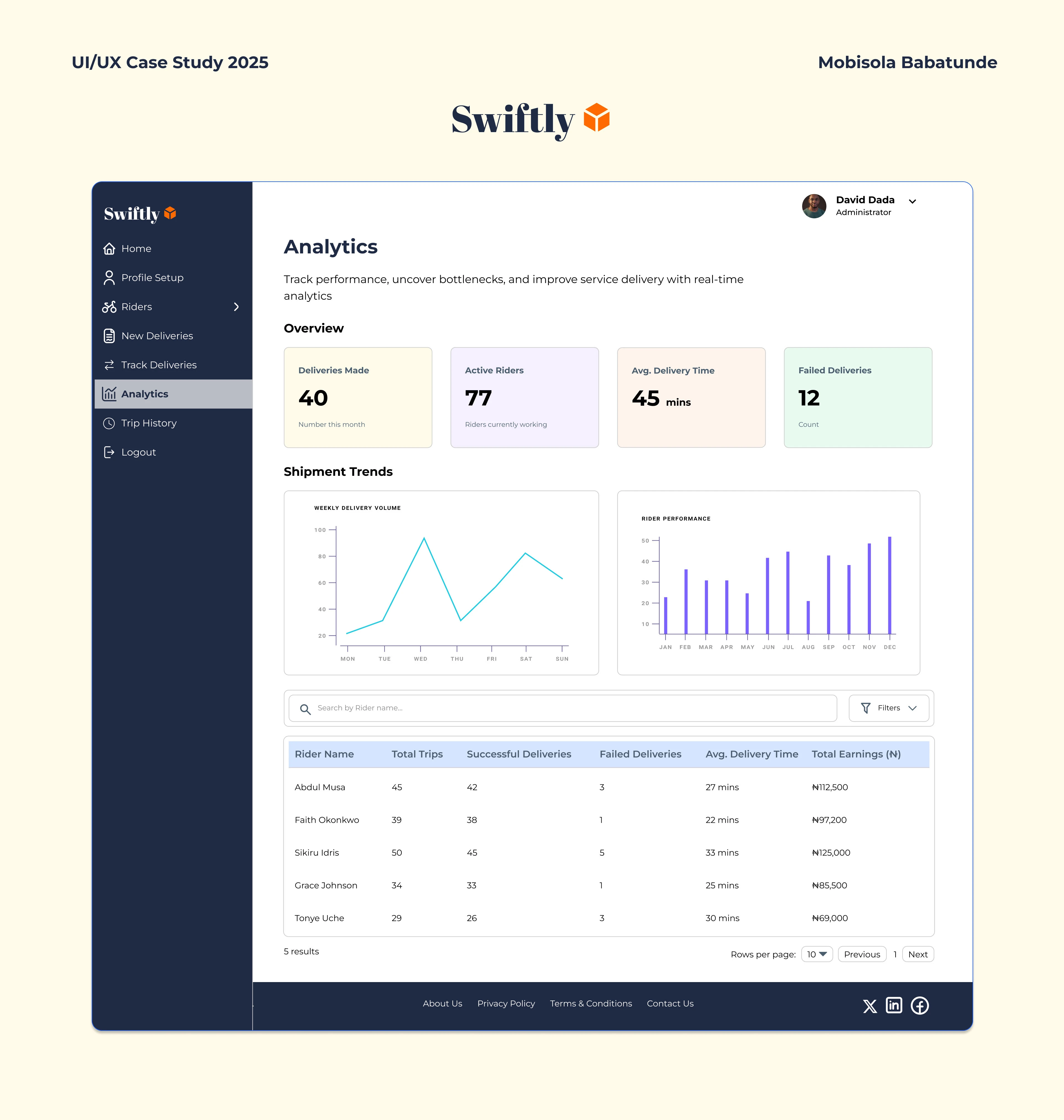 We built Swiftly logistics management system for logistics companies and independent dispatch riders to efficiently manage their operation and fleet.