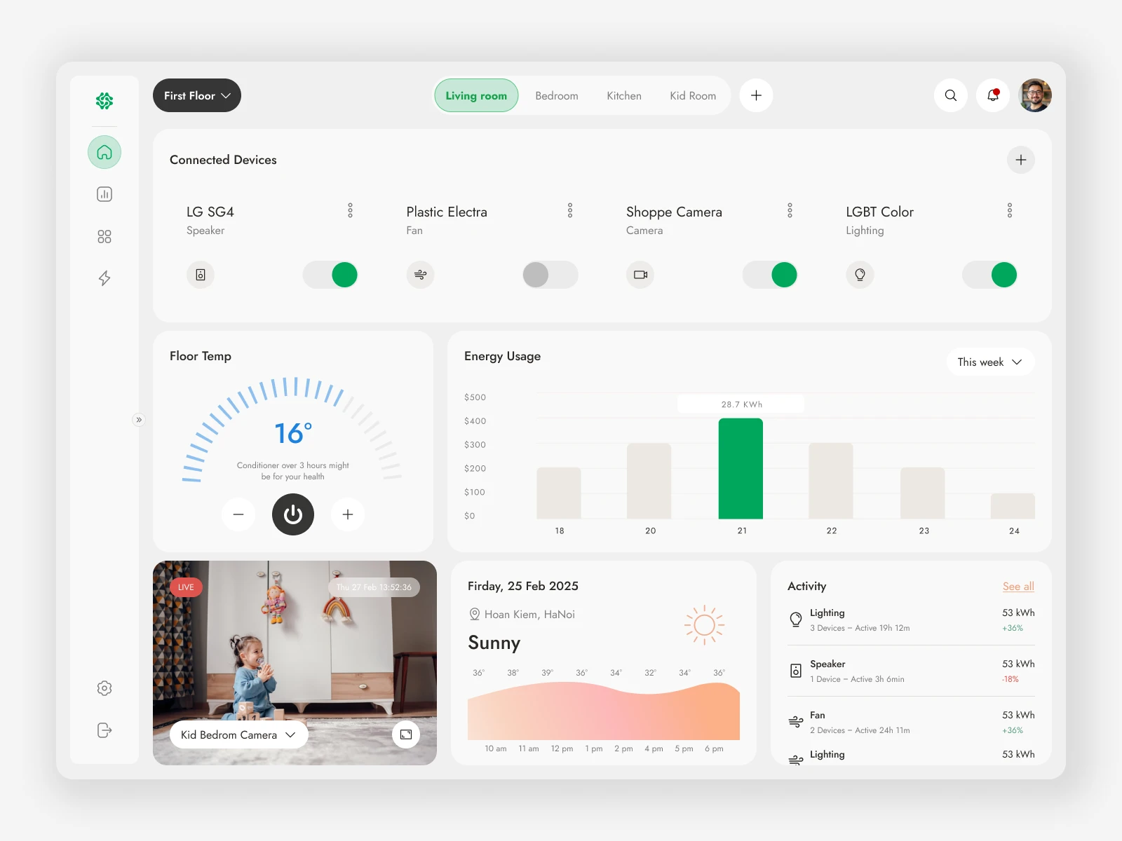 A intuitive interface for managing connected devices, energy usage, & security. Featuring real-time temperature control, live camera & detailed energy stats.