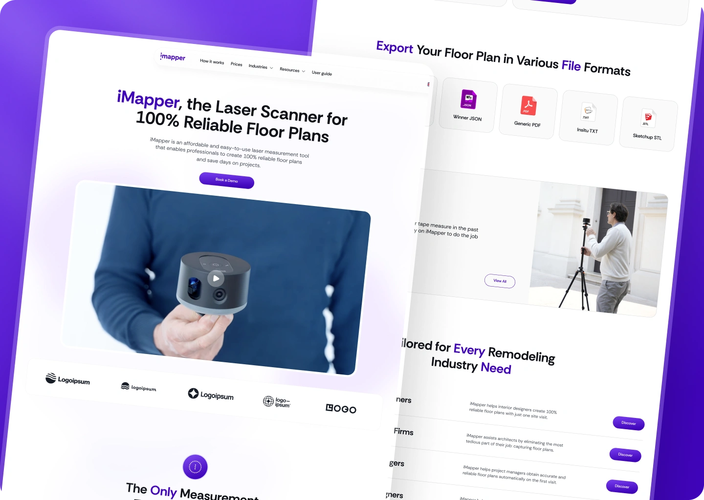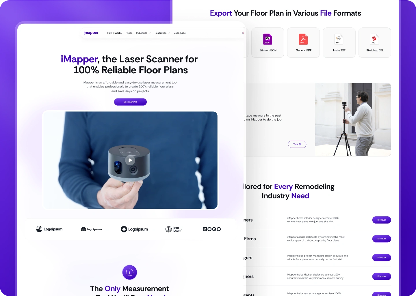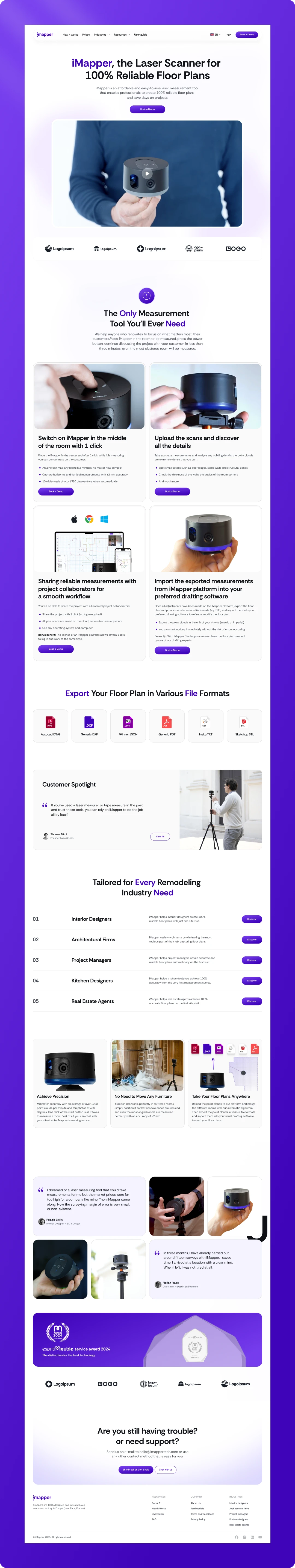 iMapper creates the Racer—a 360-degree laser scanning device that captures room dimensions in under two minutes with ±2 mm accuracy. Their target audience includes architects, interior designers, kitchen specialists, and real estate professionals who need precise digital floor plans without manual measurement hassles.