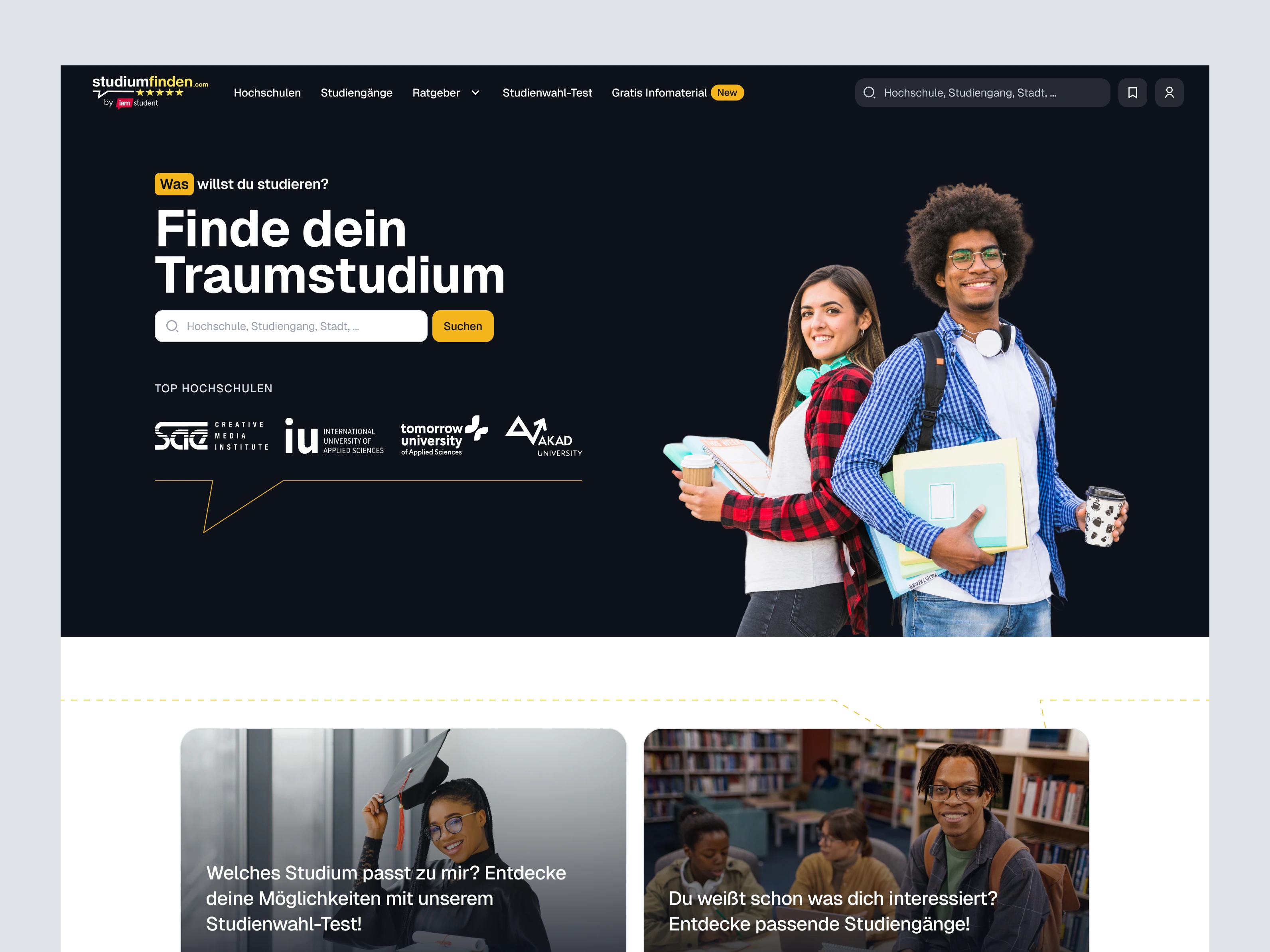 One of the most obvious challenges for us was the language barrier, but that did not last for long once we understood the entire flow of the previous website. Our next challenge was understanding how German users interacted with the study website. The main task was finding out what websites currently existed, what made those websites not only stand out but also convert users, and lastly finding ways to communicate Studiumfinden's new bright & bold website branding.