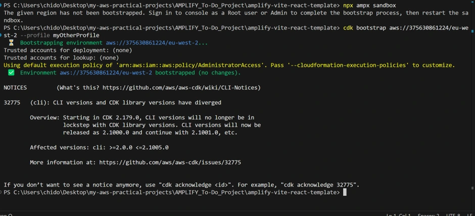 npm ampx sandbox leverages Amplify Gen2’s local setup to create a temporary (sandbox) environment in the cloud that mirrors your backend configuration. You’ll be prompted for some inputs, such as “Select an AWS profile” or “Use the default environment name?” This environment will be separate from any existing main or dev environment.npm ampx sandbox might show messages like:aws configure sso or aws configure). After configuring, re-run npm ampx sandbox. You will get a confirmation from Amplify as it pops with the message:
