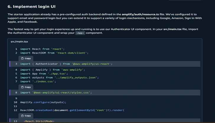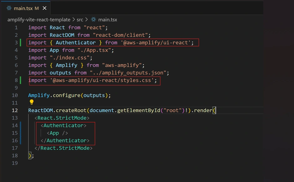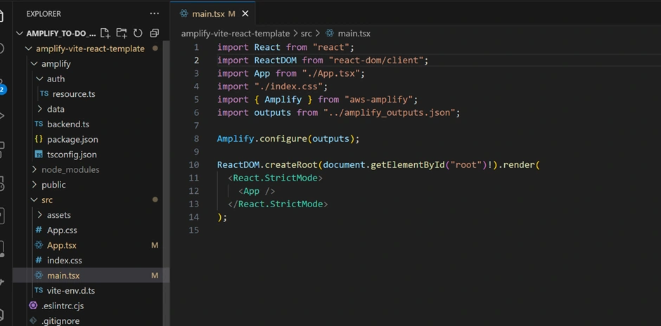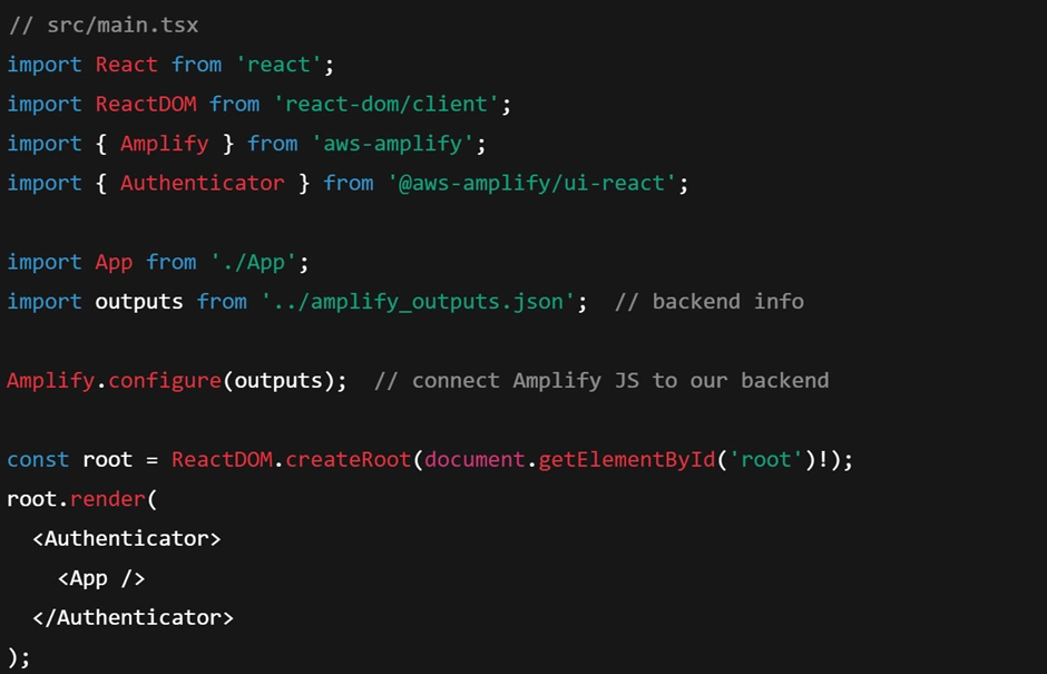 package.json file and installs all the required packages into the node_modules directory. Additionally, it ensures that the versions specified in package-lock.json are maintained, ensuring consistency across different environments.amplify/auth/resource.ts) using Amazon Cognito. By default, it is set up to allow users to sign up and sign in with an email and password (you could extend it to social providers or multi-factor auth later).src/main.tsx. This is where the React app is initialized. We need to wrap our <App /> component with the <Authenticator> from Amplify UI and configure Amplify with our backend settings. For example: