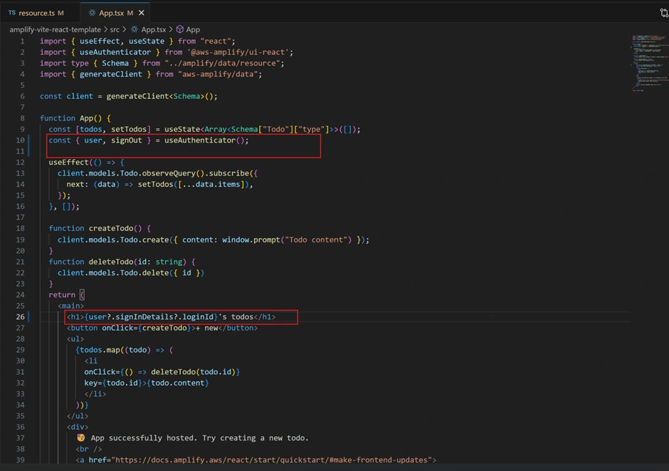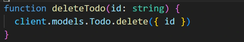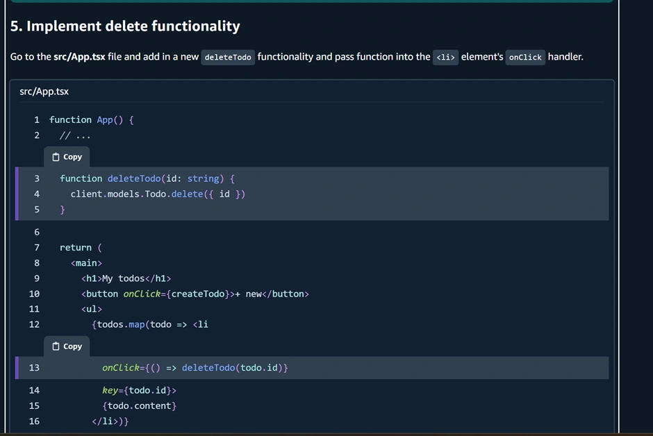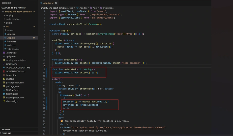 todos state. We render this as a list of <li> items. Each to-do item displays its content text. If we implemented owner-based auth, users would only receive their own items from the API.client.models.Todo.create({ content: "task text" }) to save a new item. This triggers the backend to save to DynamoDB and notify all subscribers (including our app) of the new item, updating the list in real time.deleteTodo(id) function that calls client.models.Todo.delete({ id }). In the UI, they set each <li> to listen for click and call delete on its own ID. Our app can do the same – for instance, clicking a to-do could remove it. (In a real app, you might use a trash icon button for clarity instead of clicking the list item text.) Therefore, we updated the App.tsx with the code below to add the delete functionality.