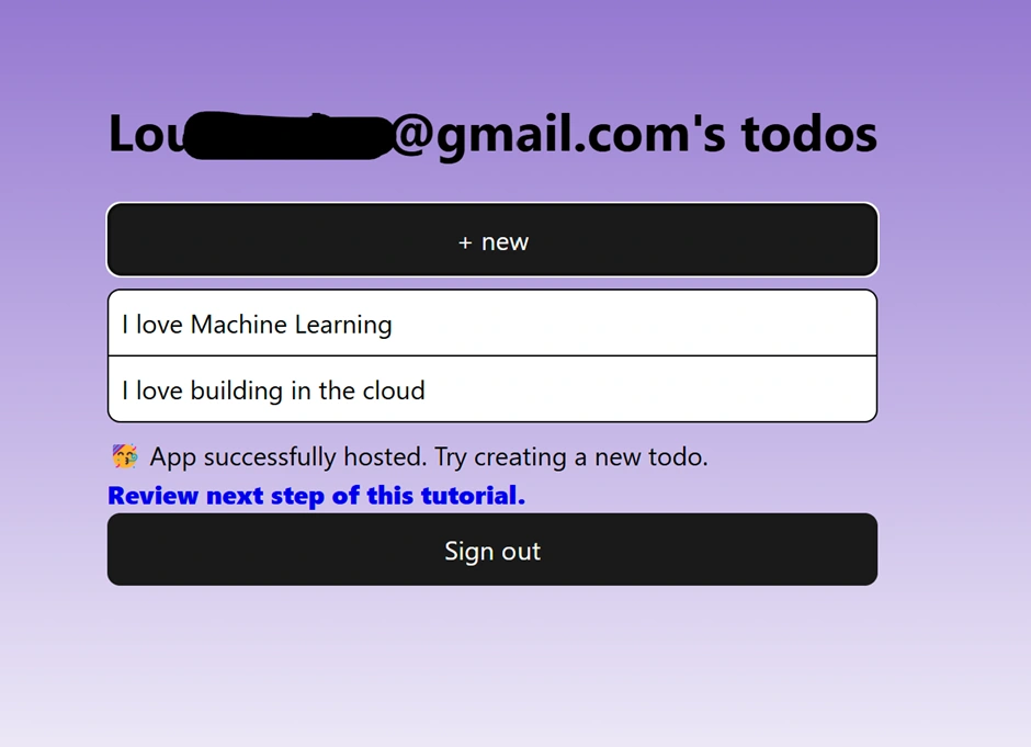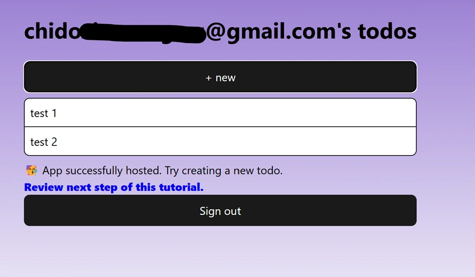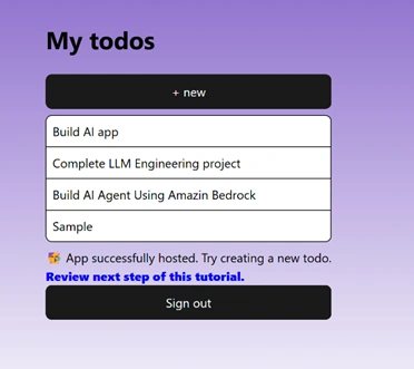 <App />) is displayed.npm run dev or refresh your browser where your local host is running). Open your browser and navigate to your local host address. You should see the login interface provided by Amplify. Interact with the Authenticator, try signing up or signing in. The UI should smoothly transition from the login forms to your main app upon successful authentication. We also added two more Todo’s to the list.