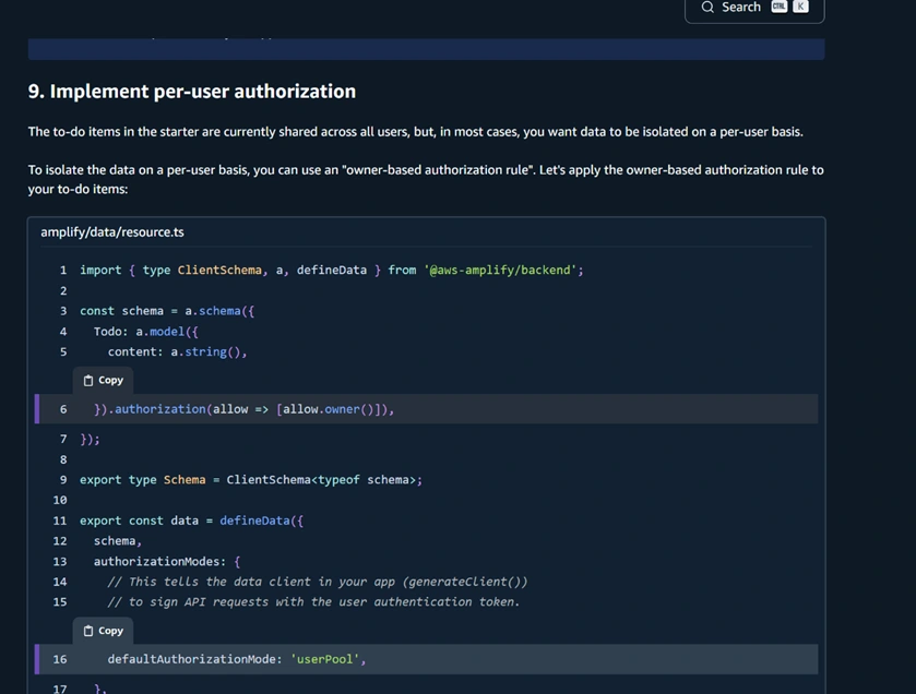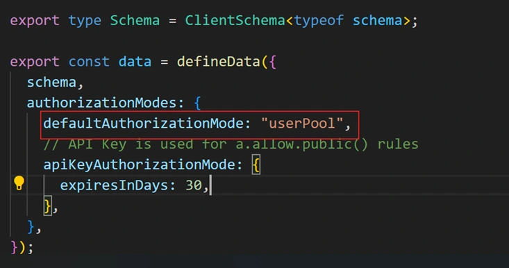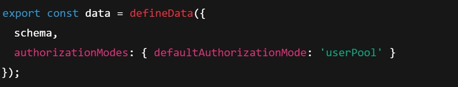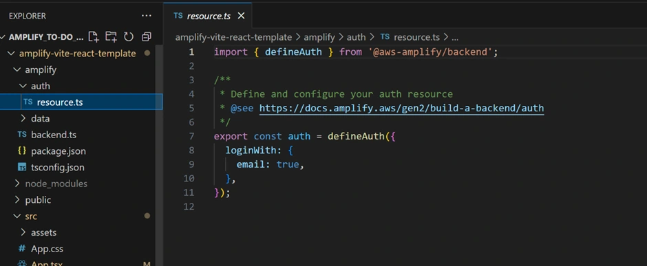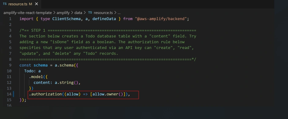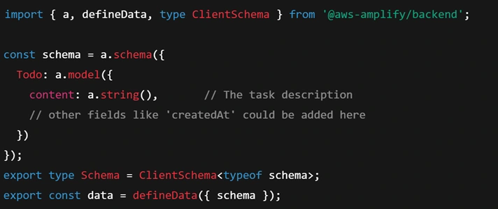 amplify/data/resource.ts file, you’ll find a schema defined using Amplify’s Data Modeling API. For example, a simple Todo model could be defined like: