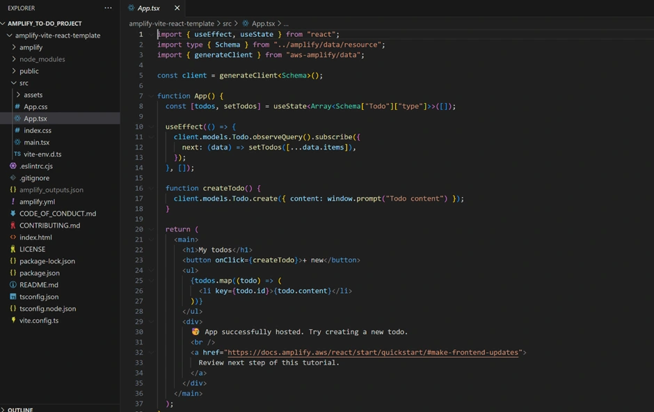 amplify_outputs.json file, containing your backend details.App.tsx, which we can refine. Let’s outline what the React code does and how to modify/extend it:App.tsx, the code likely uses Amplify’s generated data client to fetch and subscribe to todos. Amplify Gen 2’s data library can generate a client (e.g., client.models.Todo) to interact with the Todo model. The starter app, for example, has: