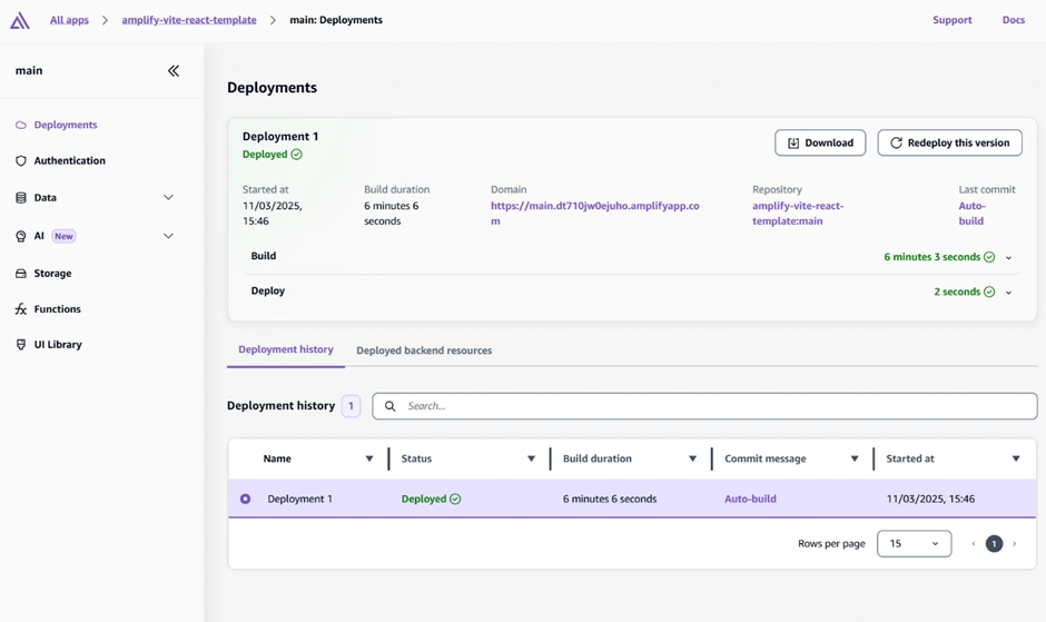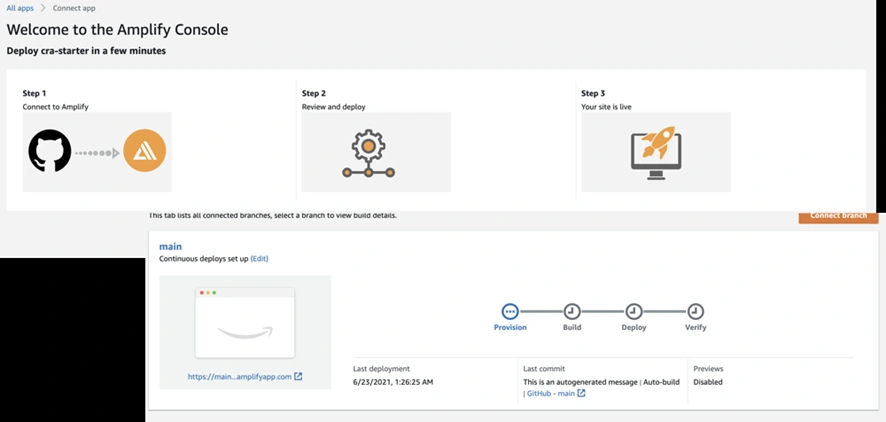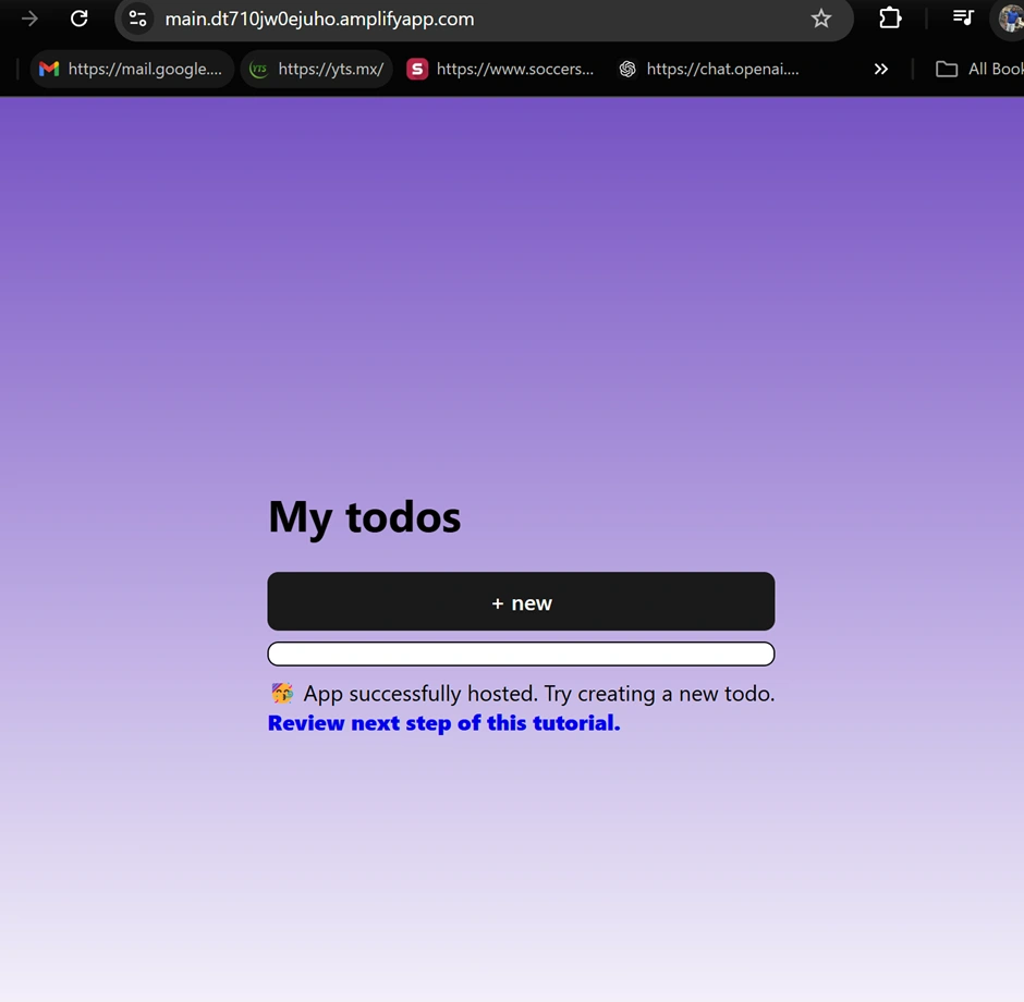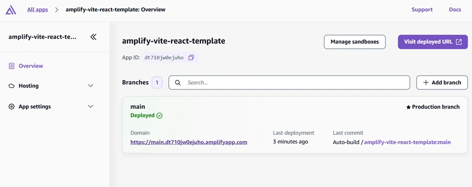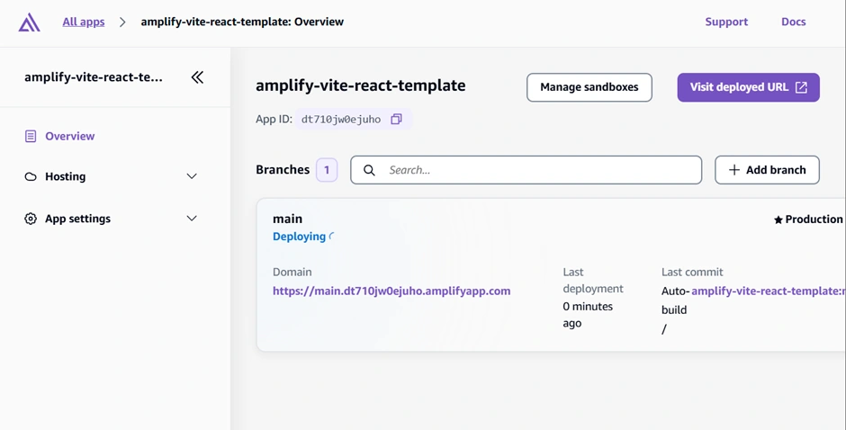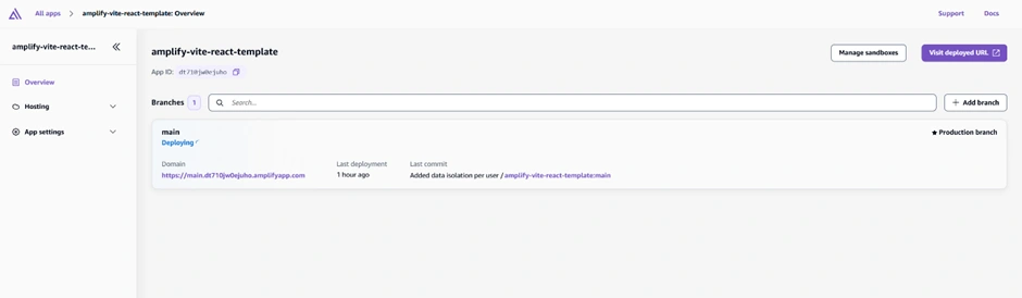 https://main.branchid.amplifyapp.com (Amplify provides a default domain). You can click “Visit deployed URL” to see the live app. It should load a basic to-do app interface (with a prompt to sign in, since auth is enabled). At this point, the app’s backend (API, database, auth) is up in the cloud, and the front-end is hosted. 🎉
