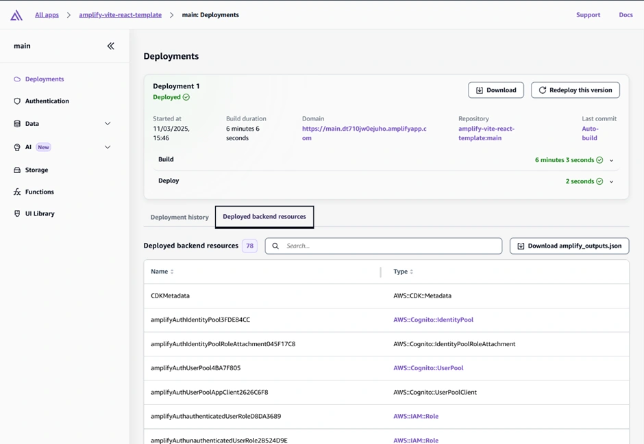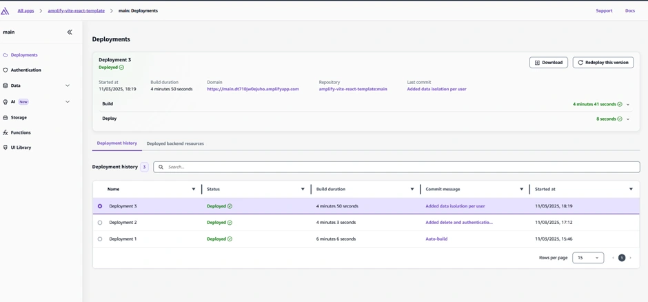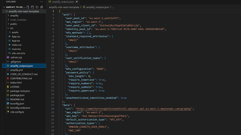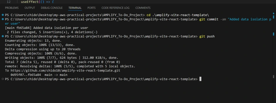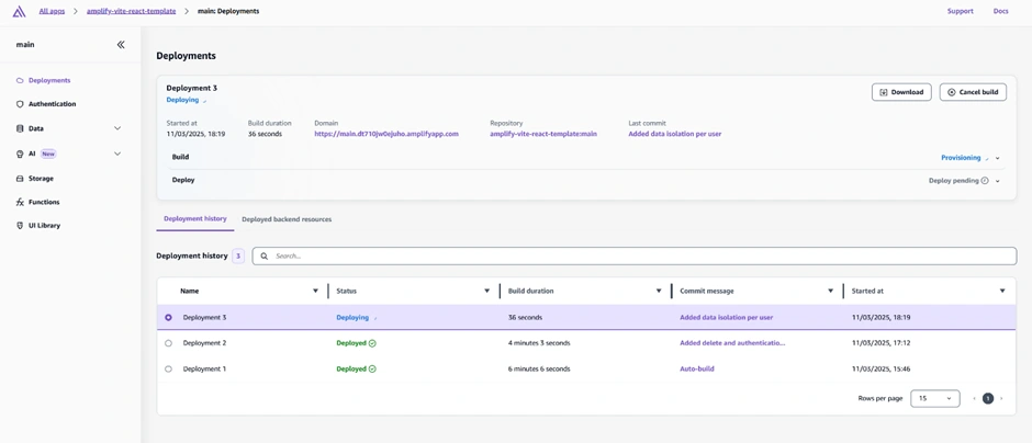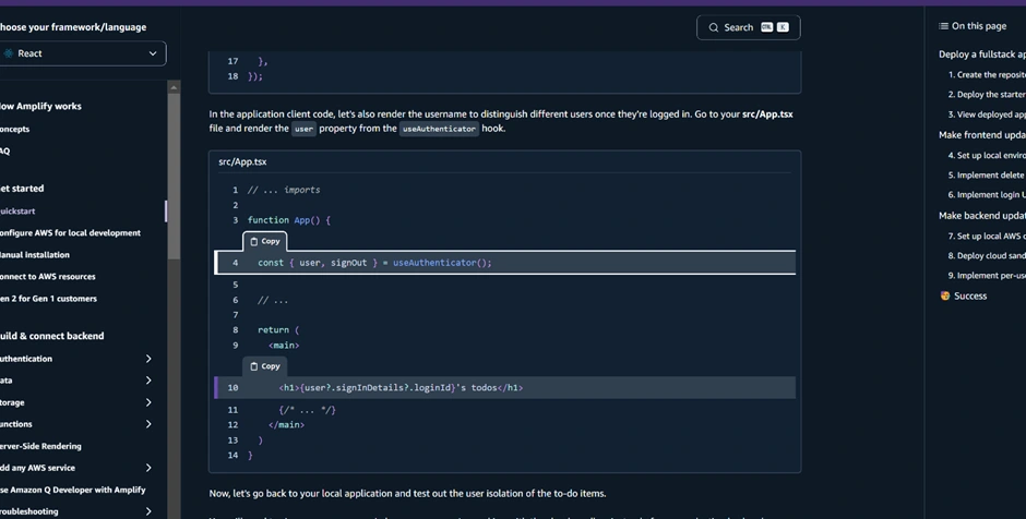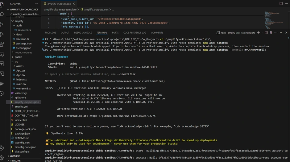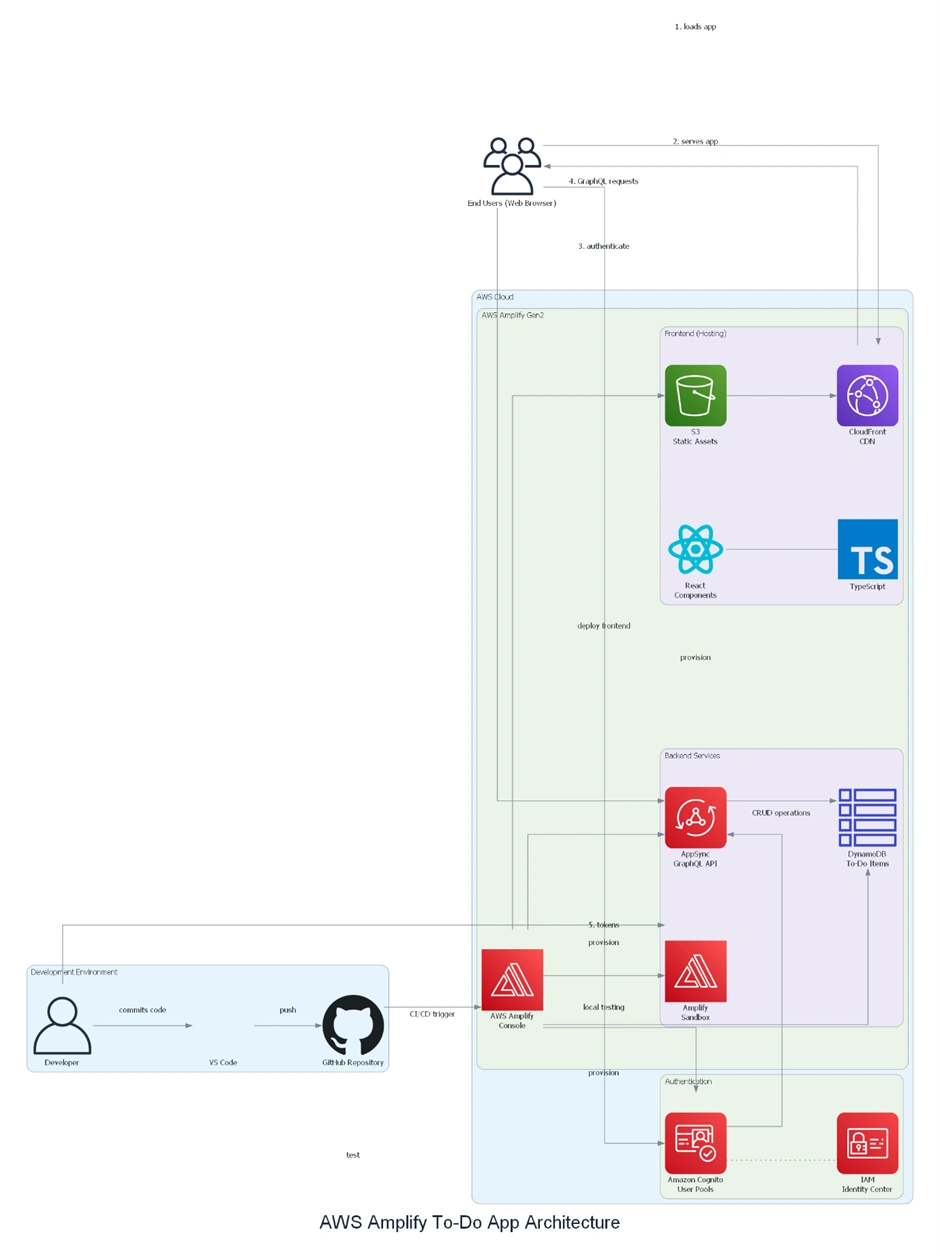 index.css to adjust styles. For example, you might style the <h1> (title), the list items, and the new-task button to make the app look nice.Amplify.configure(outputs) call ties your app to the backend. The amplify_outputs.json file includes things like the GraphQL endpoint URL, the region, and the unique IDs of the resources. Amplify’s JS library uses this to know where to send API requests and how to talk to your Auth service. Always ensure you have the latest amplify_outputs.json when working in development, especially if you made changes to the backend.aws-amplify JS) stores the user’s credentials (JWT tokens) in memory. It will automatically attach these credentials to requests to authorized APIs. For example, our GraphQL requests include the user’s token, so the backend knows the identity (these ties into the owner-based auth rule we set, so it knows which user is owner).client.models.Todo helpers (as seen with .list(), .create(), etc.). Under the hood, these make GraphQL calls to AWS AppSync. The responses come back as JavaScript objects (Todo items) that our app can use directly. Real-time updates use WebSocket connections managed by Amplify; when a new Todo is created or deleted, the AppSync API broadcasts and the Amplify library invokes our subscription callback to update state.client.models.Todo) and Amplify handles the rest. This is a huge productivity boost for full-stack development.amplify push if backend changes, etc.), and then deploy the new version to the live site. This CI/CD workflow means you don’t manually FTP files or run deployment scripts – Amplify handles it.amplify/ directory) – e.g., add a new model or function – those changes will also get deployed when you push. Amplify uses a concept of Cloud Sandbox for safe development: you can test backend changes in an ephemeral environment (ampx sandbox) and then merge them. When you commit these changes, Amplify will update the cloud resources accordingly. Always commit the Amplify changes along with your frontend so that the backend and frontend stay in sync.git push to push our latest code to GitHub and then trigger the CI/CD automatically to our Amplify too.