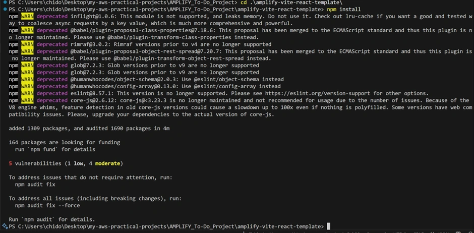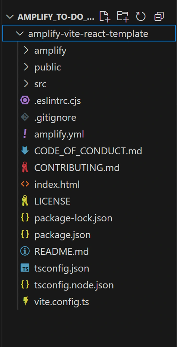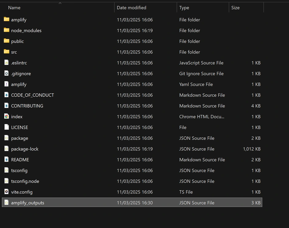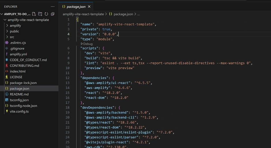 amplify/ directory contains your backend “stack” defined in TypeScript – you can add to this to create new backend resources. The src/ is your React application. Amplify Gen 2 projects keep frontend and backend code together for a cohesive full stack project.npx create-react-app or Vite) and then add Amplify to it. This involves installing Amplify libraries (npm install @aws-amplify/backend@latest @aws-amplify/backend-cli@latest) and running npm create amplify@latest to scaffold the amplify/ folder. Then you’d define your data model in code and deploy. This approach gives more insight into each step, but for beginners the starter template (Option A) is simpler, as it gives you a working app to start with. In this guide, we followed the template approach, since it quickly gets us to a point where the app is running, and we can focus on features.package.json file lists all the dependencies required for the project.