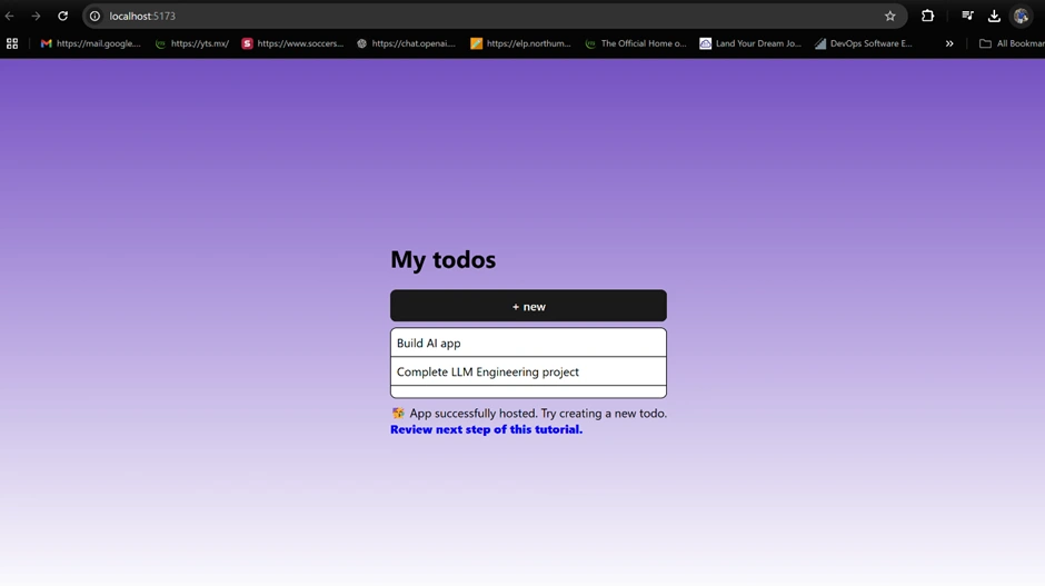 npm install (if you haven’t done so already as described) and npm start (or npm run dev for Vite as in our case). Your app will compile and open at http://localhost:3000 or http://localhost:5173 (for Vite). You should see the to-do UI.