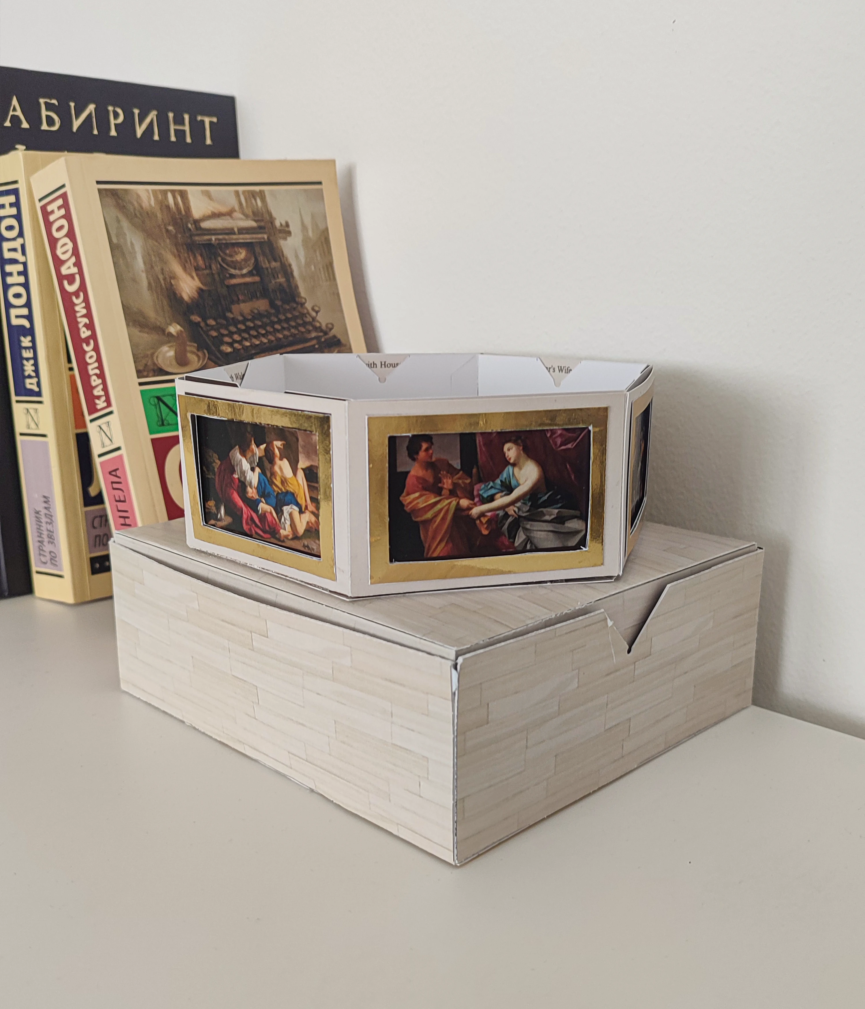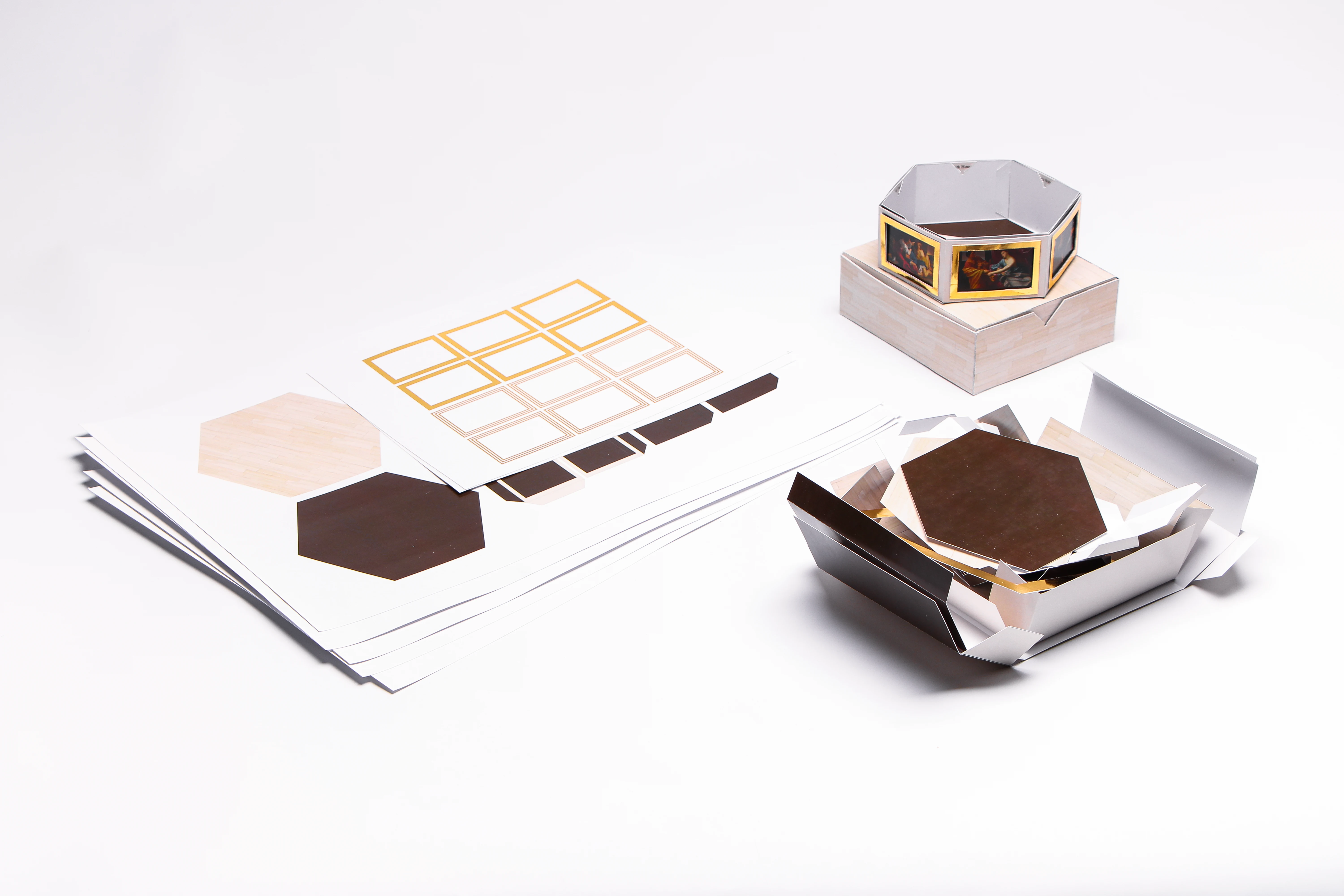 A small box with assembly instructions turns into a table gallery where the user can change the pictures at his discretion within the frame. By collecting this product you can expand your collection of paintings.