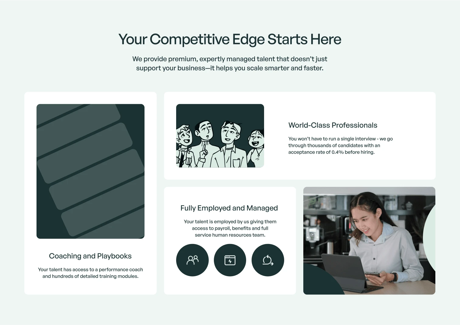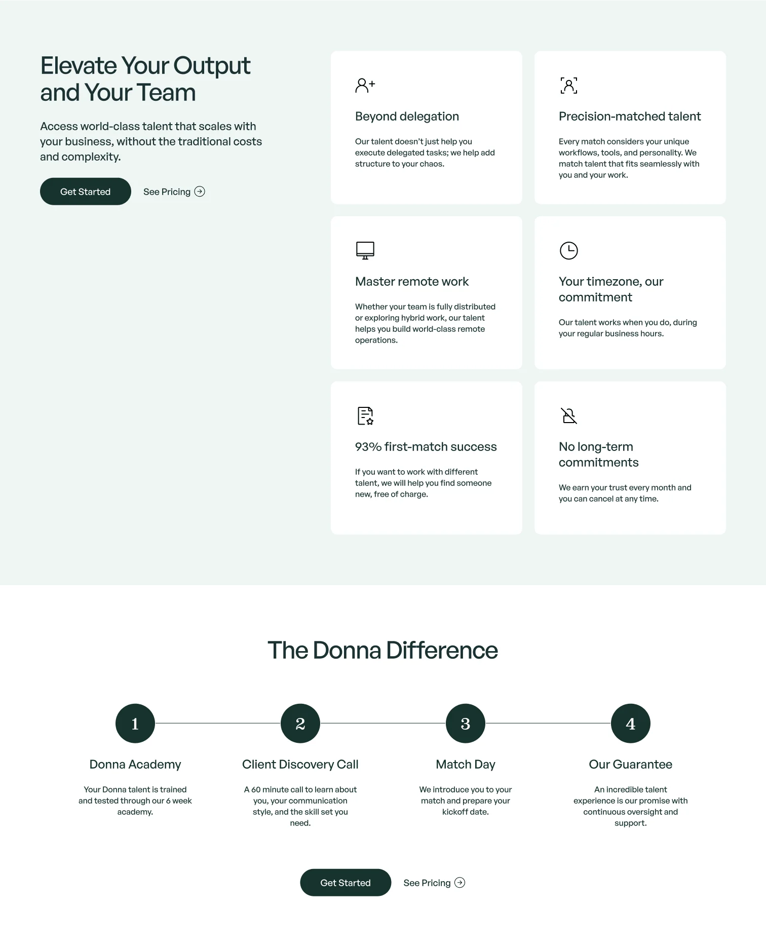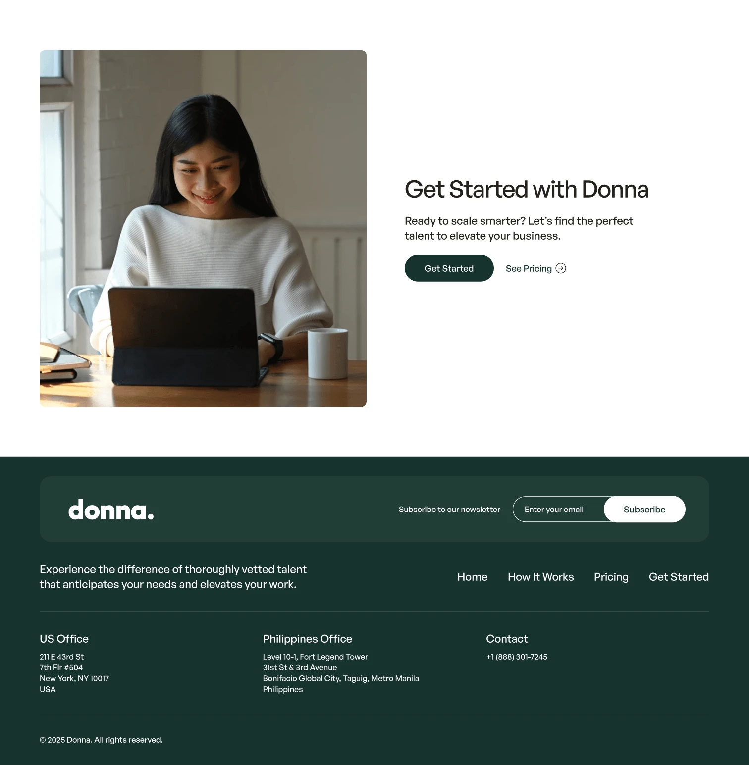 I took on the task of redesigning Hire Donna's newly launched website based on a Webflow template and elevated it to match their branding.