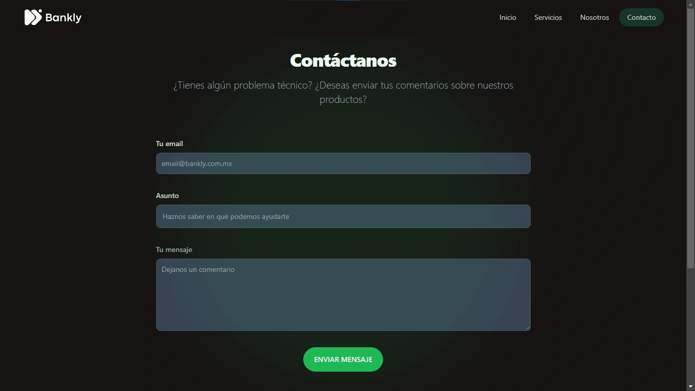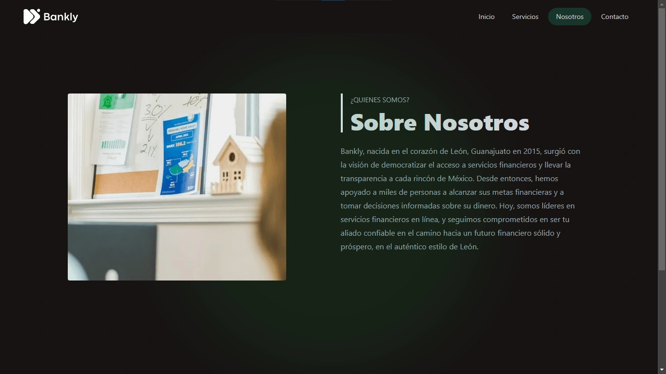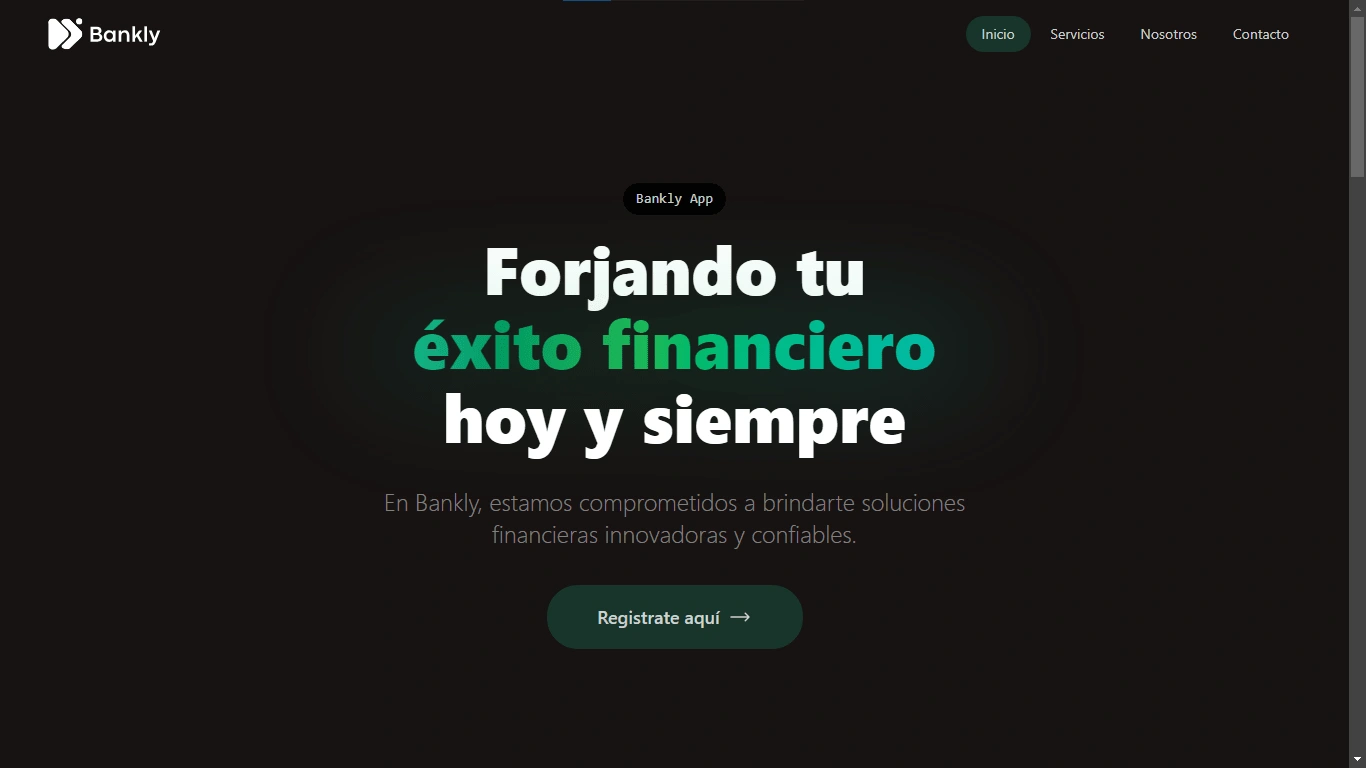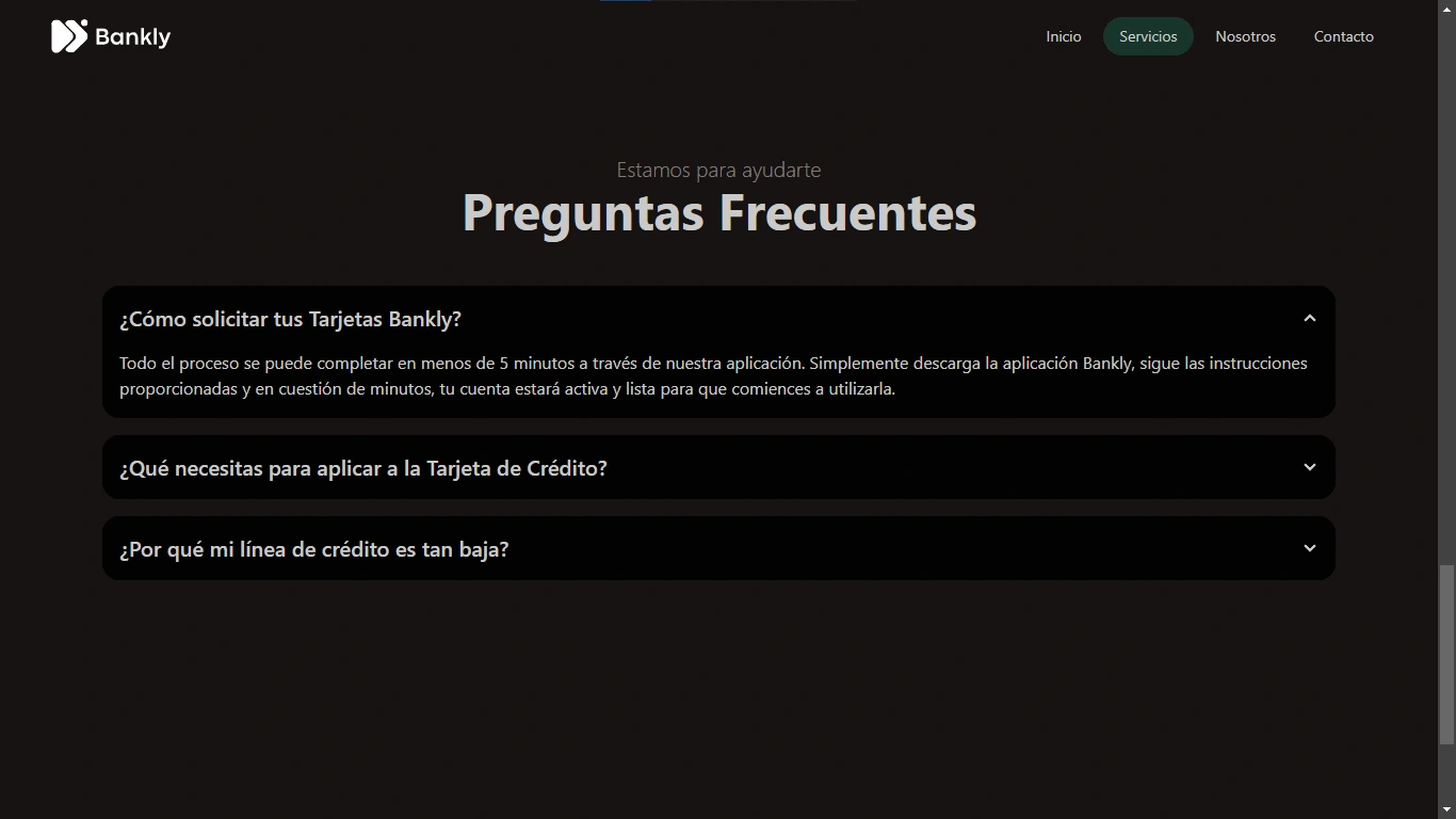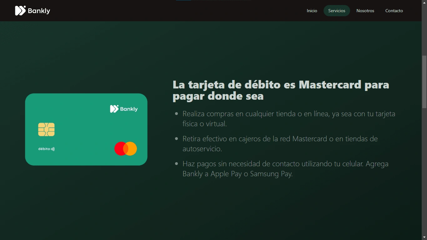 Bankly App is an online platform designed to provide financial services to university students through credit and debit cards. This initiative is backed by a Popular Financial Society (SOFIPO) called Bankly, focusing on delivering financial solutions tailored to the needs of the student community. (I must emphasize that this is an academic project, a static website at the moment).
