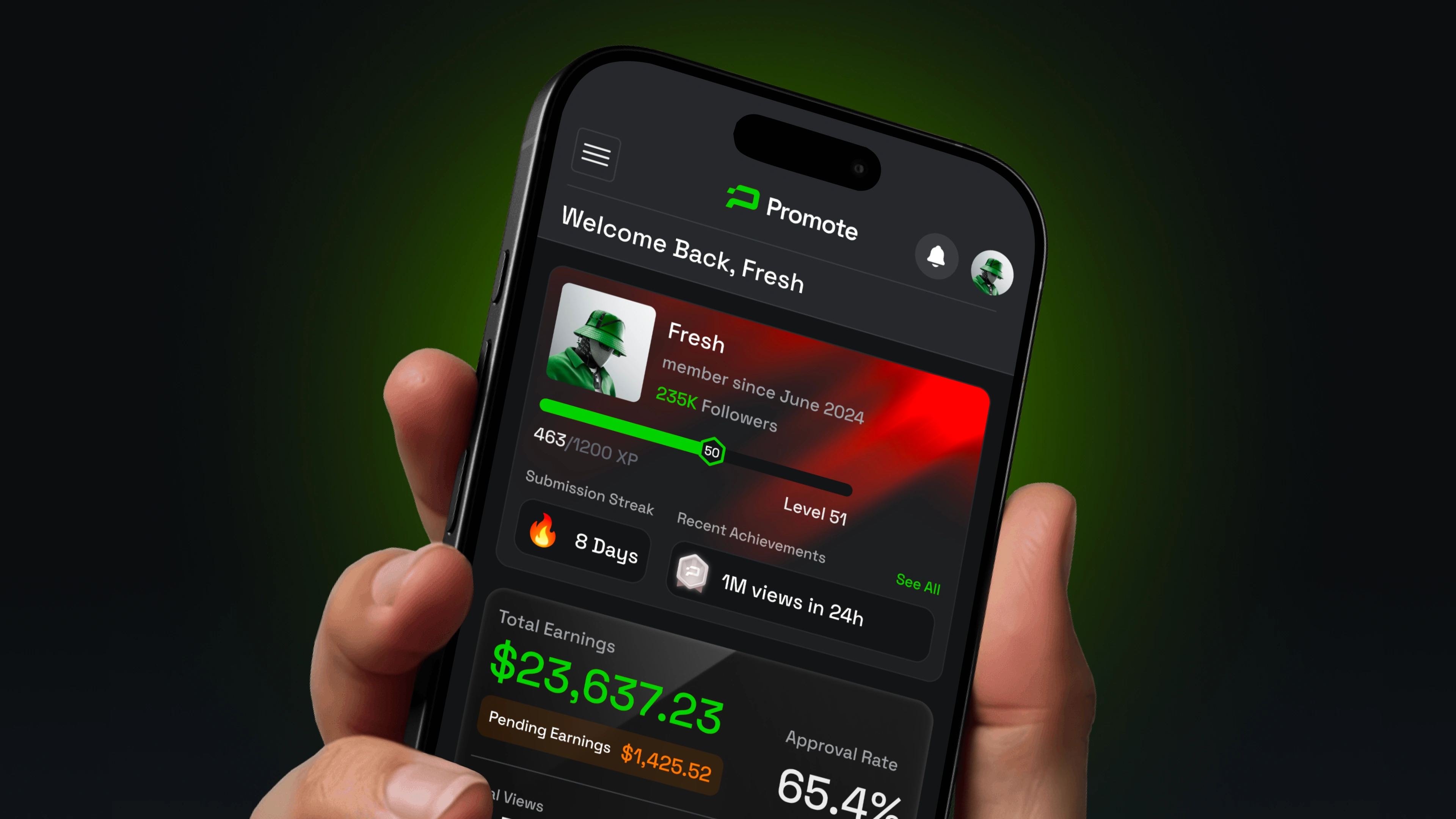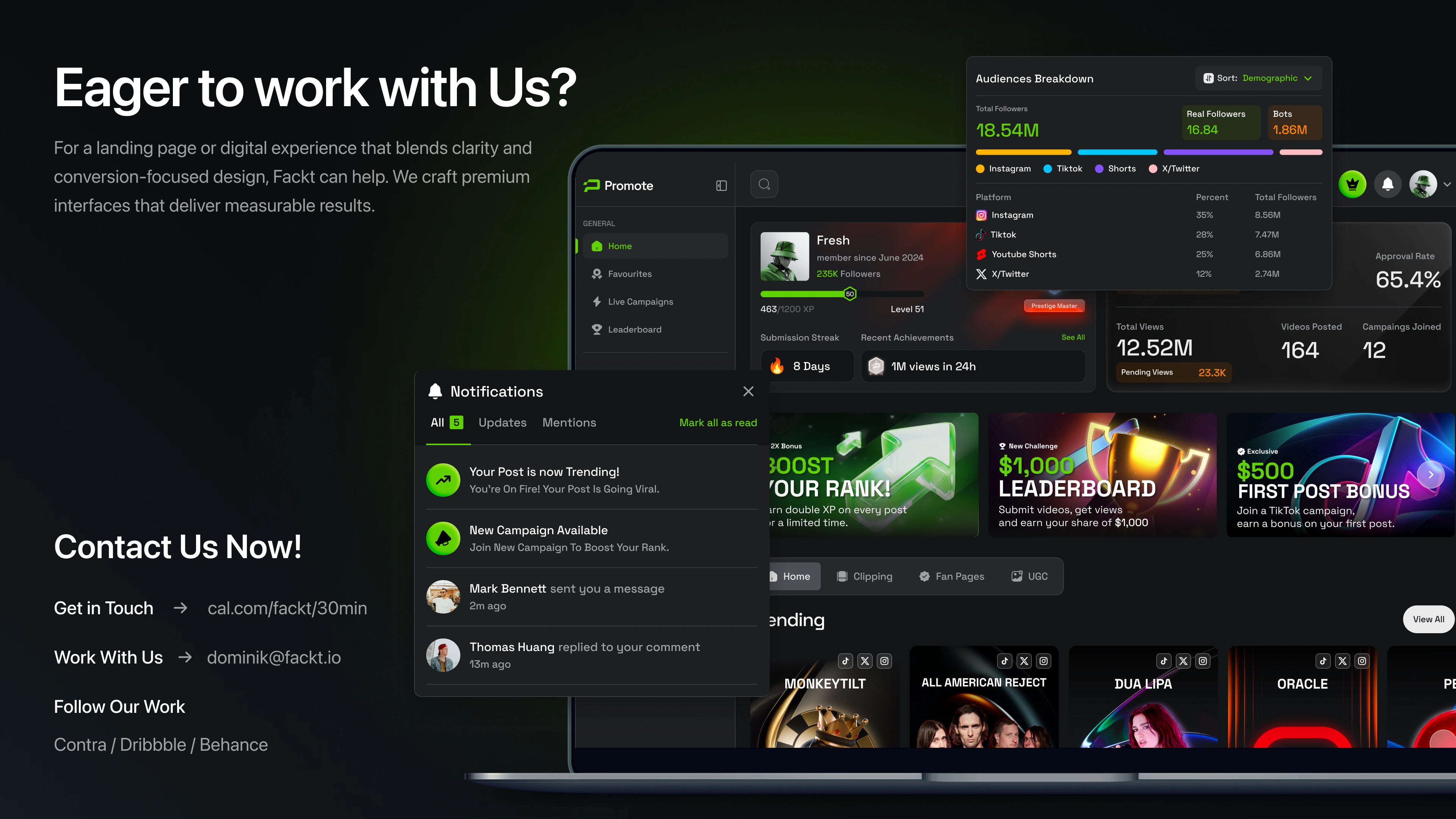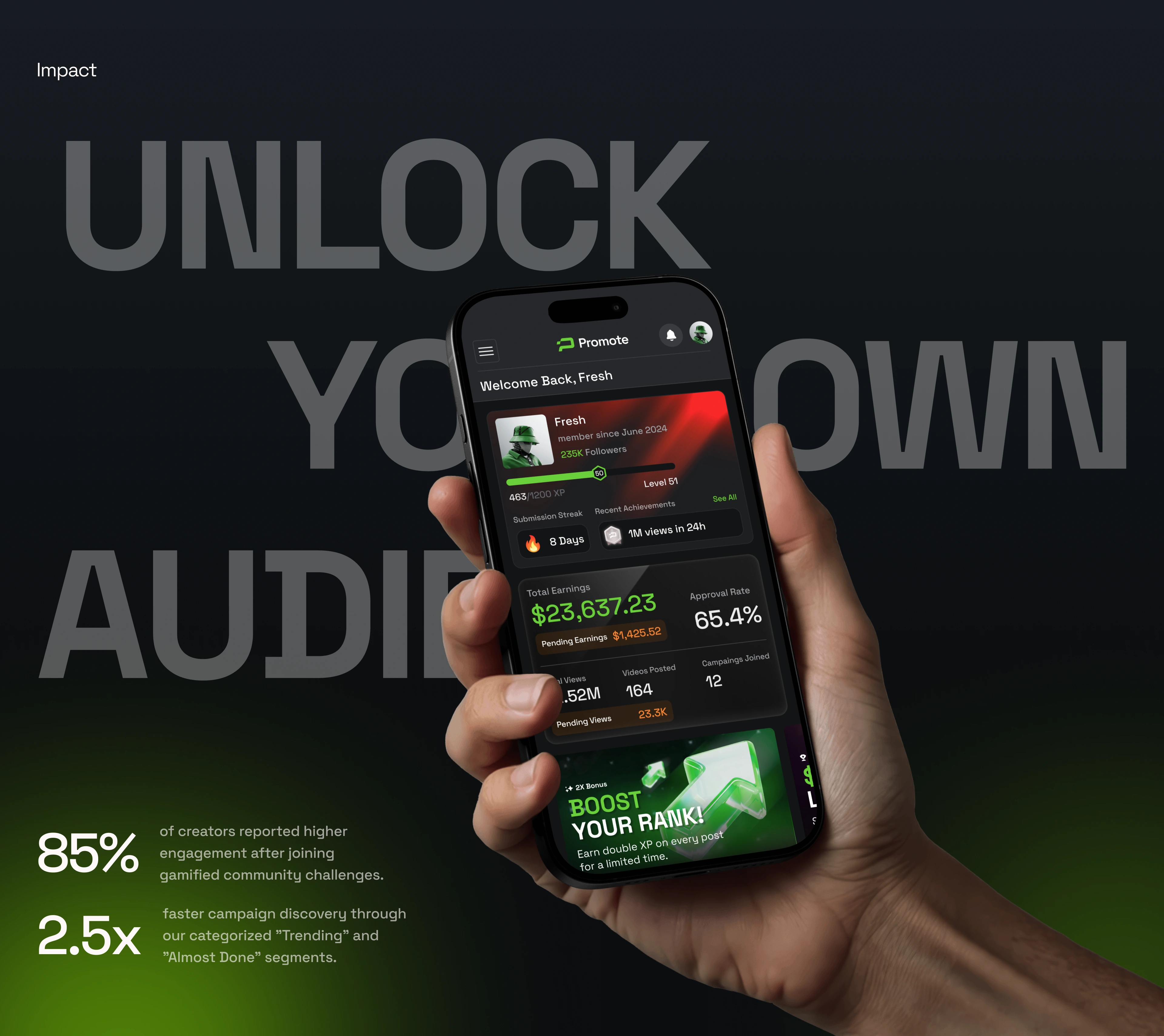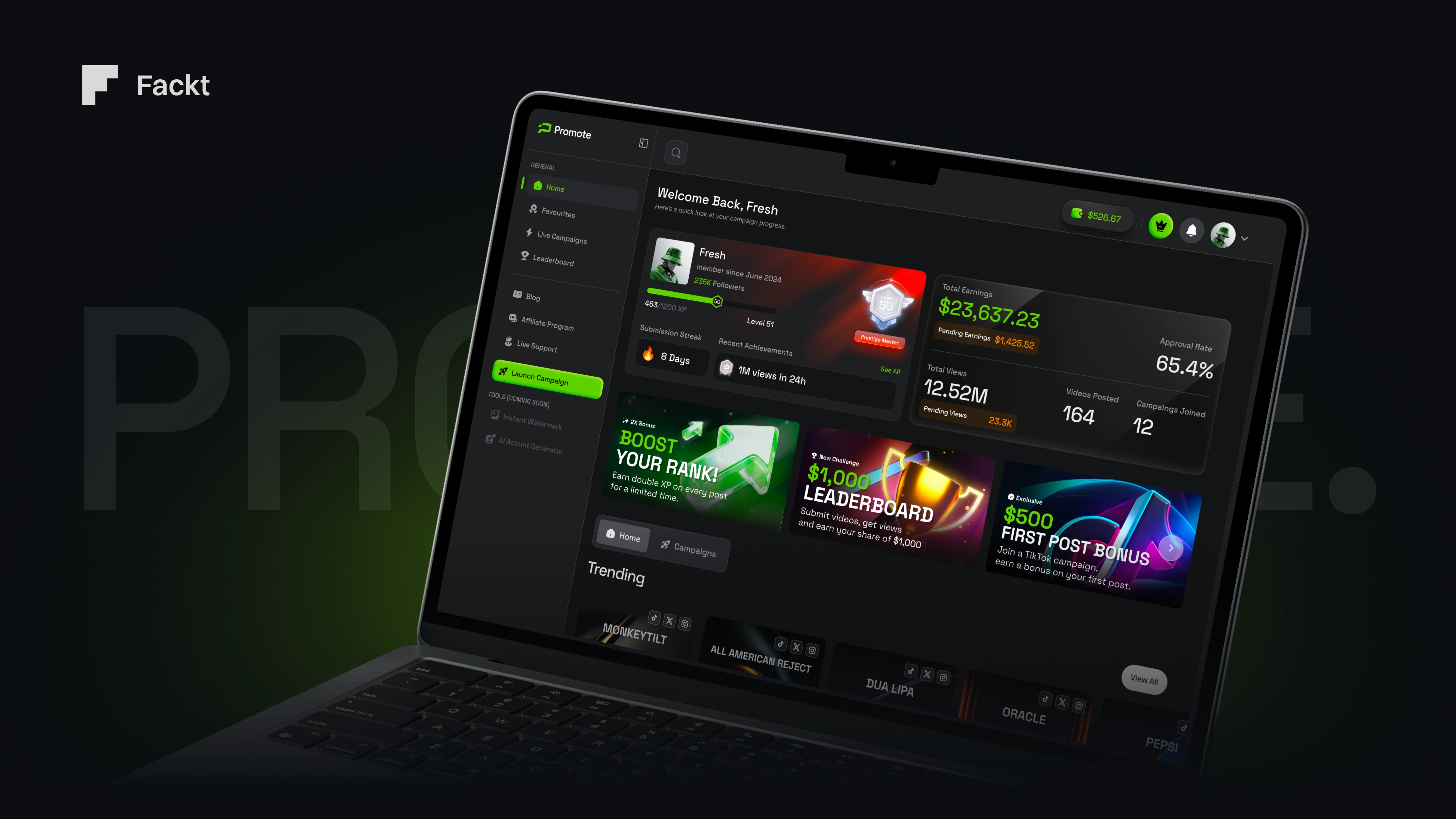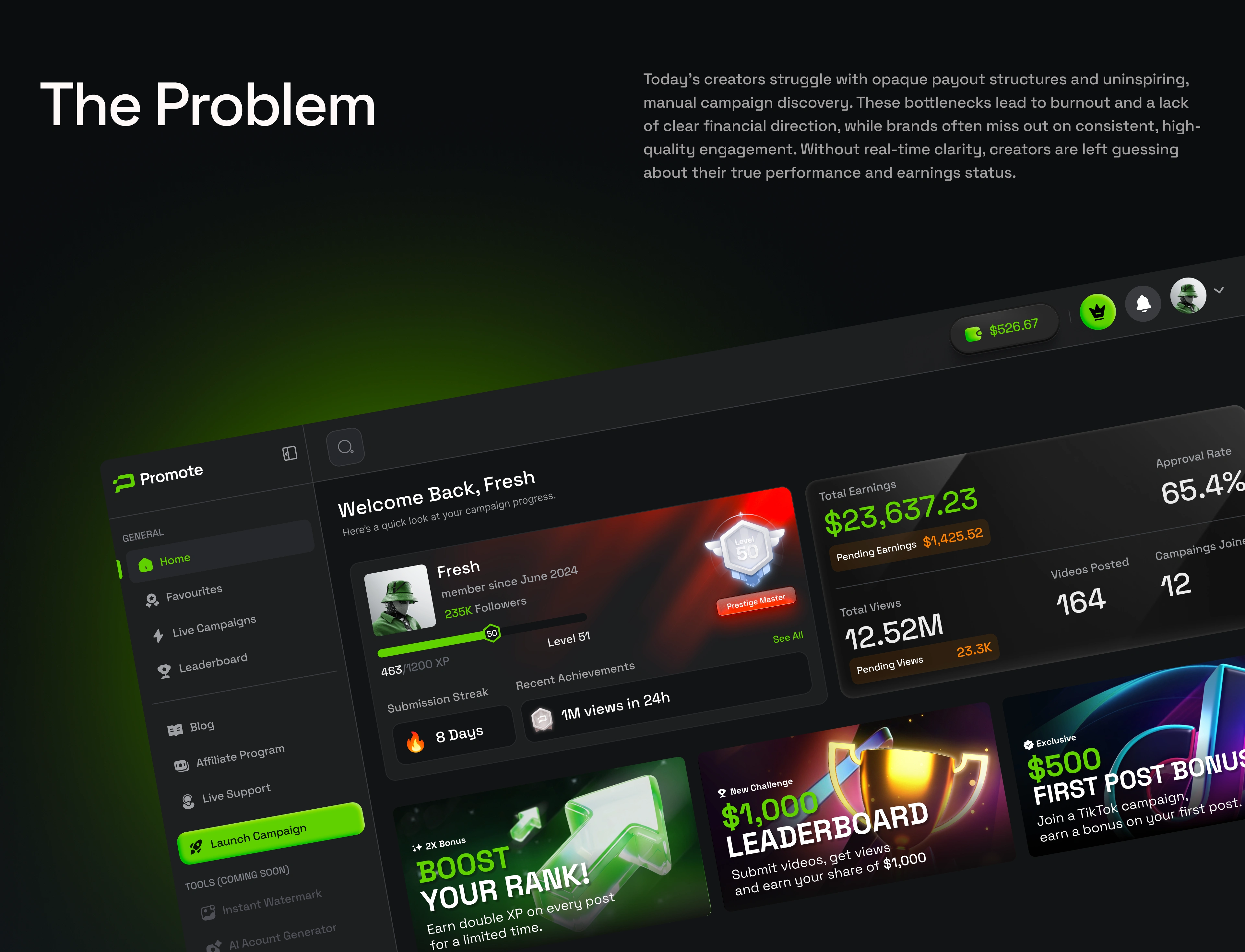 The process started with product strategy and information architecture, defining how different user roles interact with the platform and what information needed to be front and center at every stage. From there, we developed a high-contrast dark UI system with a signature neon green accent palette and Space Grotesk as the typographic foundation — chosen for its geometric precision across both display headlines and dense data layouts. Components were designed as a unified system, ensuring consistency held across dashboards, leaderboards, profile views, and mobile breakpoints.