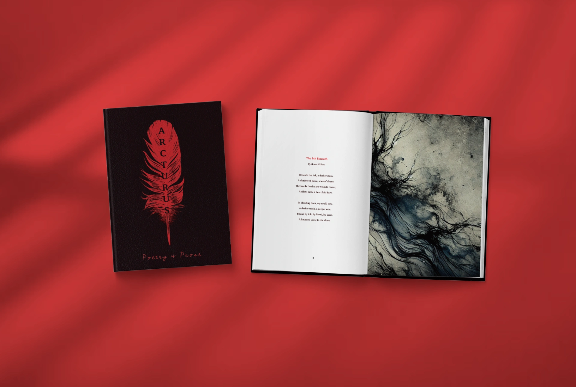 For this unique edition of my college's annual poetry and prose book, themed Bloodletter, I crafted a design that delves into the dark and haunting nature of self-expression. Inspired by the idea of "writing with blood," the visuals are bold, intense, and evocative, capturing the rawness and depth of each literary piece within. Each page incorporates a blend of deep reds, blacks, and rough textures, reflecting a gothic yet modern aesthetic that ties into the overall theme.