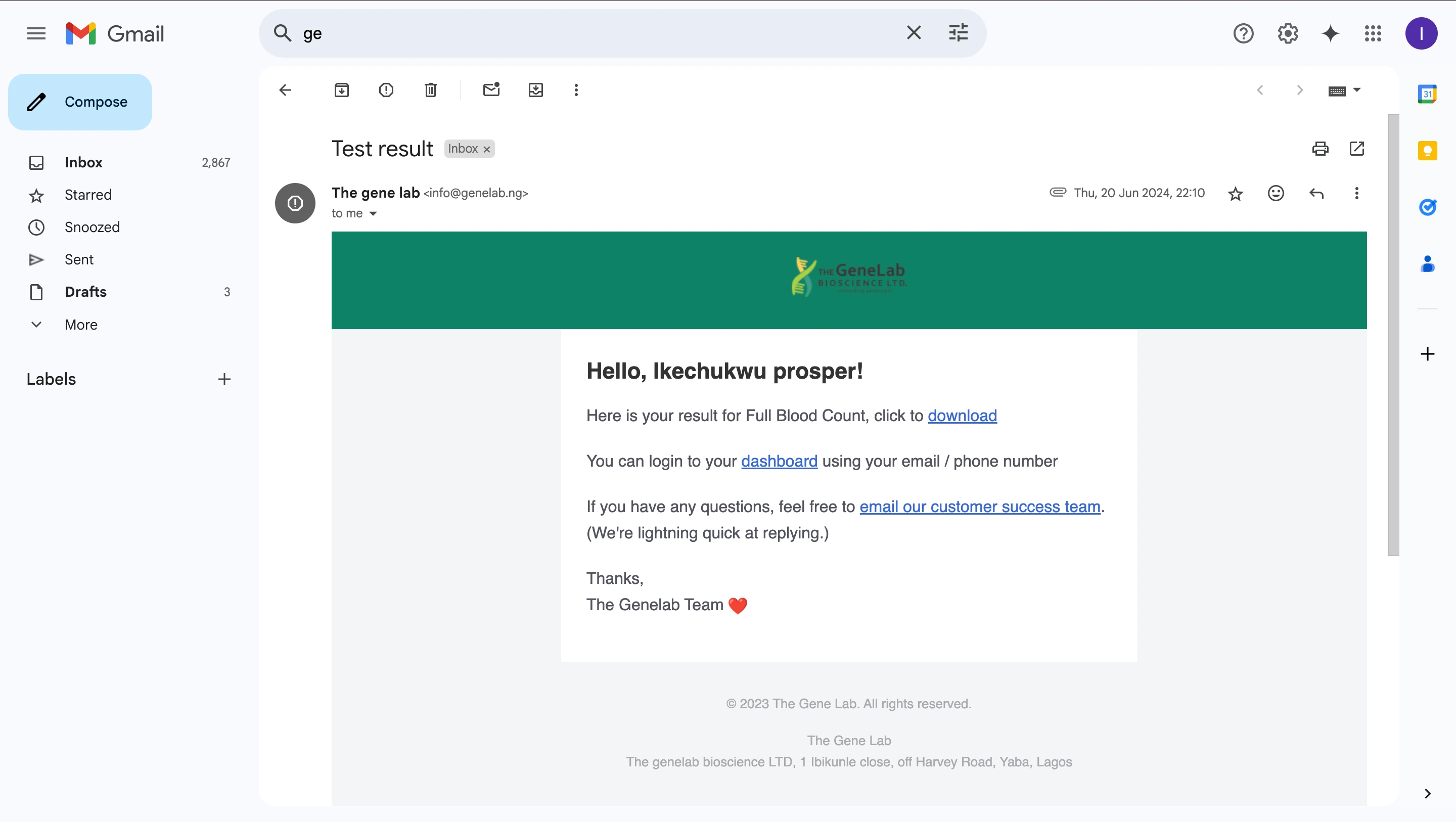 GeneLab Bioscience Limited is a biotechnology and global health equity firm born from expert collaborations in academia, research, and industry. They provide services and support in life science laboratory setup, molecular diagnostics, cancer research, sequencing, bioinformatics, and biologics production. They also make laboratory investigations easier for patients by going to their location to collect samples under strict quality control and sending results via email; this significantly reduces the stress of going to the lab for a lab test and coming back for the result.