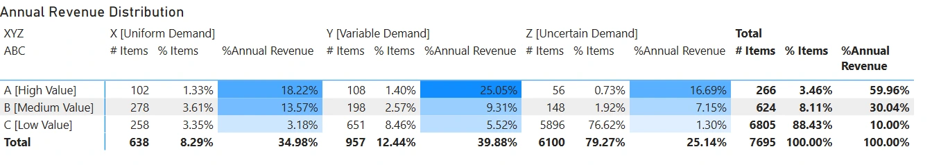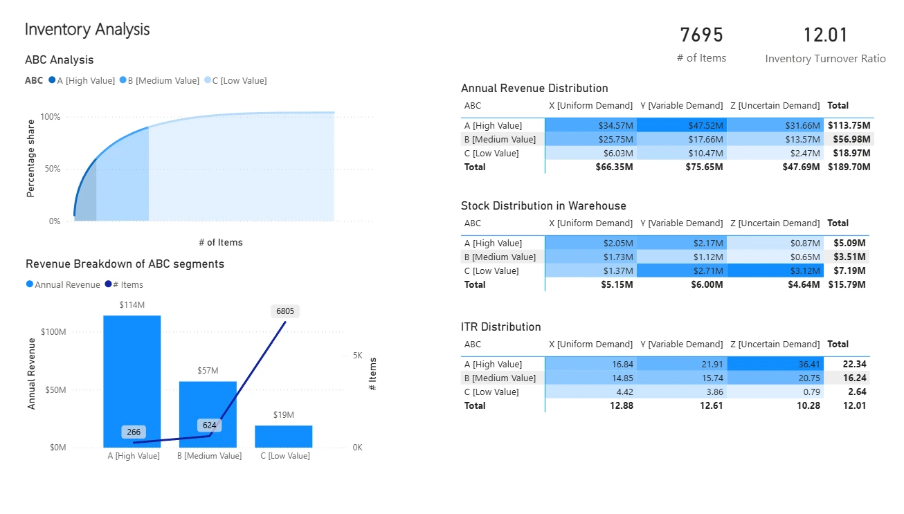 Warehouse managers used the report to monitor stock levels and manage inventory across ABC-XYZ segments effectively.