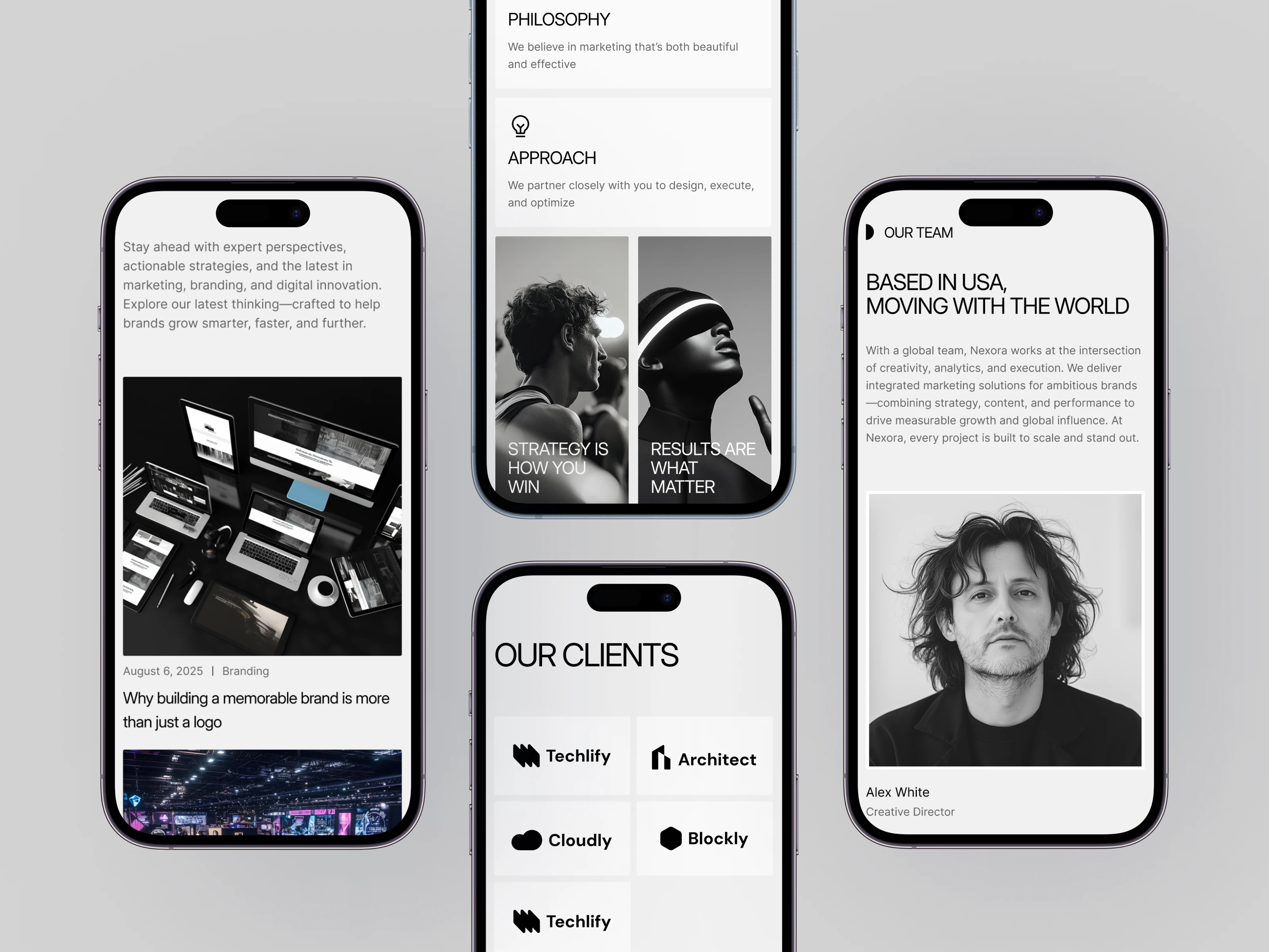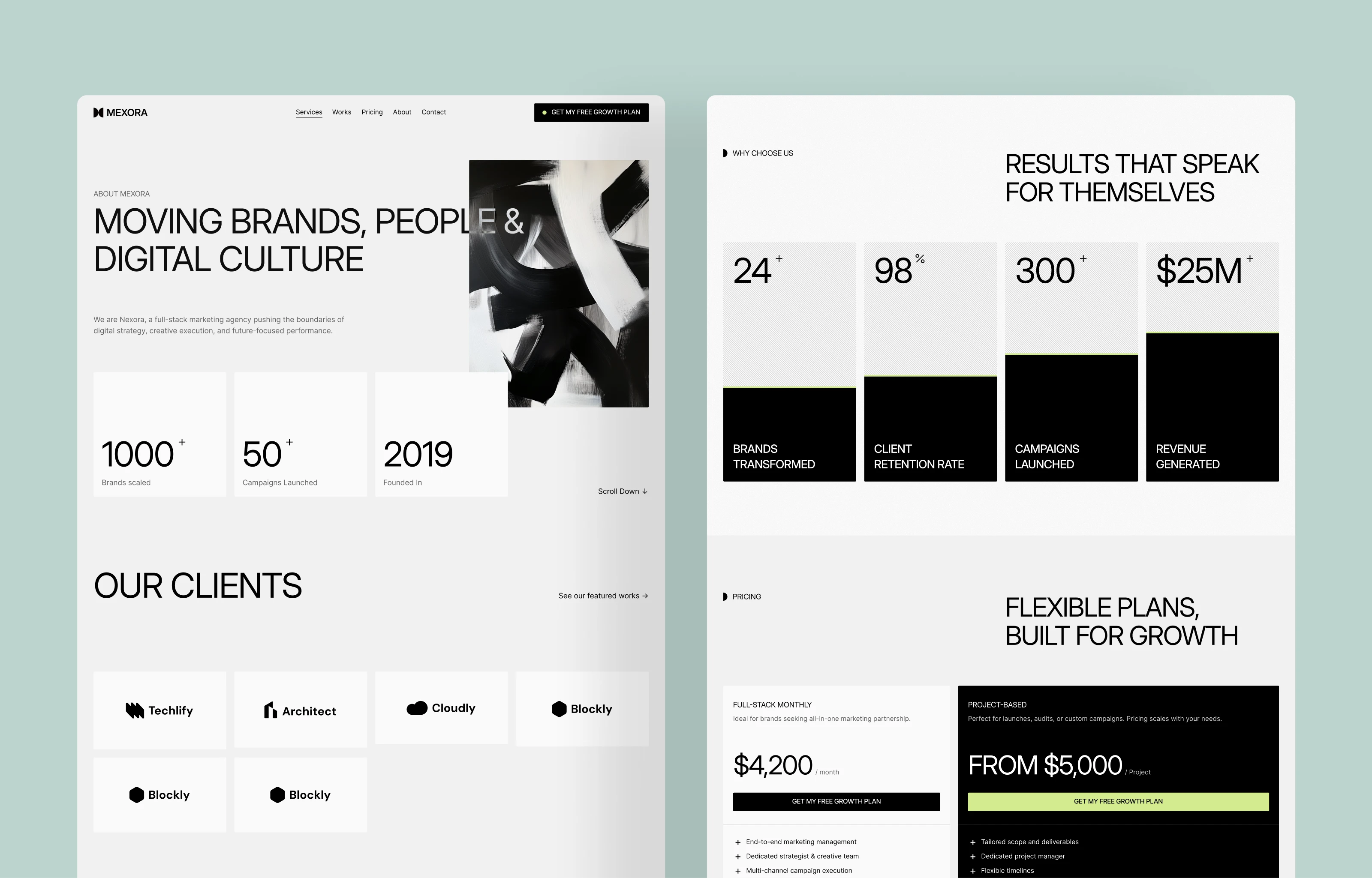 For Mexora, we intentionally designed the experience to guide visitors through a clear narrative — from understanding the agency’s positioning, to exploring services, reviewing proof of expertise, and finally taking action. Every section exists for a reason and contributes to moving the user forward.