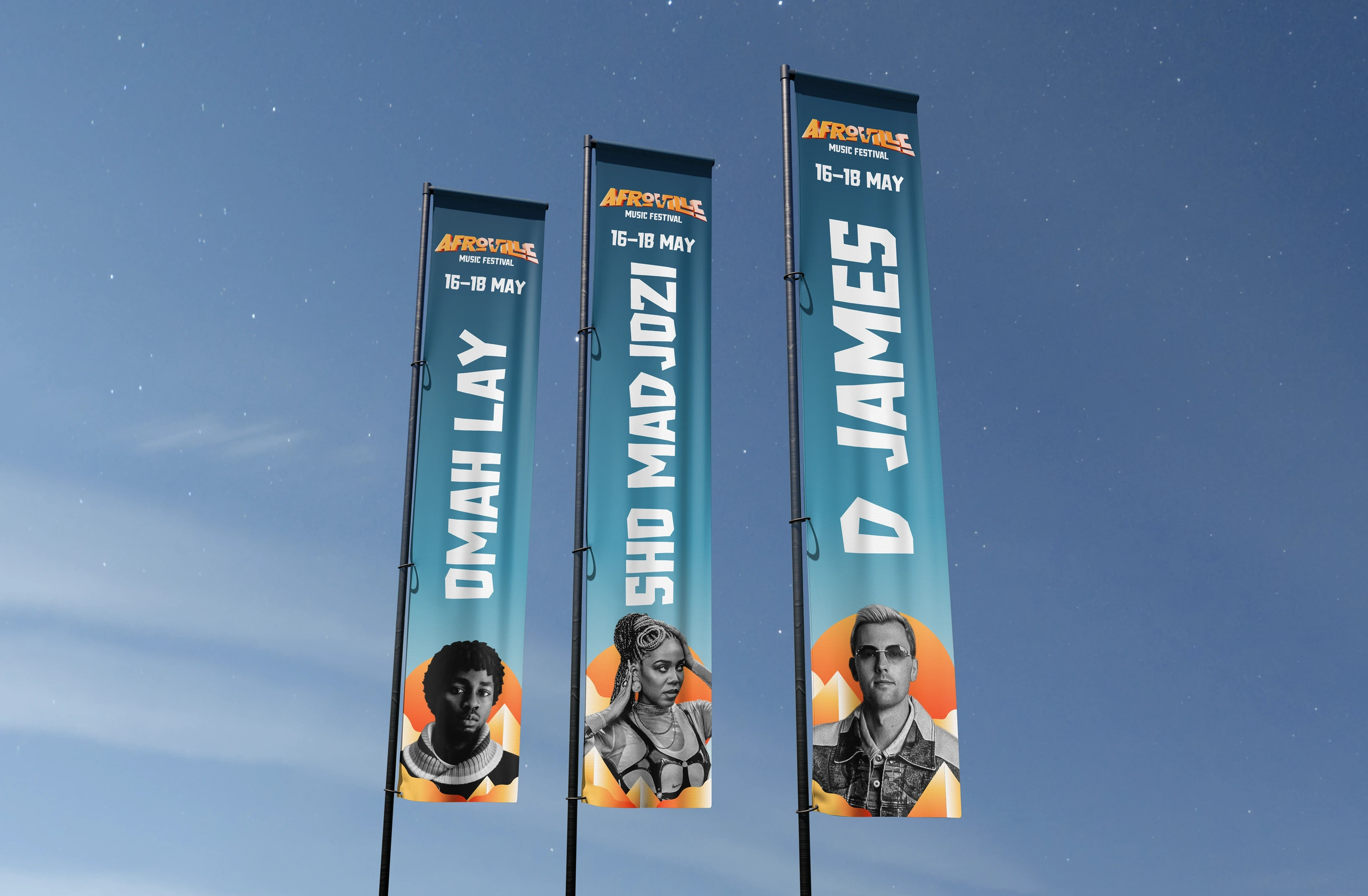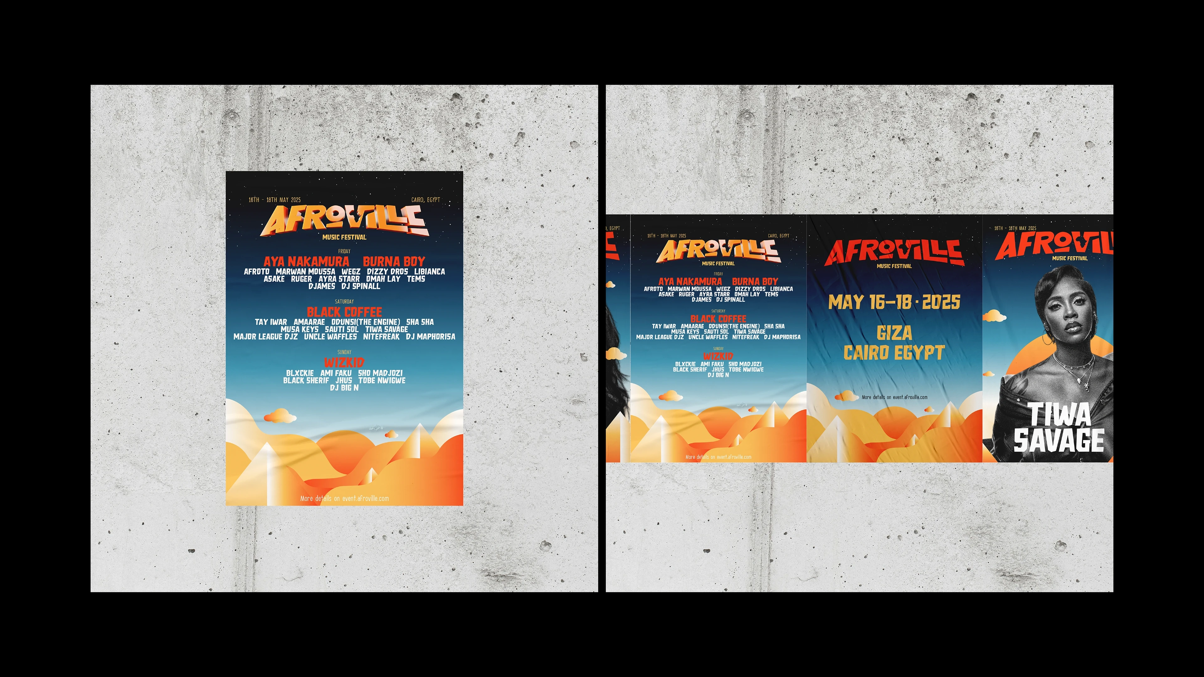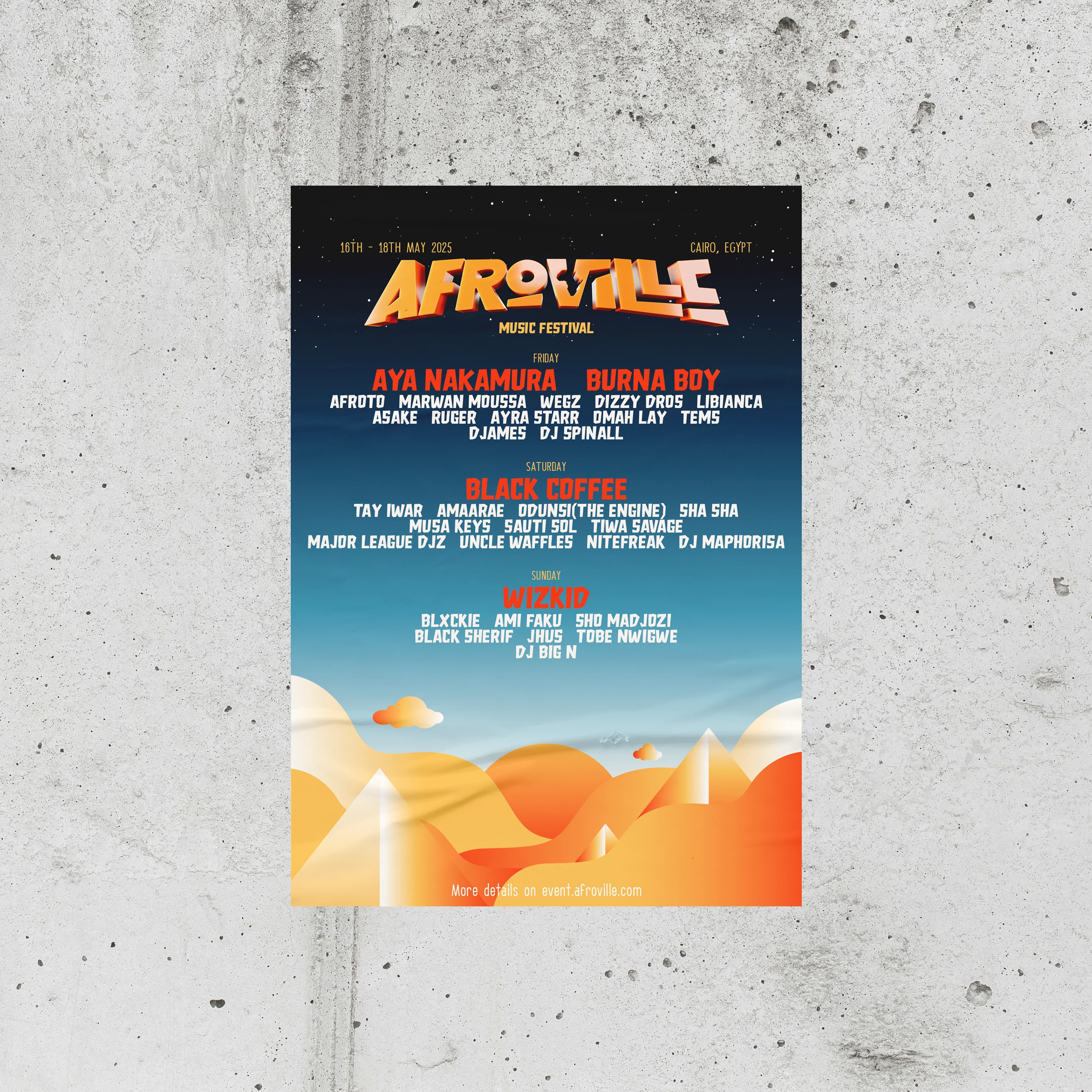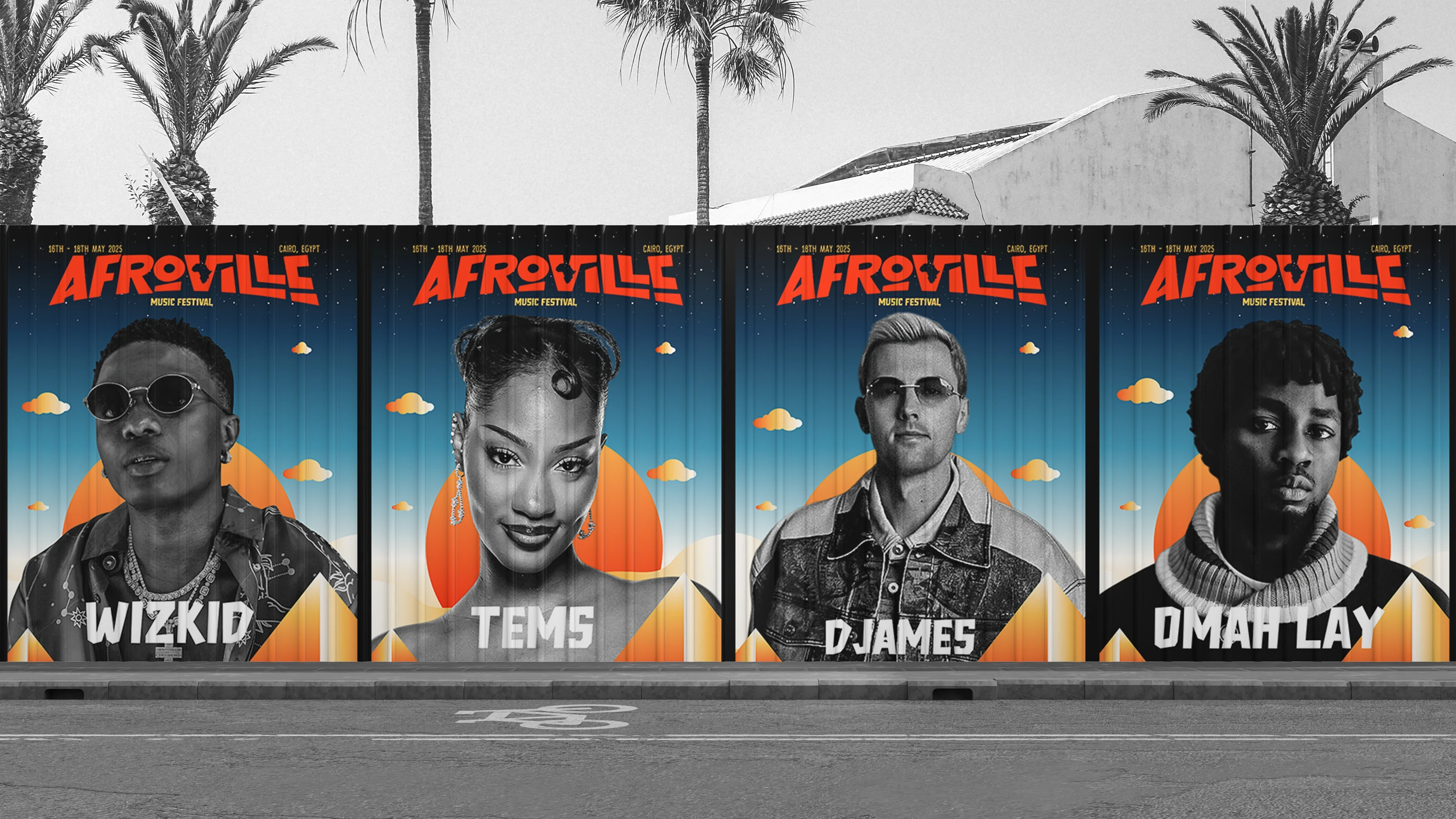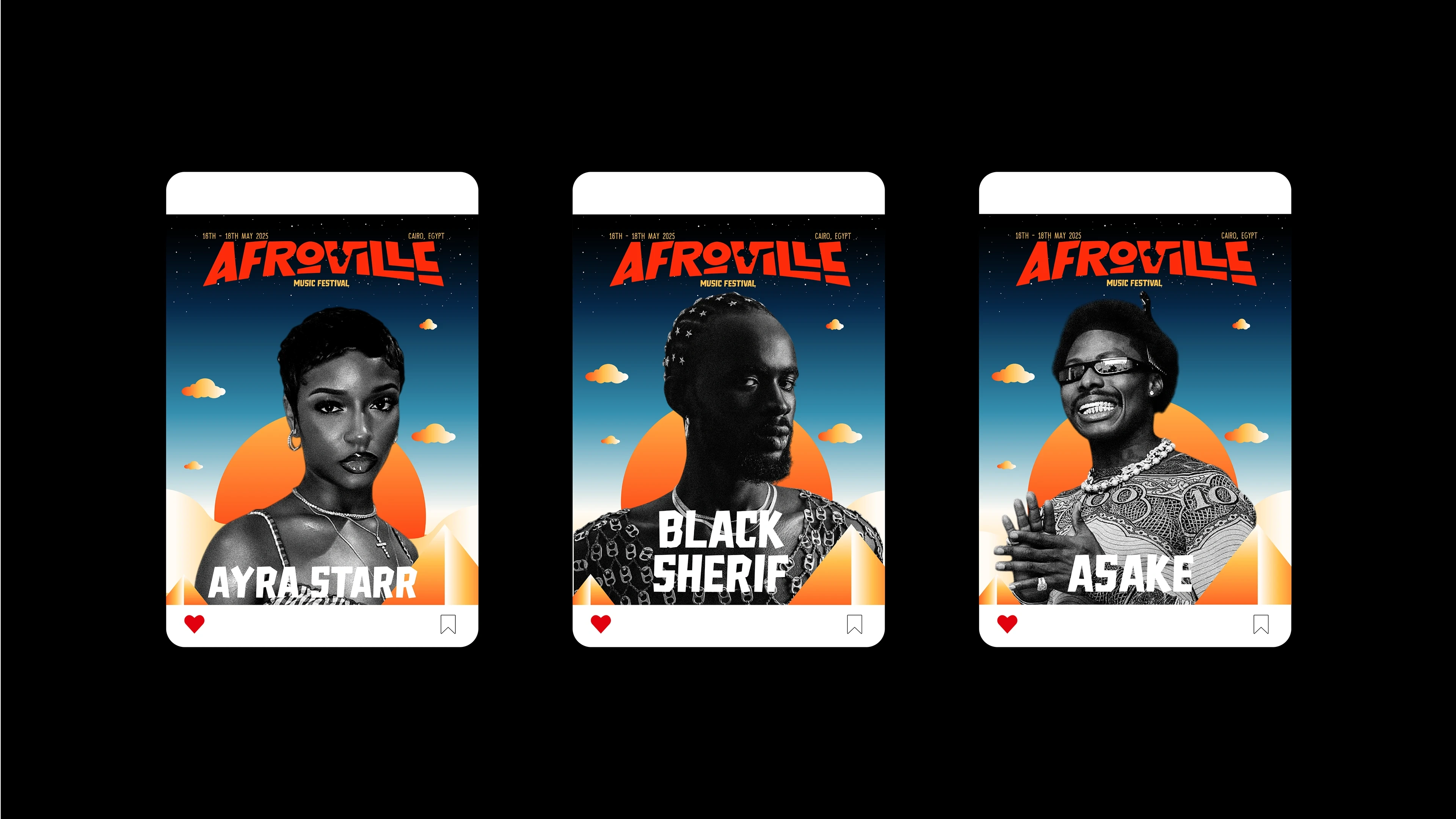 Blending afrobeat, afro house, amapiano, electronic, world, hip hop, and contemporary African sounds, this immersive experience brings together headlining artists from across the continent. Our visual identity project captures the essence of "AfroVille" by fusing ancient Egyptian pyramids, desert landscapes, and vibrant summer hues..