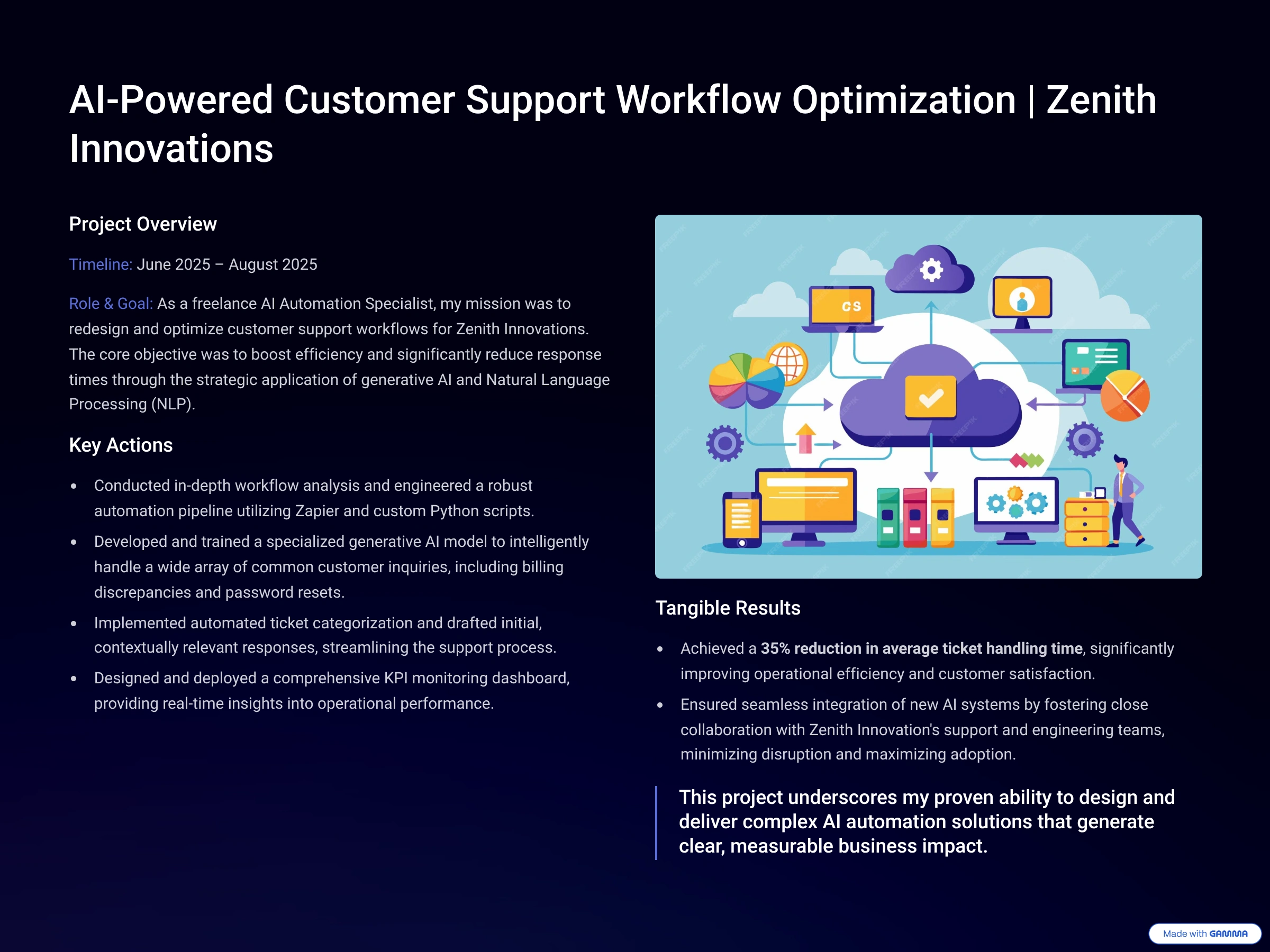 Redesigned and optimized Zenith Innovations’ customer support with generative AI and NLP, cutting response times and boosting efficiency.