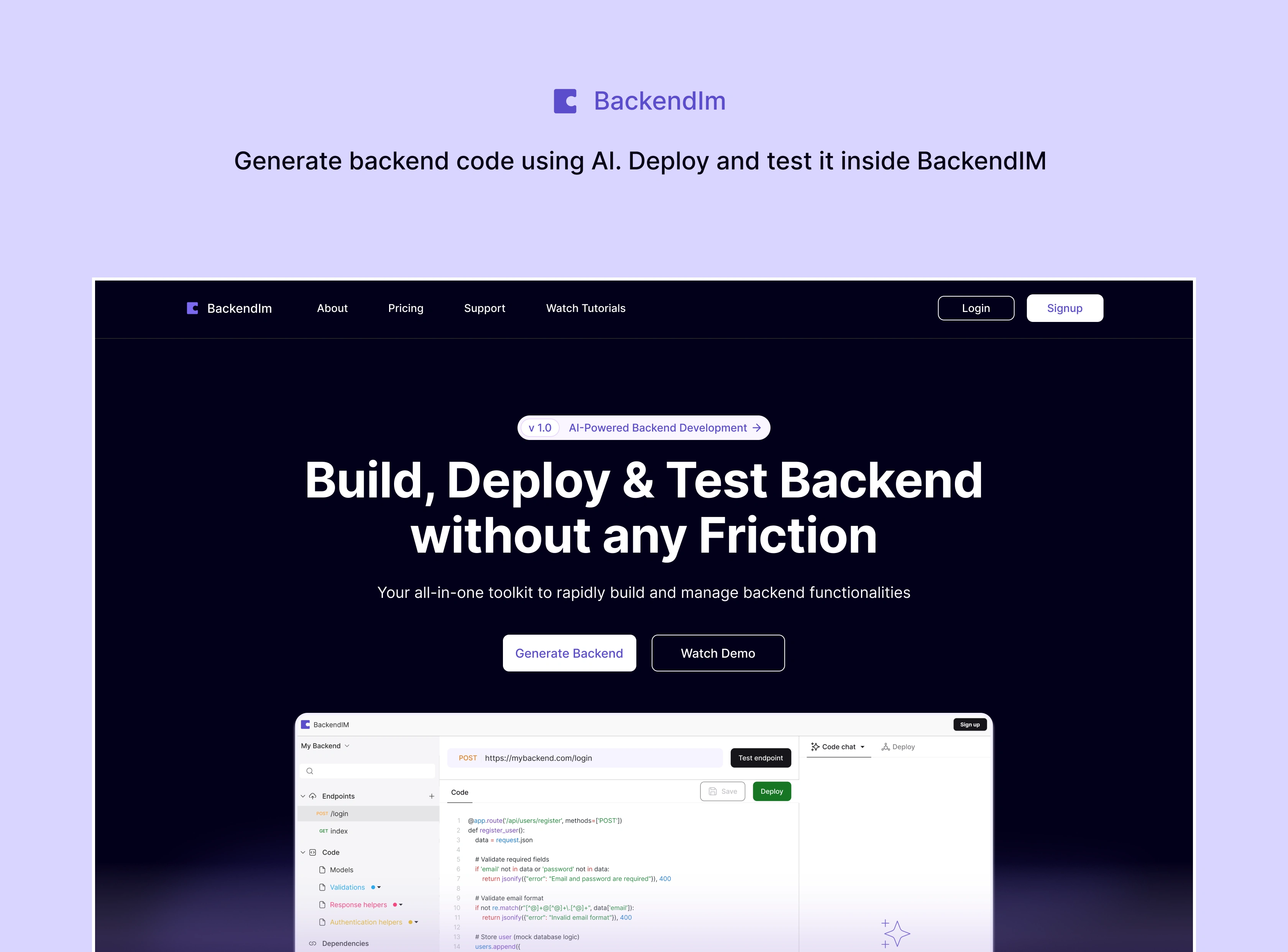 BackendIM is an all-in-one AI-powered backend development platform designed to take developers from prompt to production in a seamless workflow. With BackendIM, users can generate backend code using natural language prompts, deploy services instantly, and run real-time tests — all within a single, unified environment.