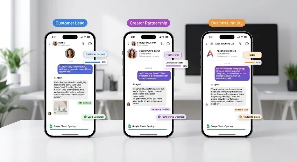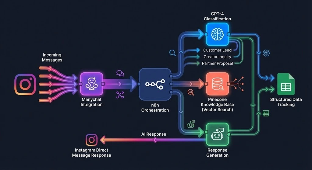 As an AI Agent Developer and Automation Specialist, I built an intelligent Instagram sales agent for ISOCLEAN that autonomously manages all incoming messages from leads, creators, and business partners. Using n8n automation, GPT-4 intelligence, and Pinecone vector memory, this AI agent classifies inquiries, provides accurate product information, and captures lead data—all in real-time through Instagram DMs. The system handles the complete customer journey from initial contact to qualified lead, automatically syncing data to Google Sheets for tracking while maintaining natural, helpful conversations through Manychat integration.