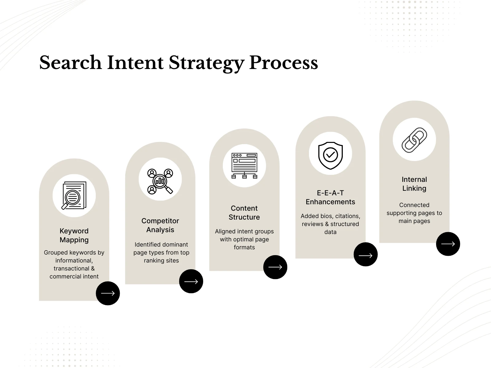 From there, I redesigned the content structure so that each intent group pointed to a suitable page format. For example, long tail informational queries led to in depth articles with FAQs and author bylines, while transactional terms were routed to optimized service pages with clear CTAs.