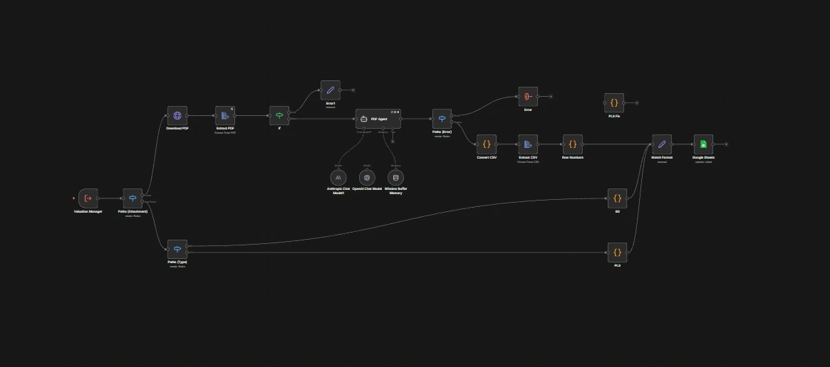 The workflow includes branching, error detection, retries, and fallback paths to handle inconsistent formats and partial failures. Extracted data is written to downstream systems such as Google Sheets, ensuring reliable results under real-world document variability.