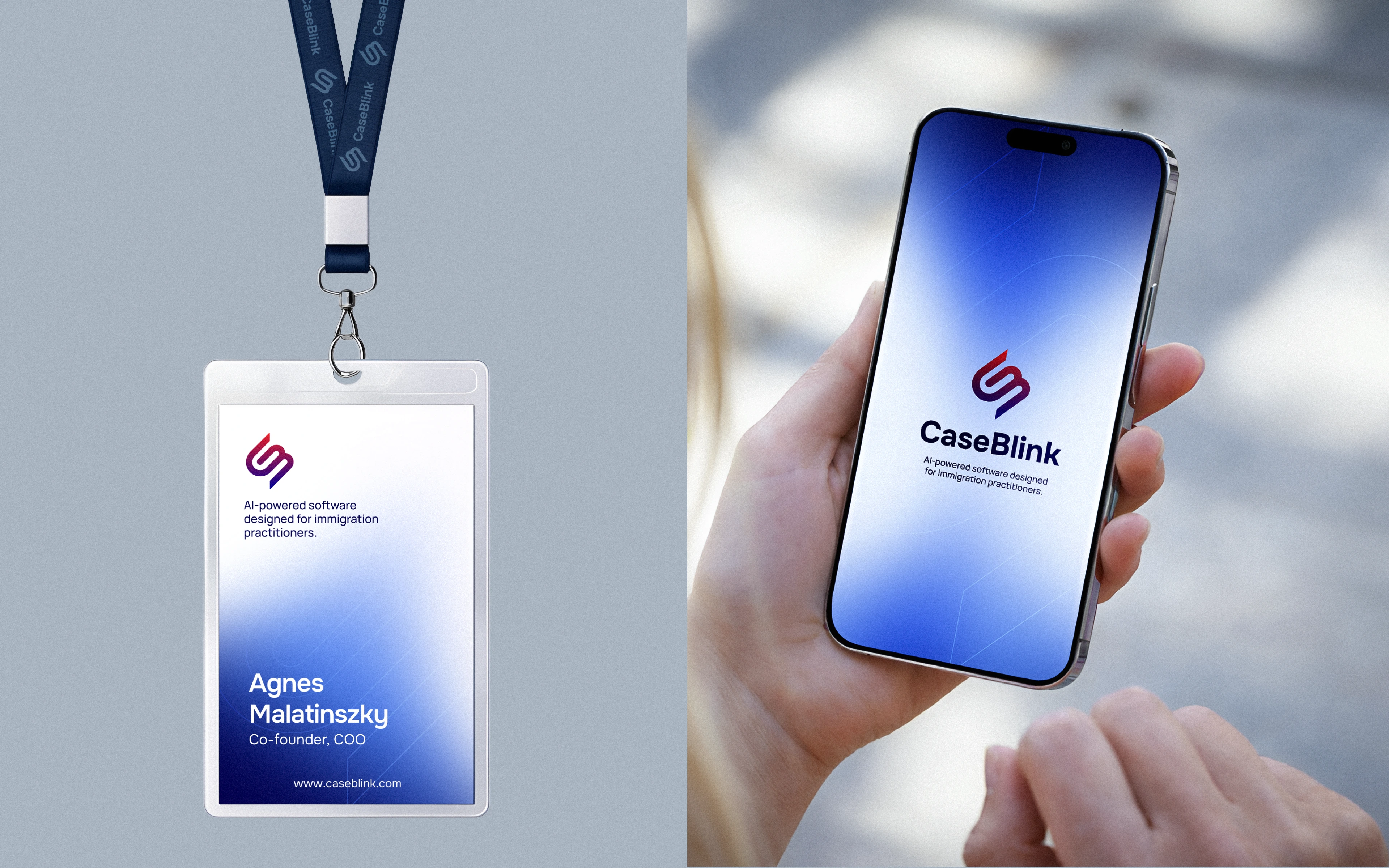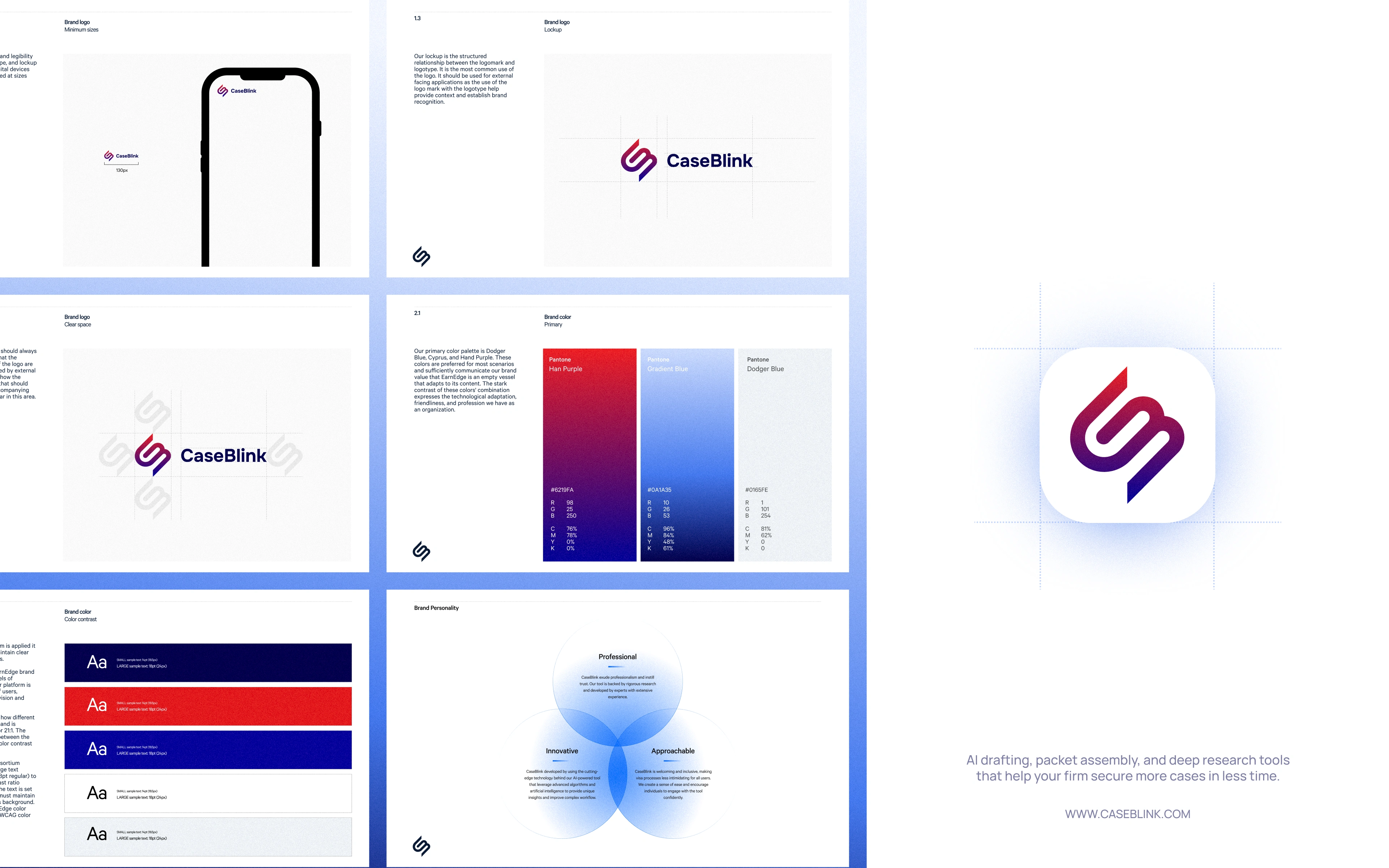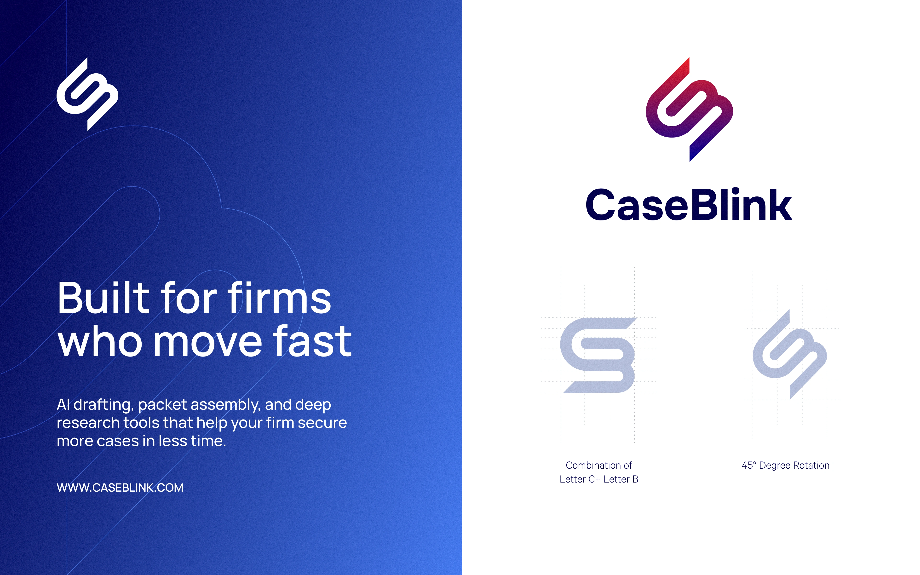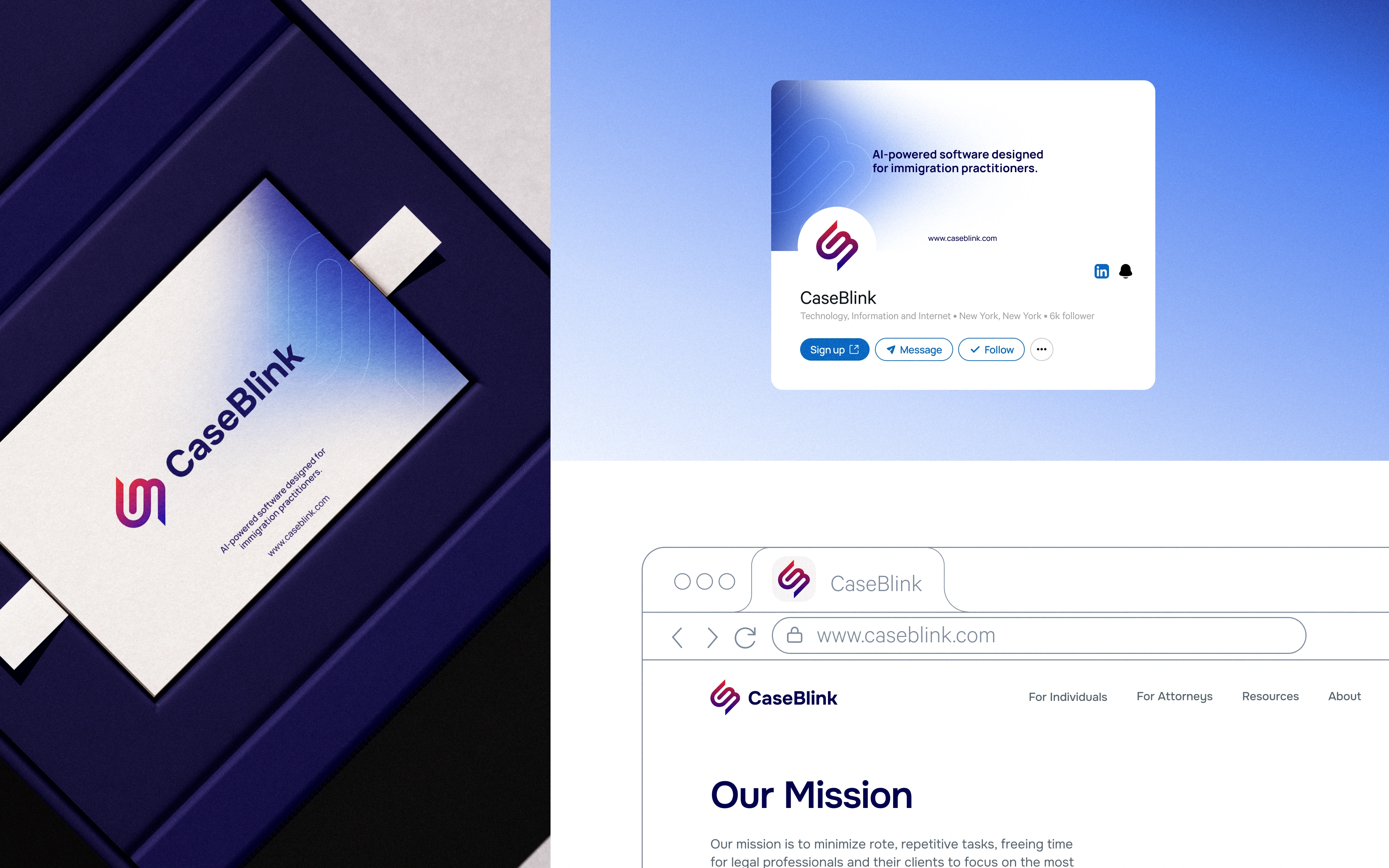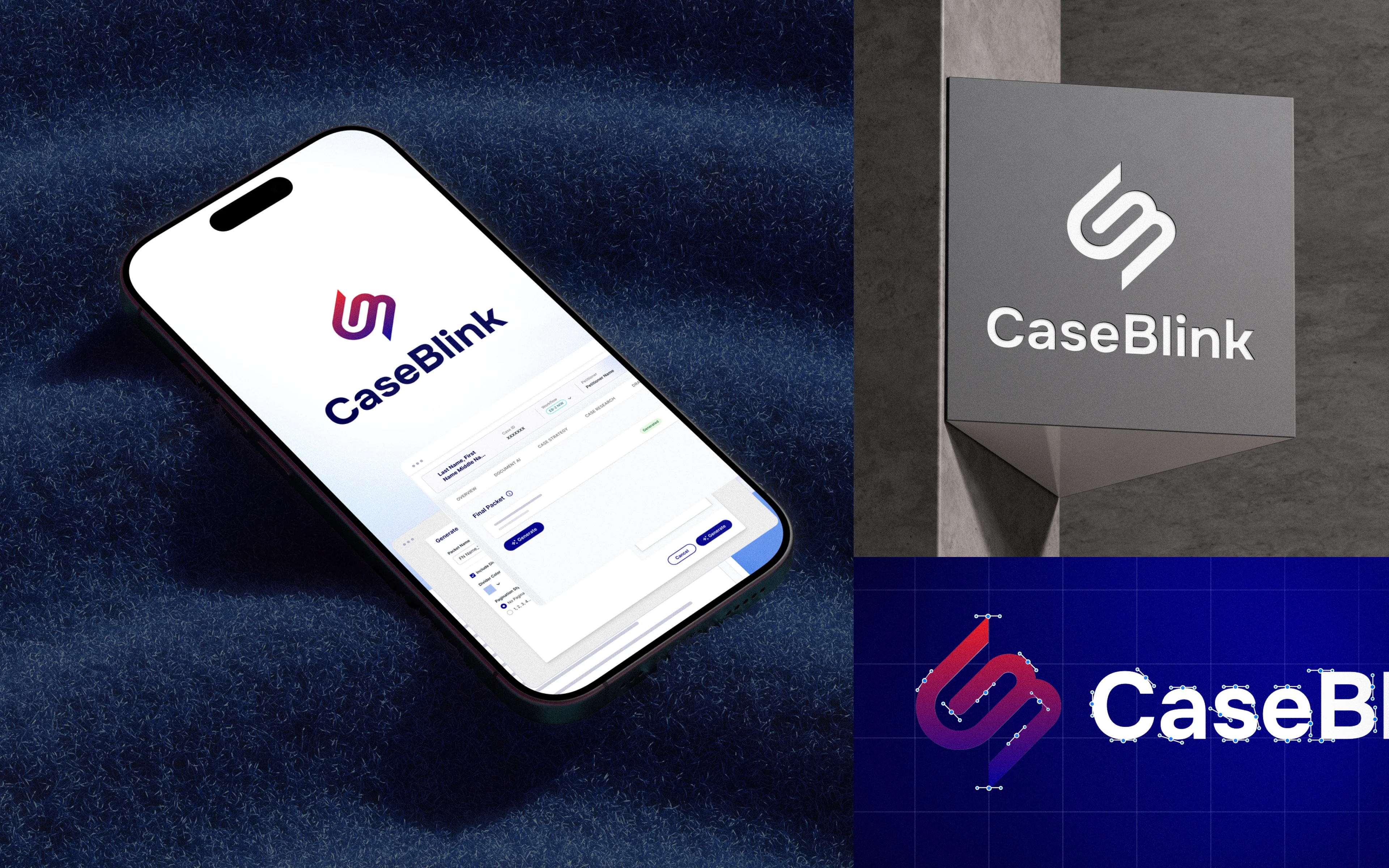 Immigration law is dense and the stakes are high, so the brand had to feel like something an attorney would trust. But CaseBlink isn't another clunky legal tool but a modern product, and the design had to say that without trying too hard. The harder part was timing. They were heading into fundraising, which meant the identity needed to do a lot of quiet work at once: look credible to lawyers, look modern to users, and give investors the sense that the people behind it knew what they were doing.