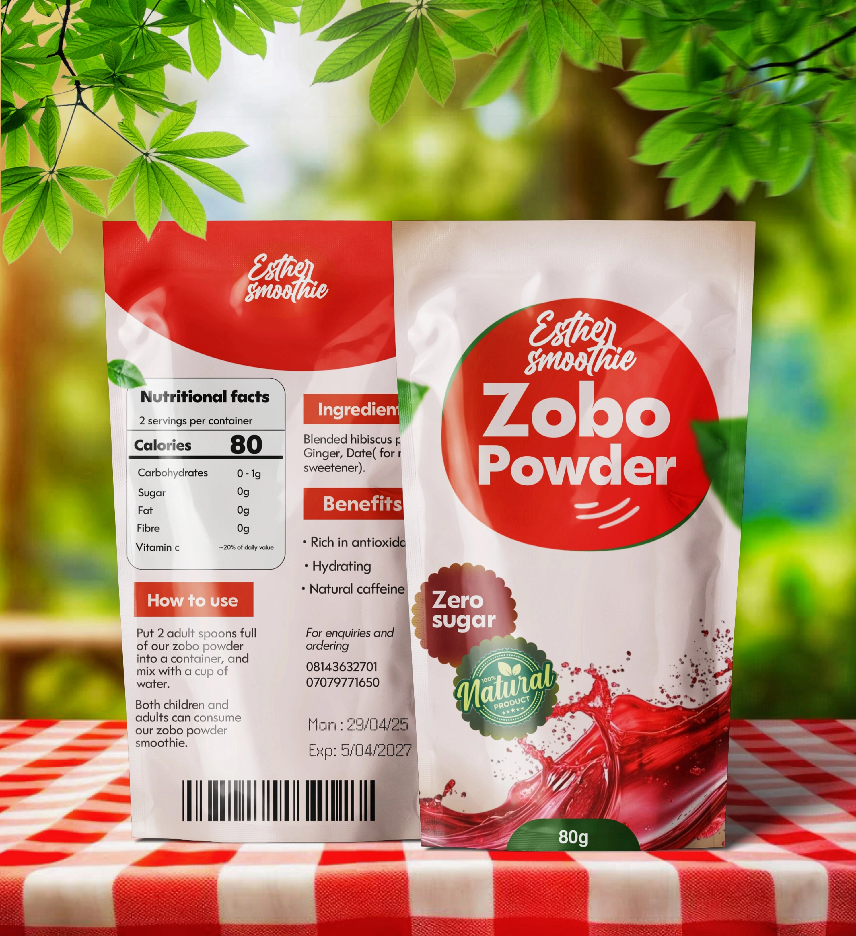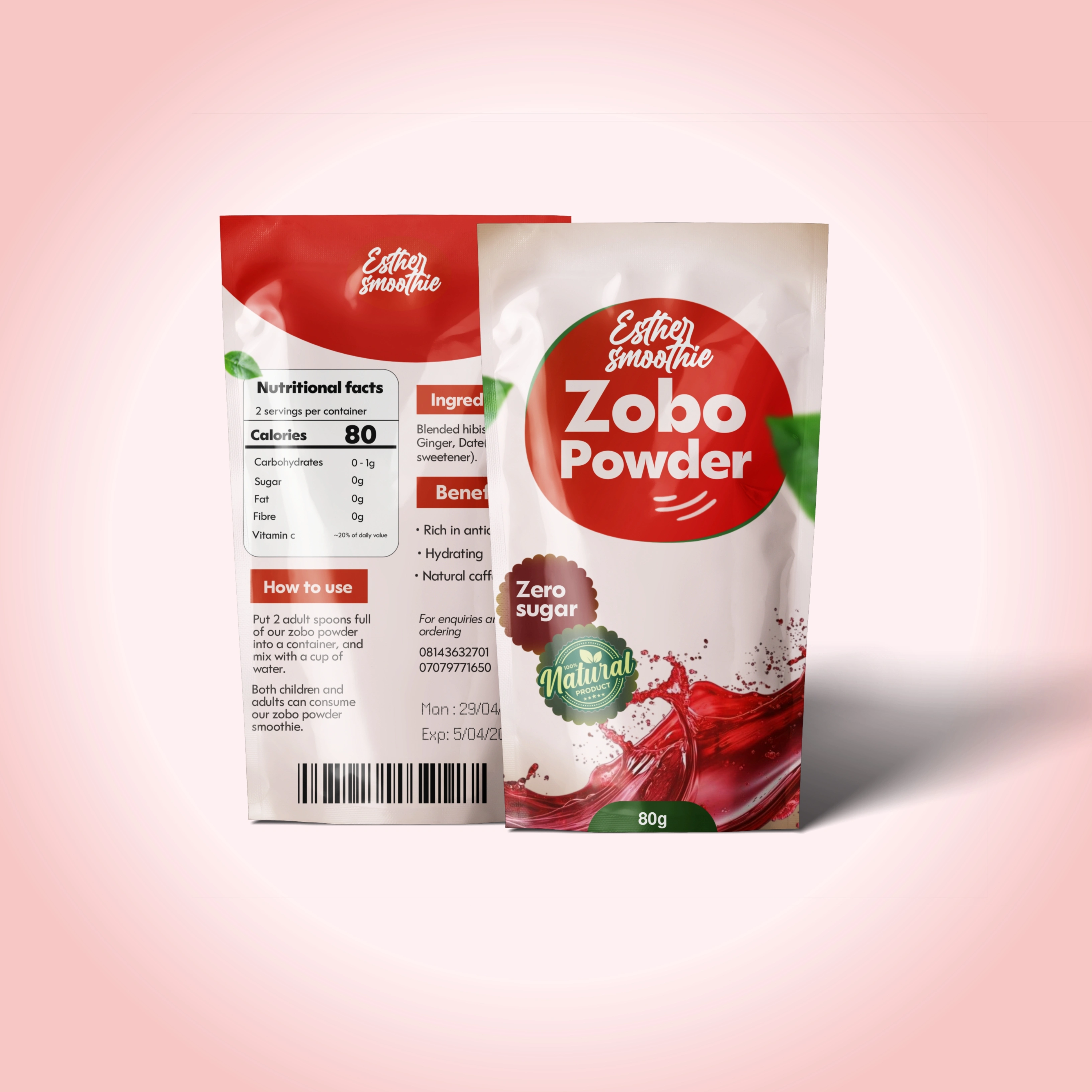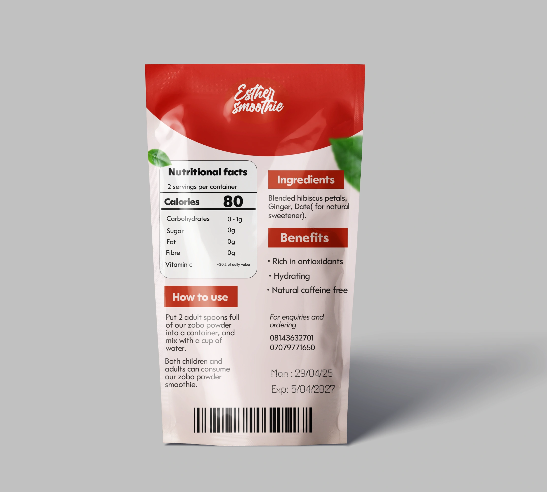 A client reached out to me about their zobo powder product. After designing this package design for them, the product went from selling 10 per month to 100+.