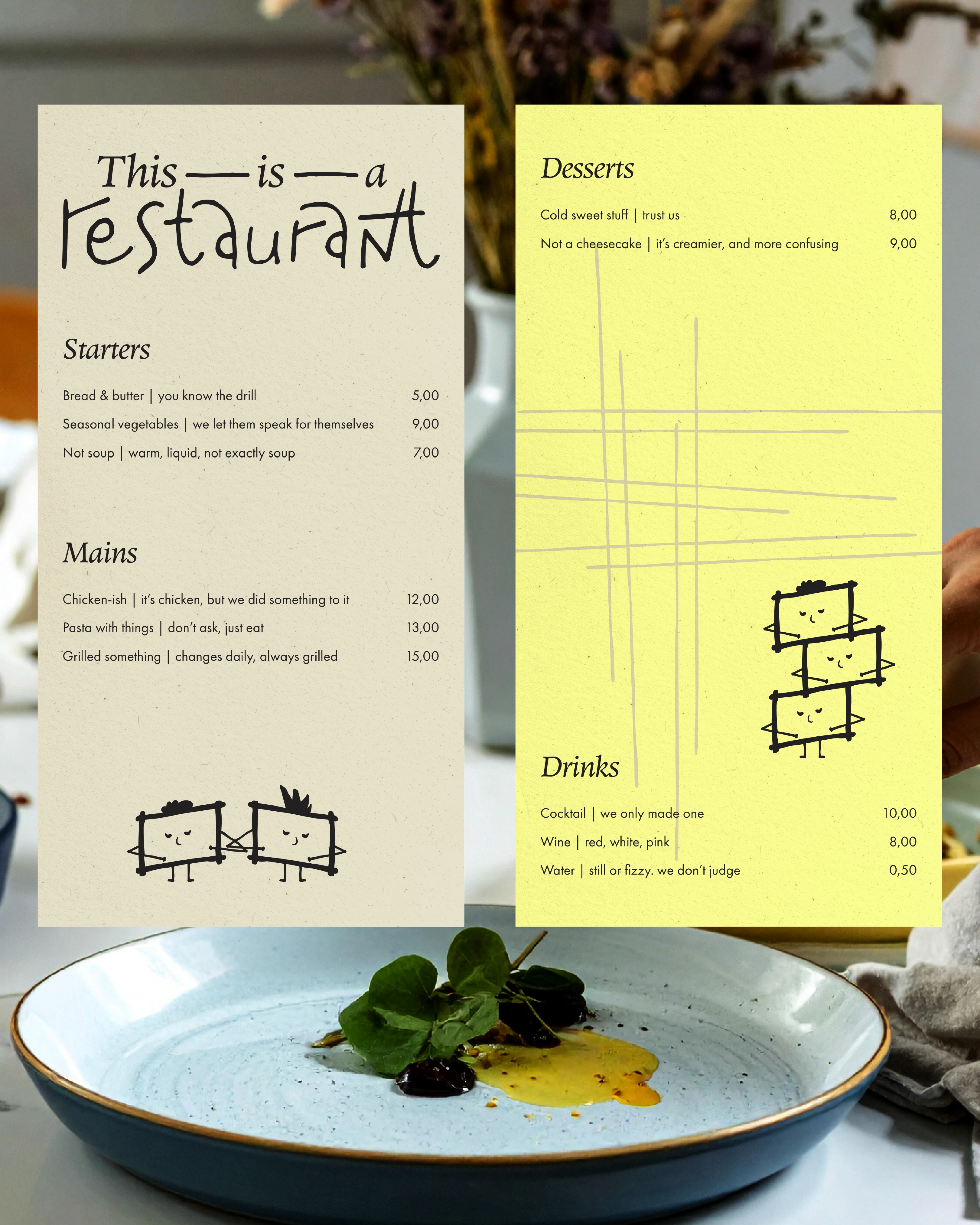 The design strategy centered on creating a refreshingly honest and approachable brand, challenging the traditional seriousness of dining. The typography has a hand-drawn feel and the playful mascots embody a fun, unpretentious spirit while maintaining a contemporary and welcoming feel.