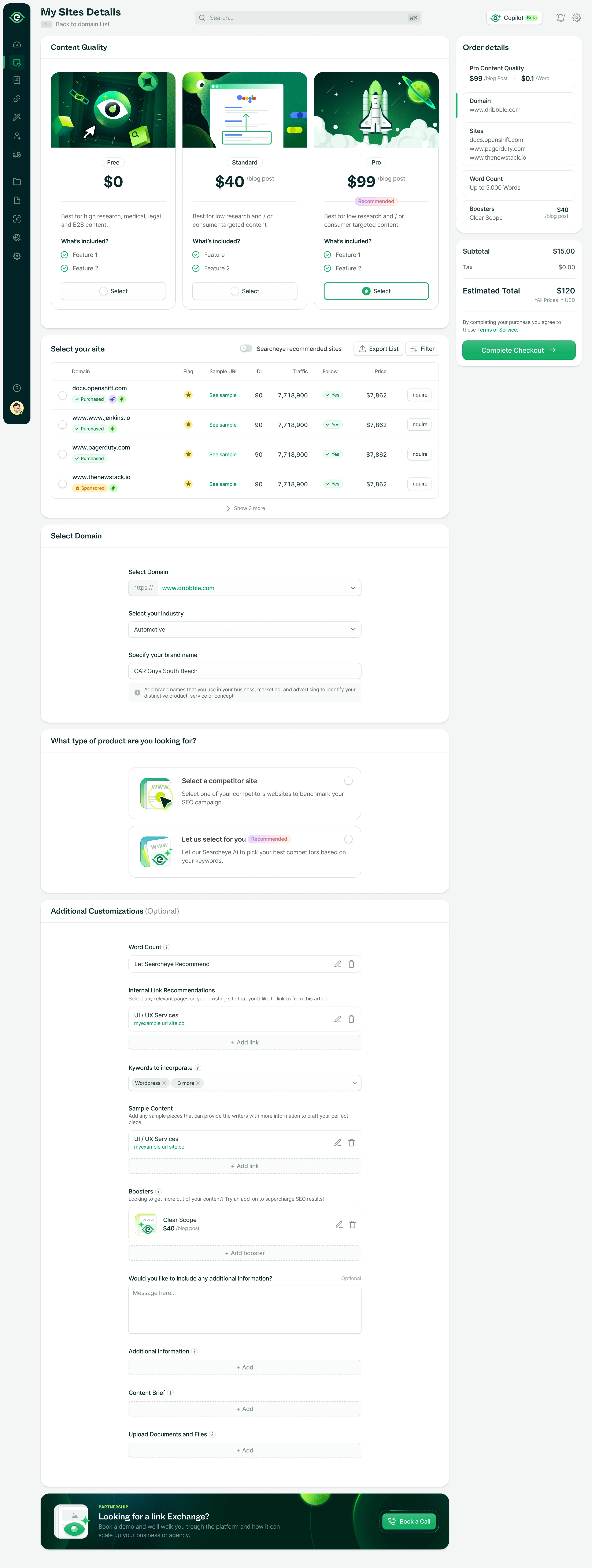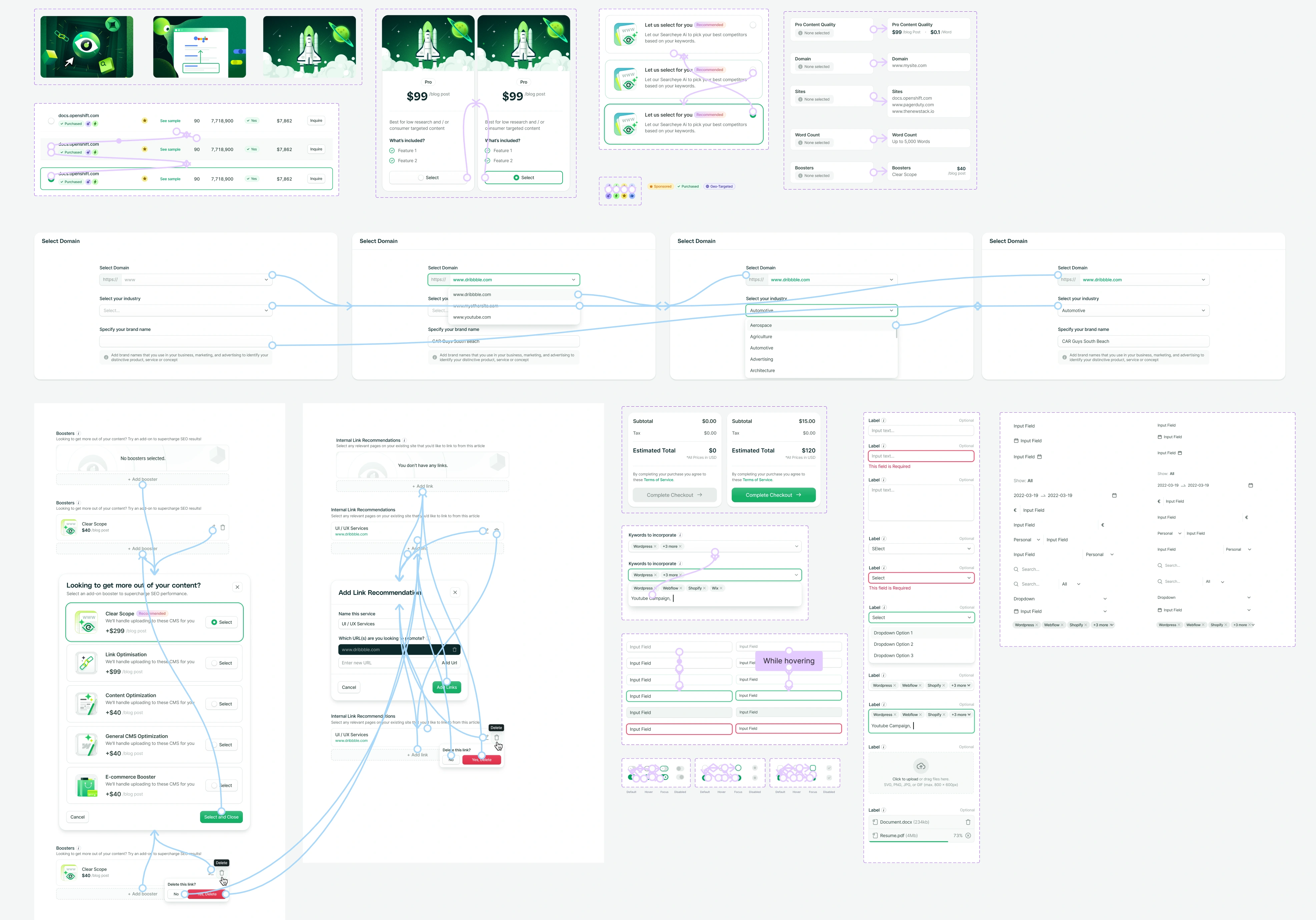 This was one of the longest forms I’ve had to design in recent years, and it came with a few challenges. Due to the large number of fields, it was clear that a multi-step modal approach wouldn’t work. Plus, we wanted users to see all their selections at any time in a sticky sidebar—like a mini shopping cart. So, breaking the form into page sections and using a two-column layout with a sticky sidebar for order selections was the best approach.