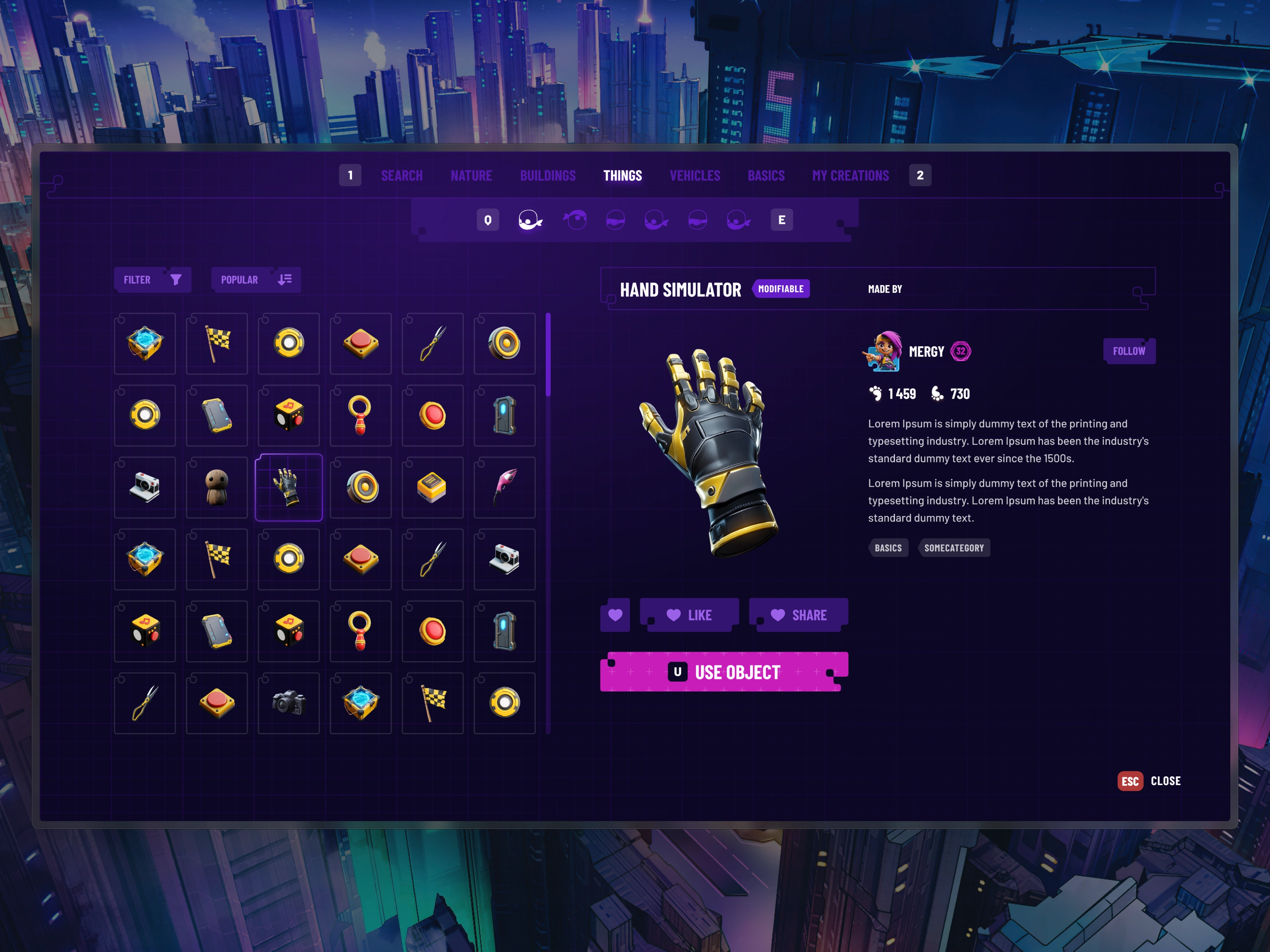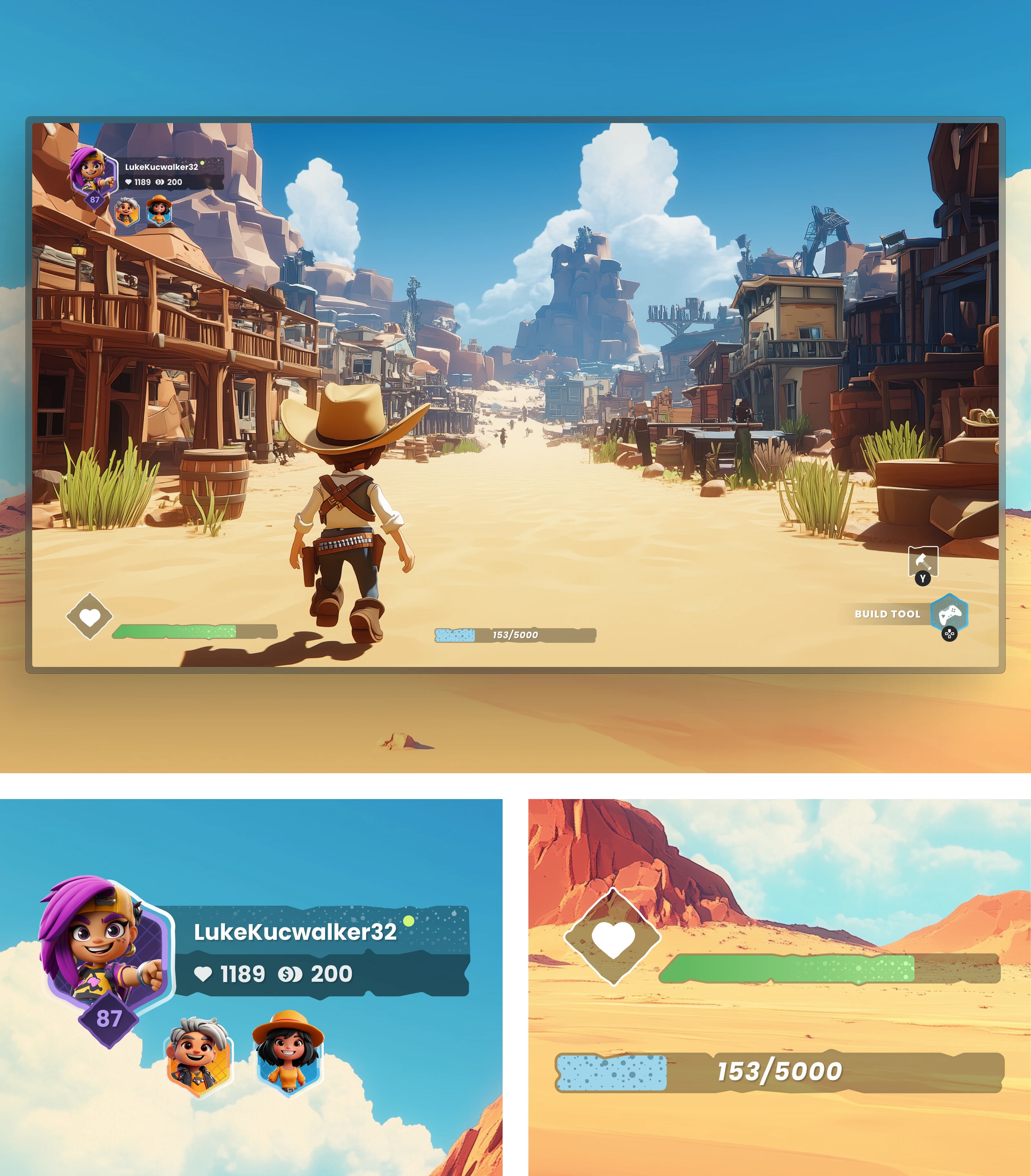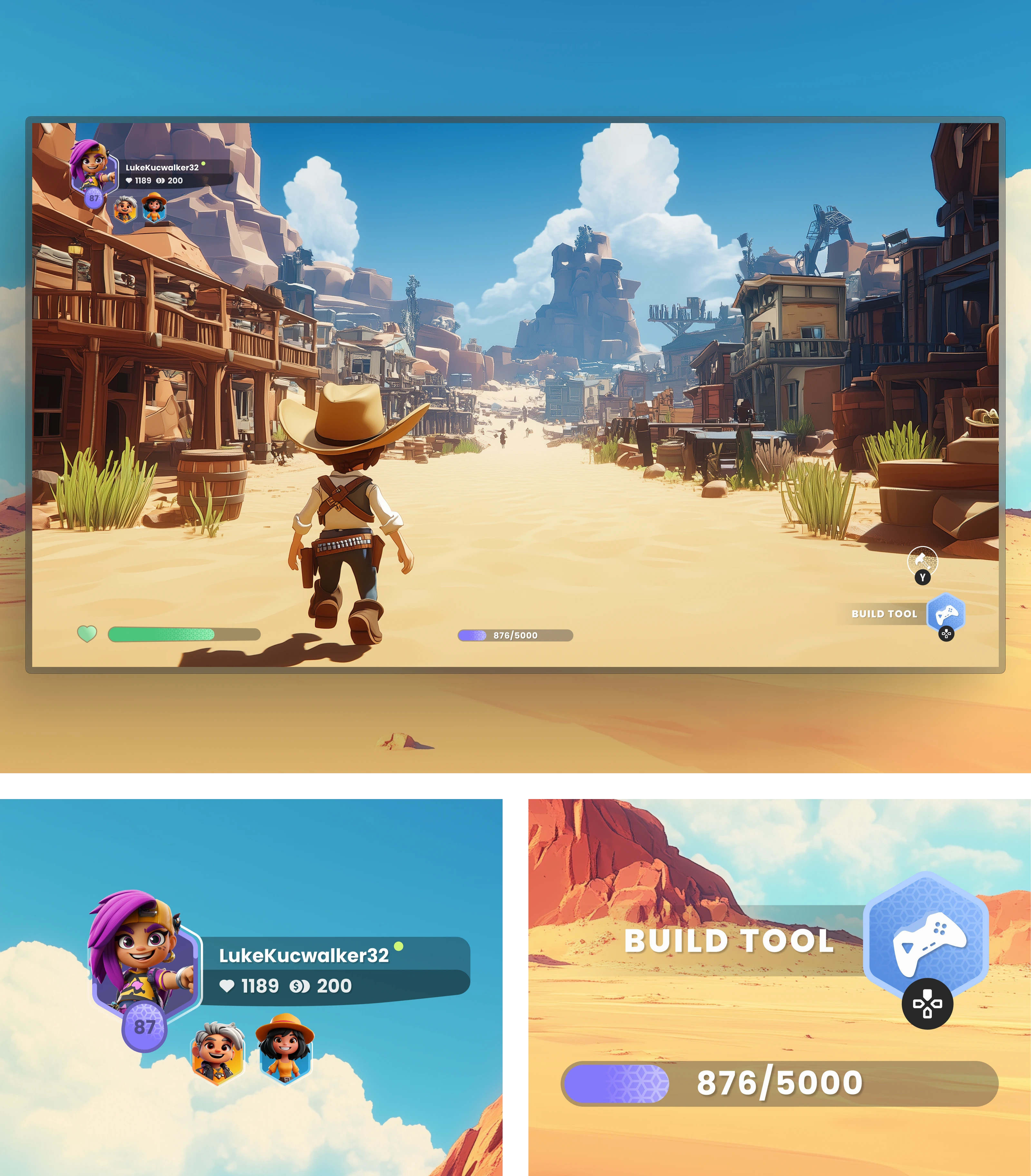 Conceptual UI/UX for a multiplayer builder game — modular design system, social-first UX, and adaptive interface for both PC and console gameplay.