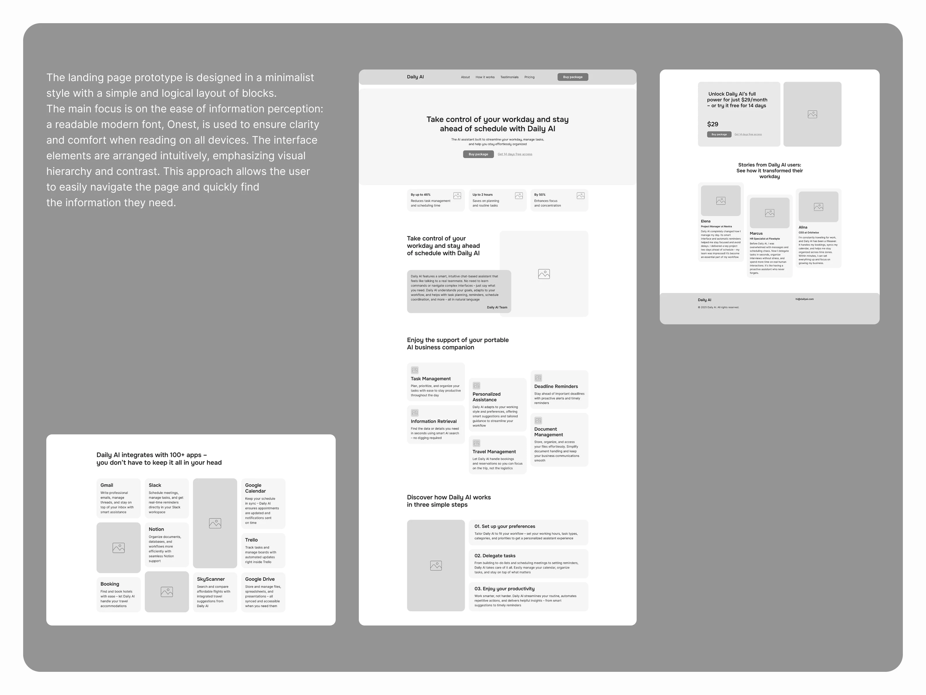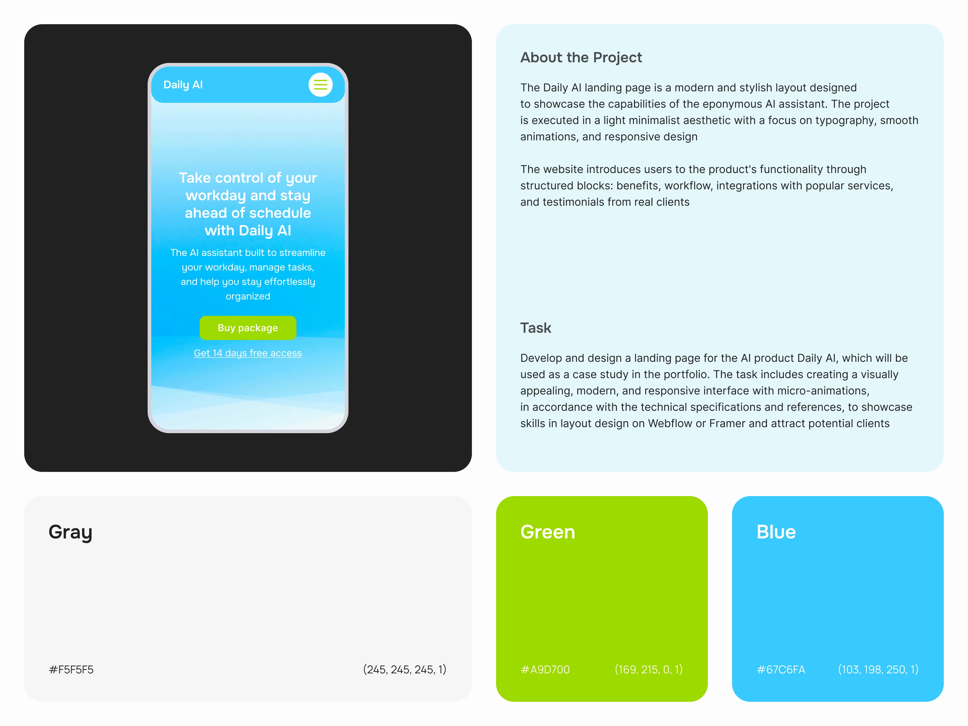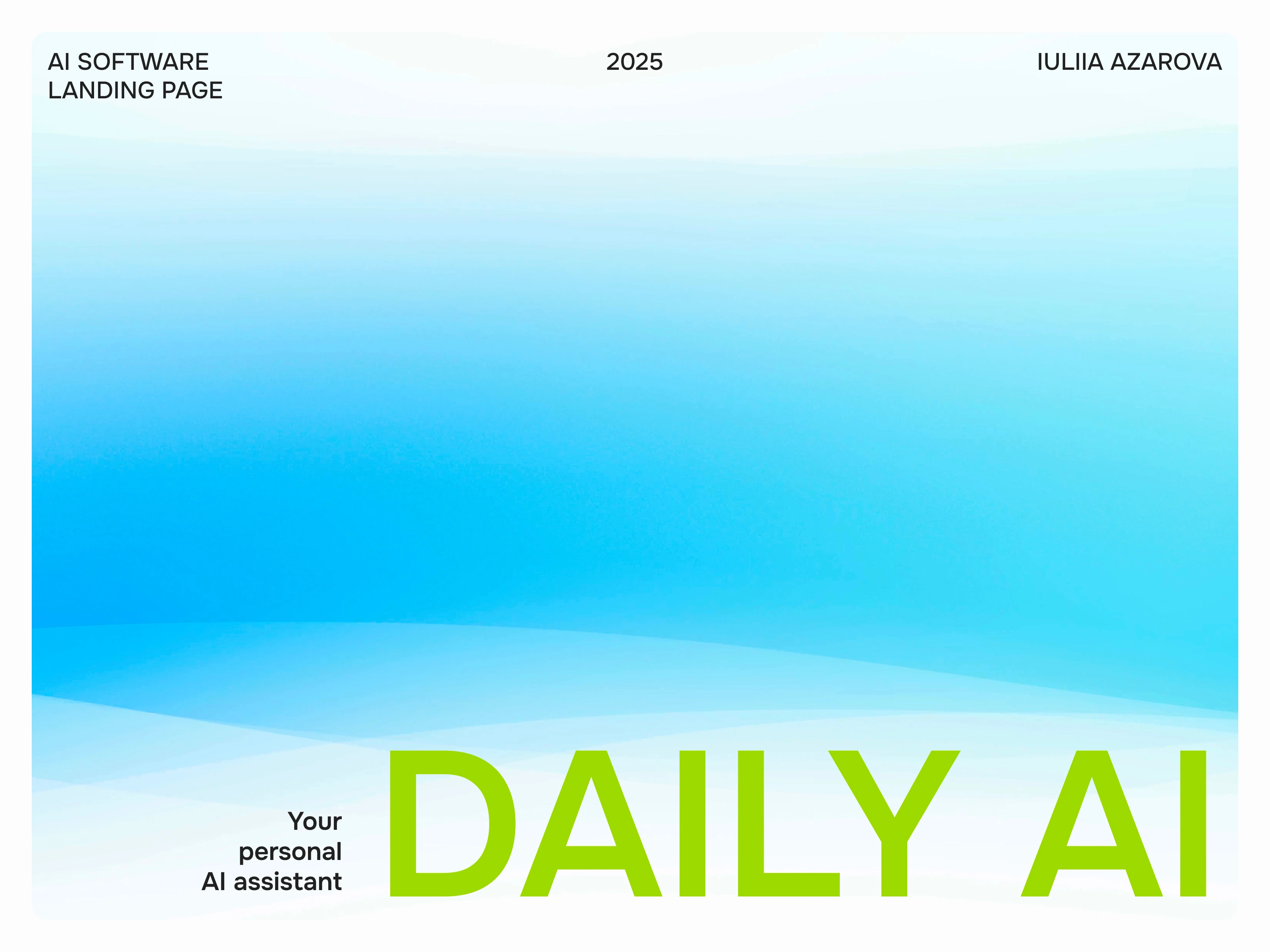 This project involved designing a modern, stylish landing page for Daily AI, a personal AI assistant. The core objective was to create a visually compelling, adaptive interface that effectively showcases product features and demonstrates high-level design skills for technical implementation in platforms like Webflow or Framer.