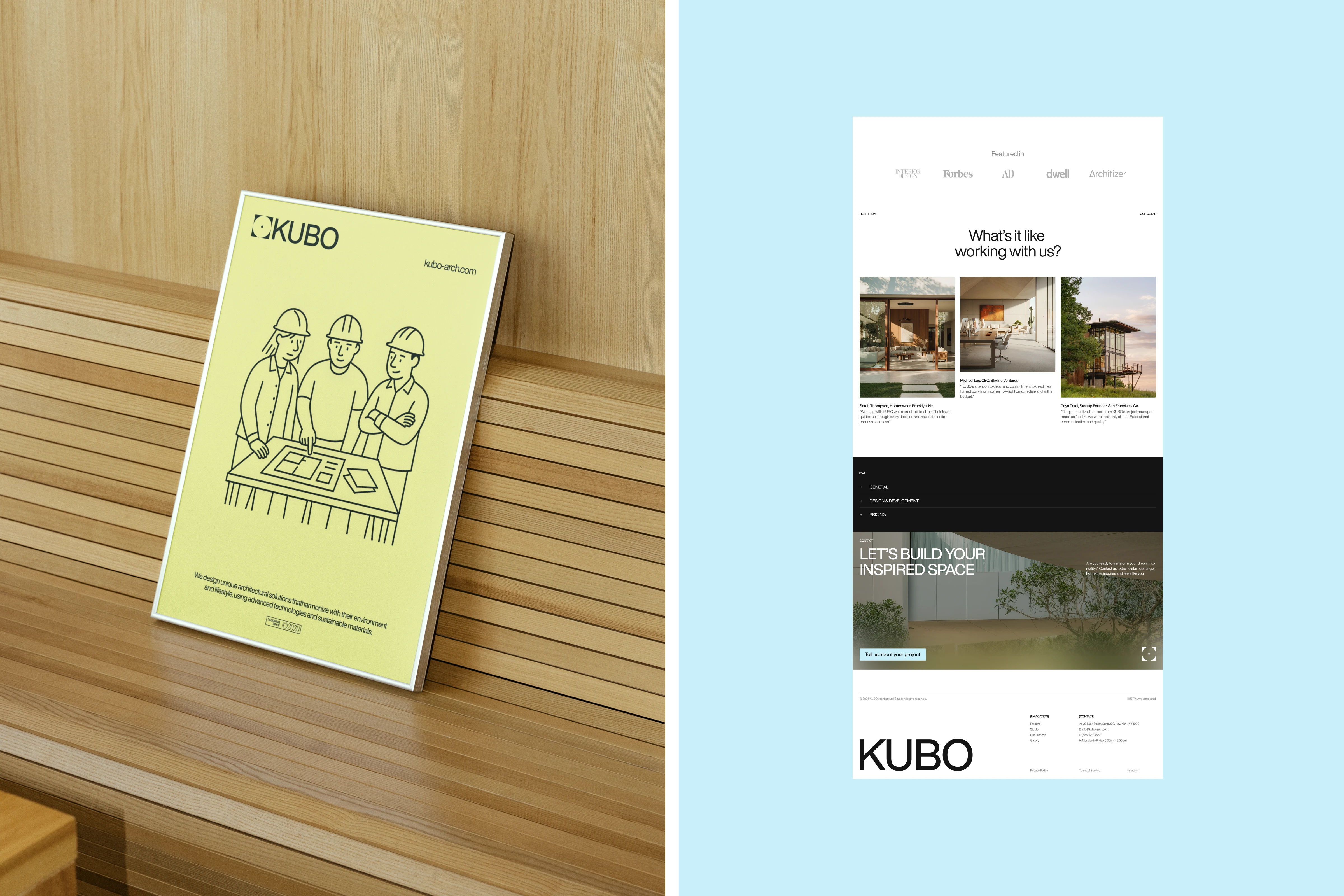 The result is a cohesive brand system that bridges architecture and design — where every element, from layout to typeface, feels intentional and timeless. KUBO stands as a statement of balance: between form and feeling, nature and structure, simplicity and depth.