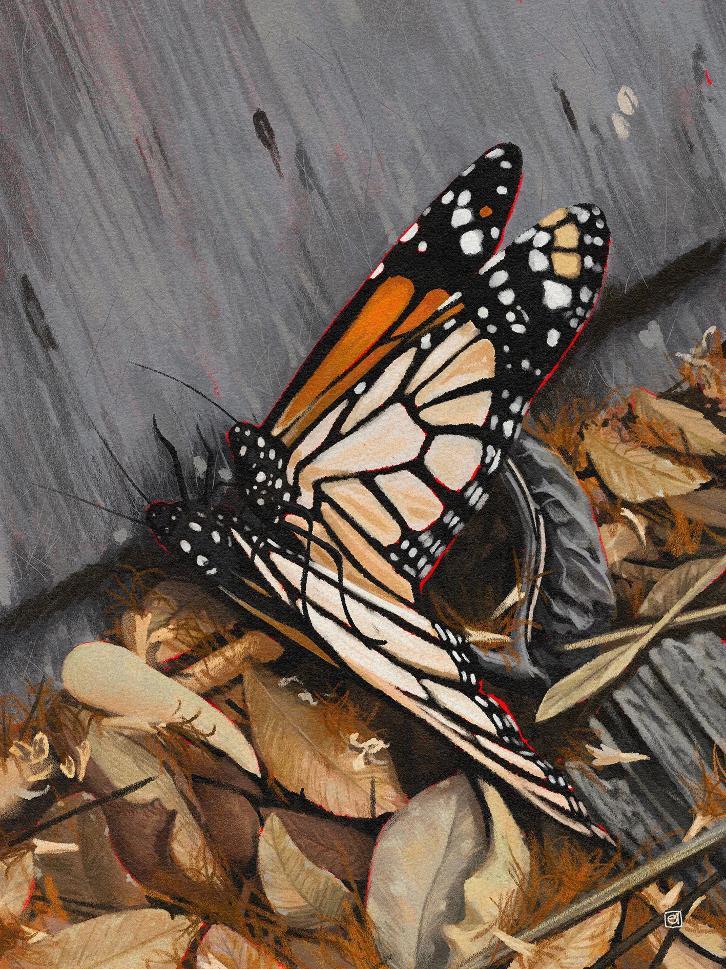 In 2020, while walking through my garden, I noticed two monarch butterflies resting on an old car. The contrast between the fragile beauty of the butterflies and the messy surface of the car immediately caught my attention. One of these butterflies was dead, while the other was resting over it. Without thinking too much, I took this photograph with my phone.