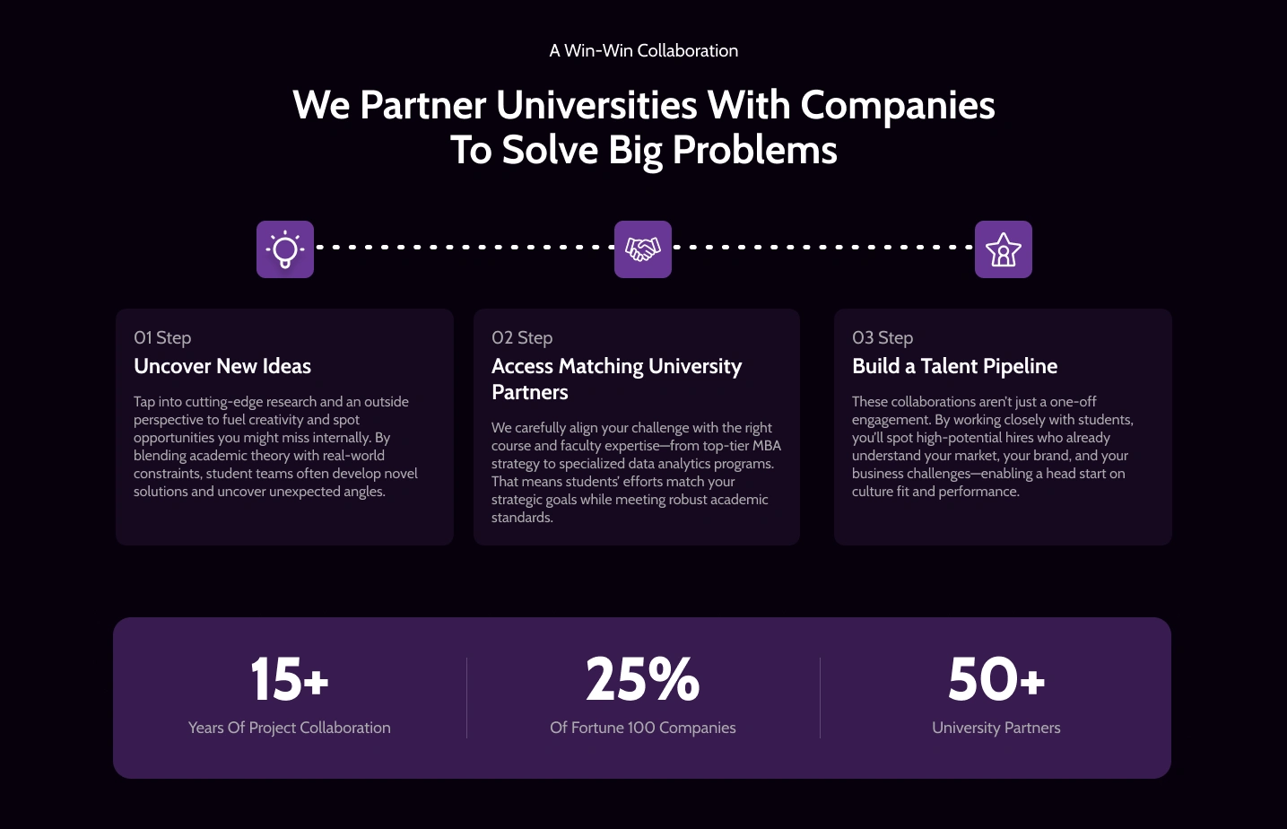 Supporting metrics—years of collaboration, Fortune 100 engagement, and university partners—reinforce legitimacy and scale, helping enterprise users quickly trust the model.