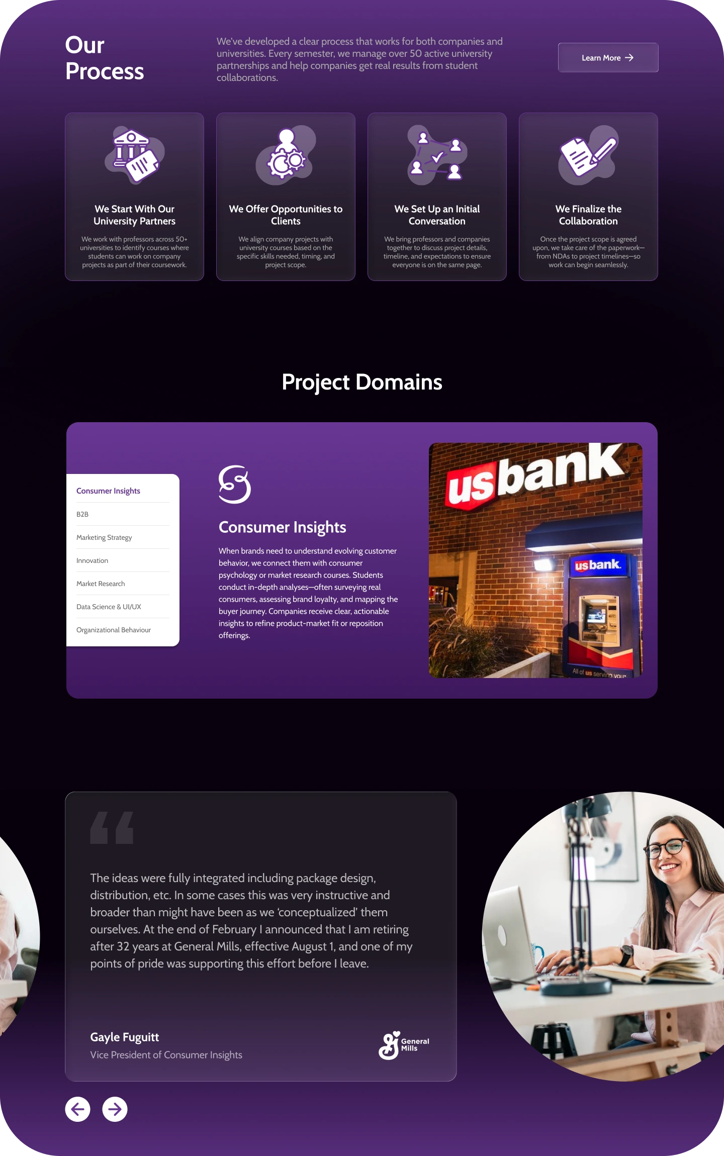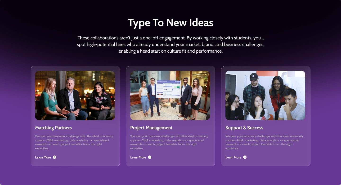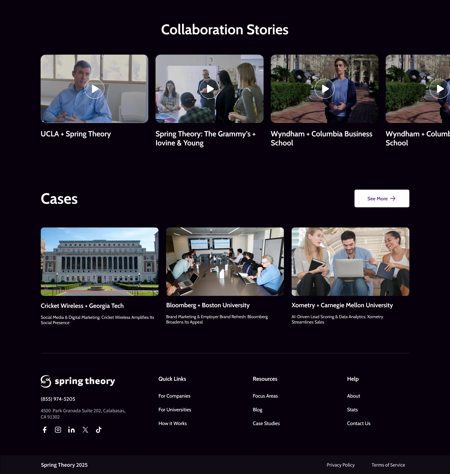 Spring Theory connects universities and companies through experiential learning and applied research. As the organization expanded its partnerships with leading brands and academic institutions, the website needed to do more than look modern—it needed to clearly explain a complex collaboration model while establishing enterprise-level credibility.