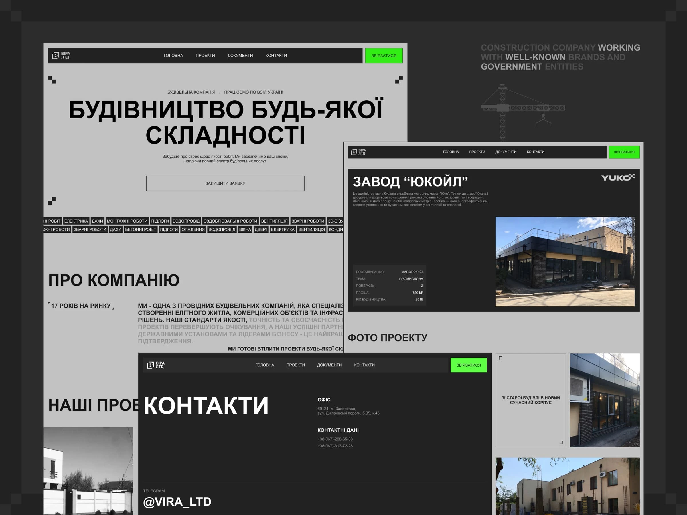 The project was created for the Ukrainian construction company Vira LTD. The main goal was to convey the seriousness, uniqueness, and openness of the company.