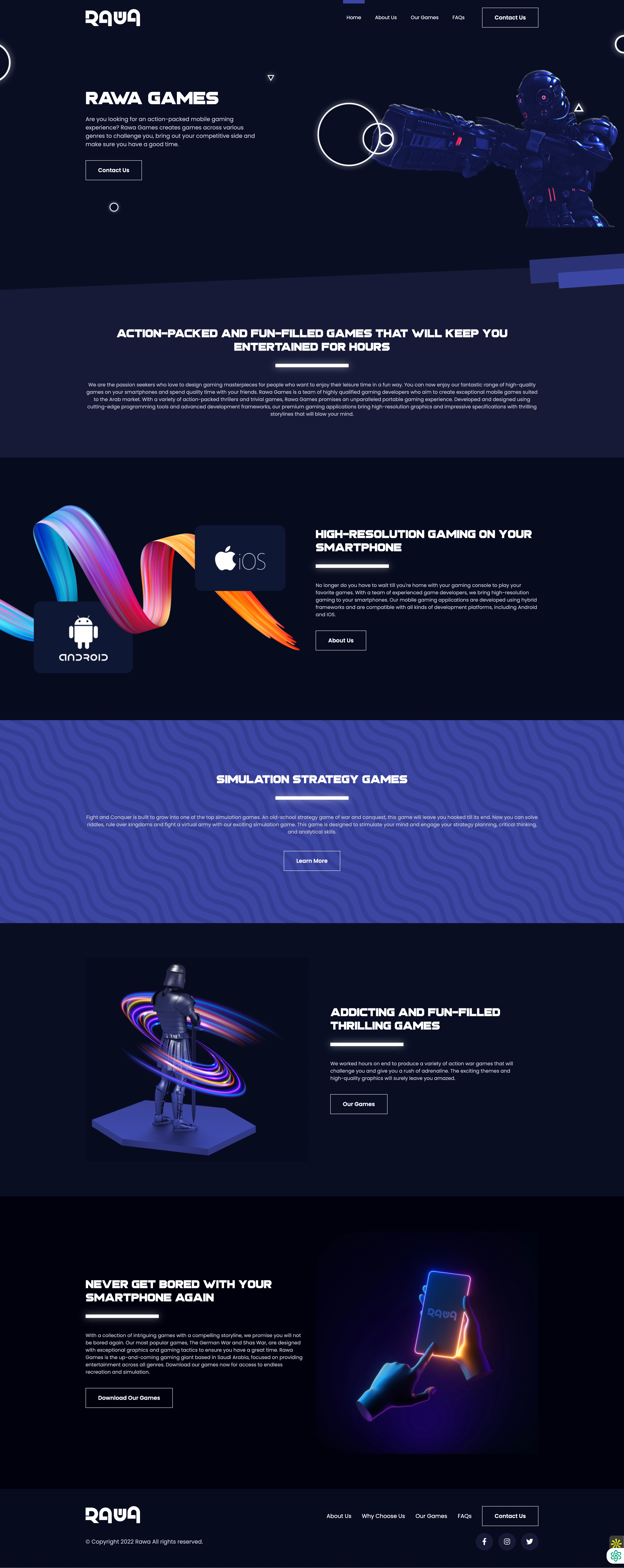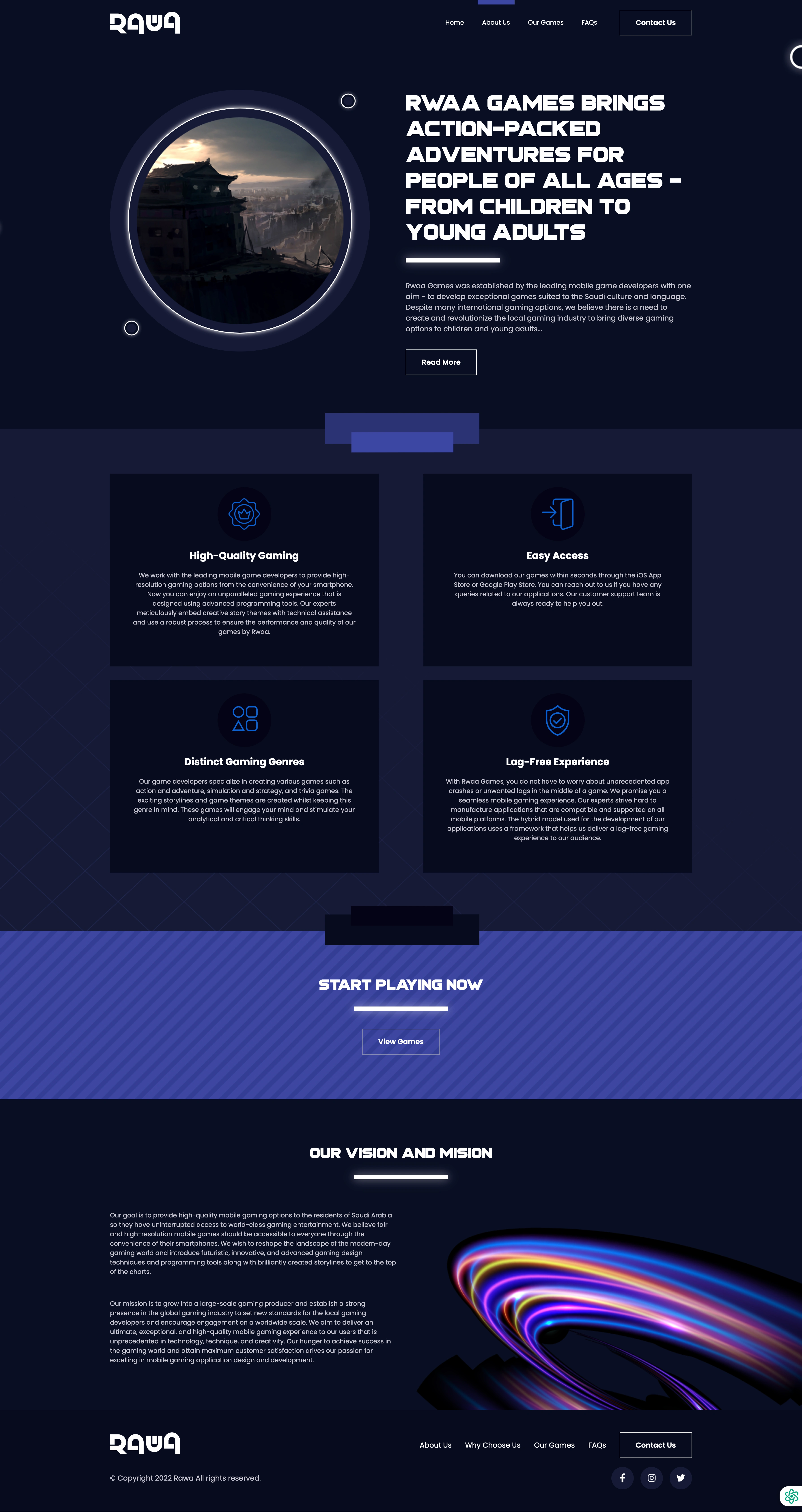 The project involved several key challenges: effectively capturing the dynamic nature and high-quality graphics of RWAA's diverse game portfolio, clearly communicating their development capabilities across different genres and platforms, authentically representing RWAA's innovative spirit as a leading mobile game developer, and creating an intuitive, exciting user journey for potential players and partners. To tackle these, our developers at icoderz designed an immersive game showcase featuring vivid visuals and engaging descriptions of each title, crafted a streamlined architecture for effortless navigation through their game genres and services, implemented a modern and fully responsive design ensuring a seamless experience across all devices, and integrated captivating content that celebrated their unique approach to game development and market focus.