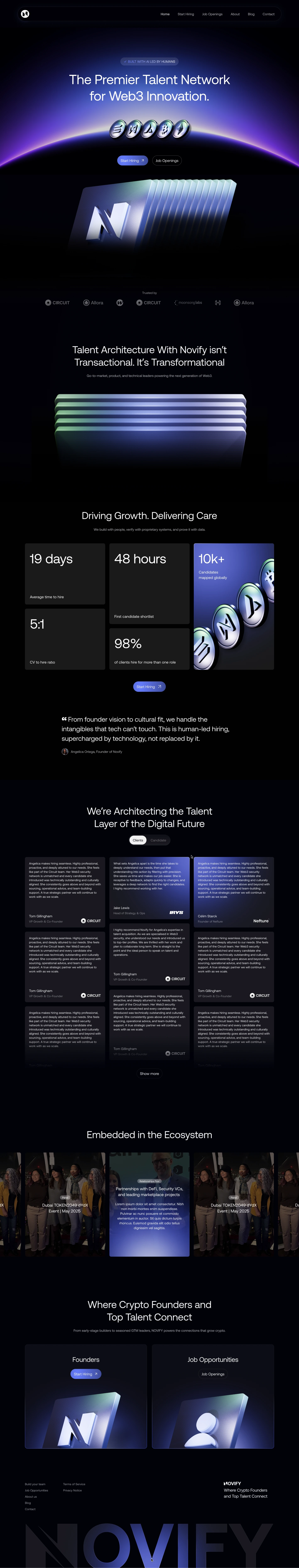 Novify is a human-led, AI-assisted Web3 hiring platform. I designed a high-impact landing page focused on trust, speed, and measurable outcomes, combining a futuristic visual language with clear hierarchy and bento-style layouts to drive conversion.
