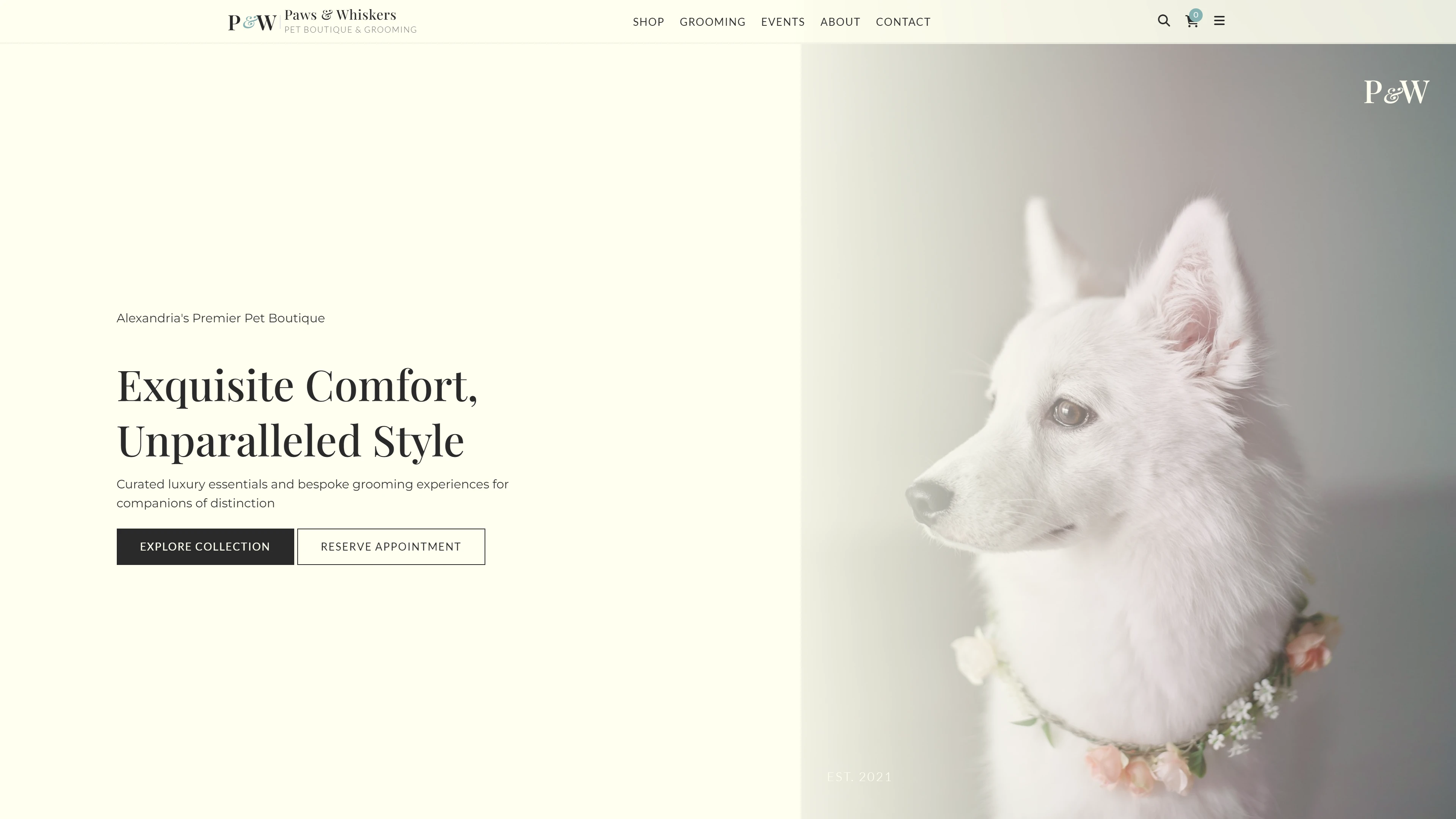 Paws & Whiskers is a fictional luxury pet boutique combining refined branding with intuitive e-commerce and service booking. The experience is tailored for discerning pet owners seeking premium products and grooming services.