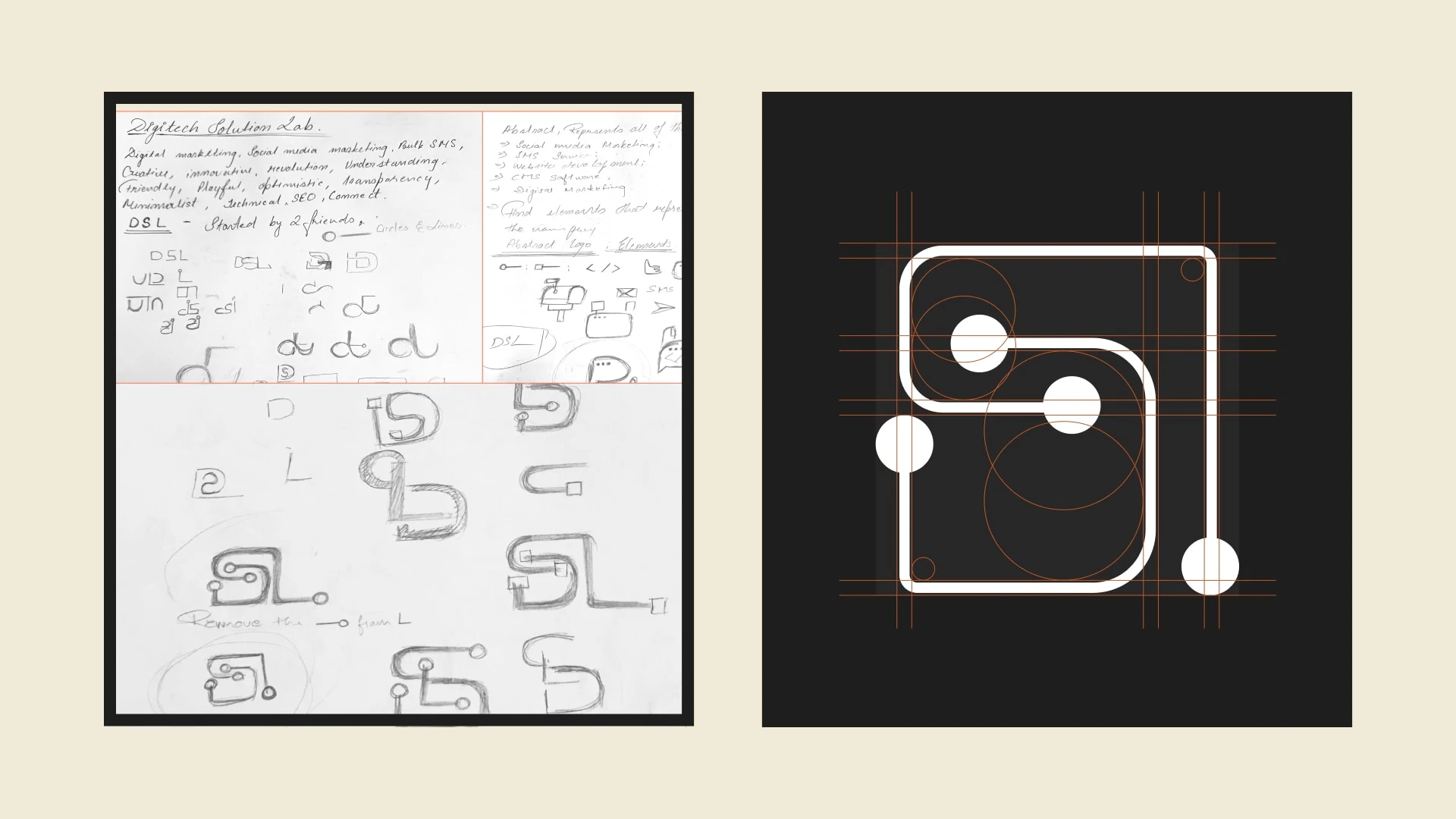 The final logo is built using two linear forms that come together to create the initials “DTSL.”