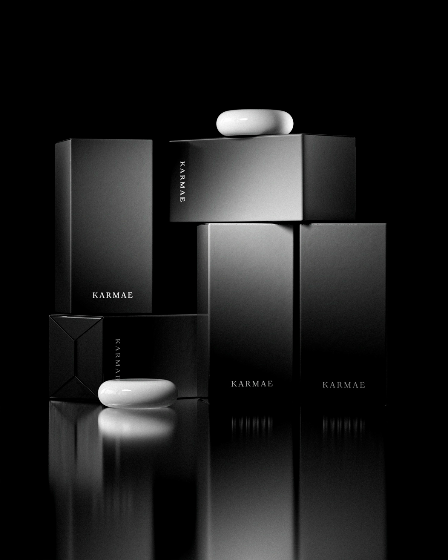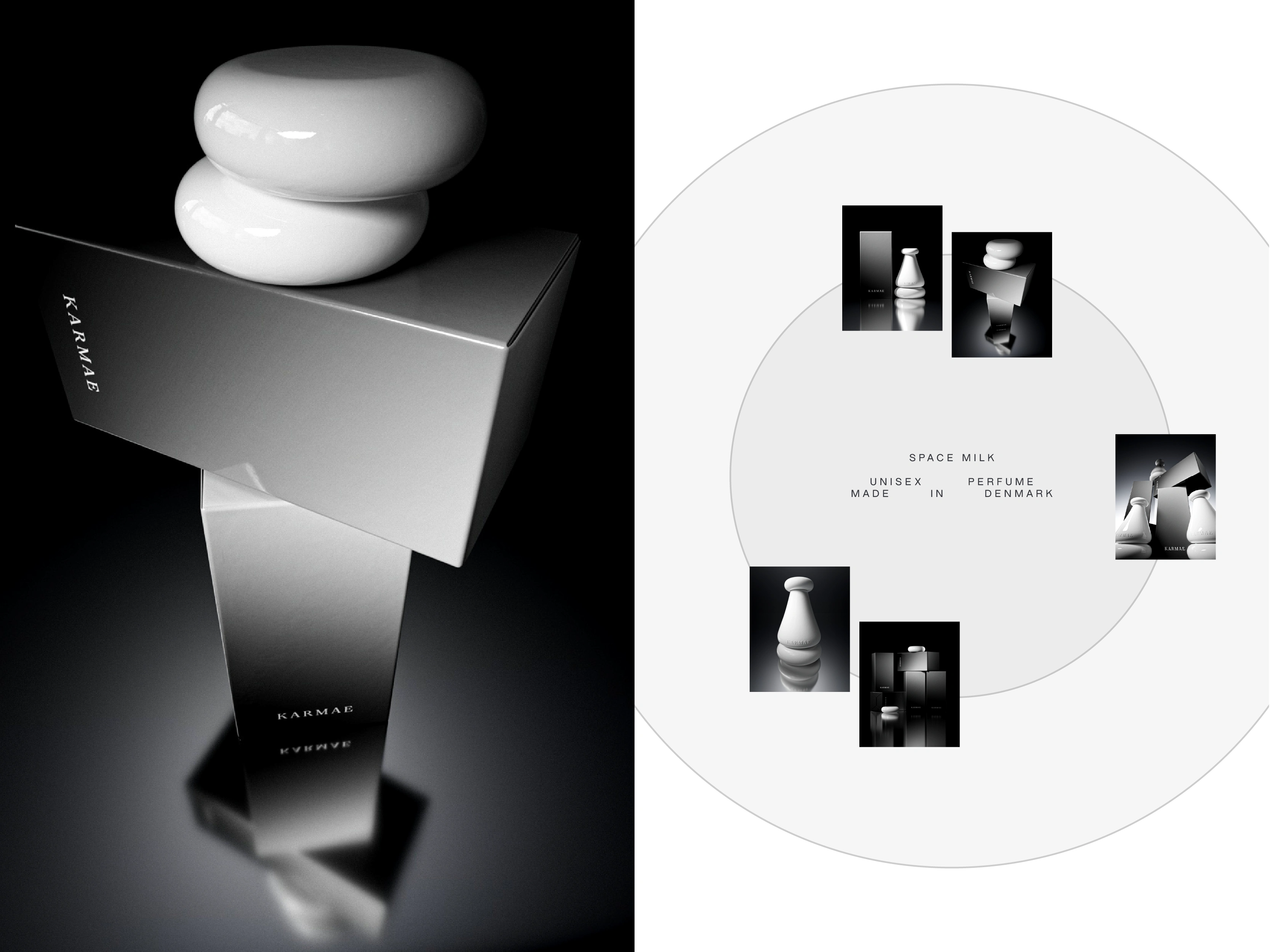 The creative direction is modern, quiet luxury with elements that resemble space bodies and deep blue gradients. The aesthetic is muted and calming, attracting various range of people that value quality and visuals. The bottle design is inspired by geometry, sculpture and space bodies and its soft, round edges sit perfectly into the hand palm. The goal was to create an elevated product that would match Karmae's core values and high quality of unisex fragrances.