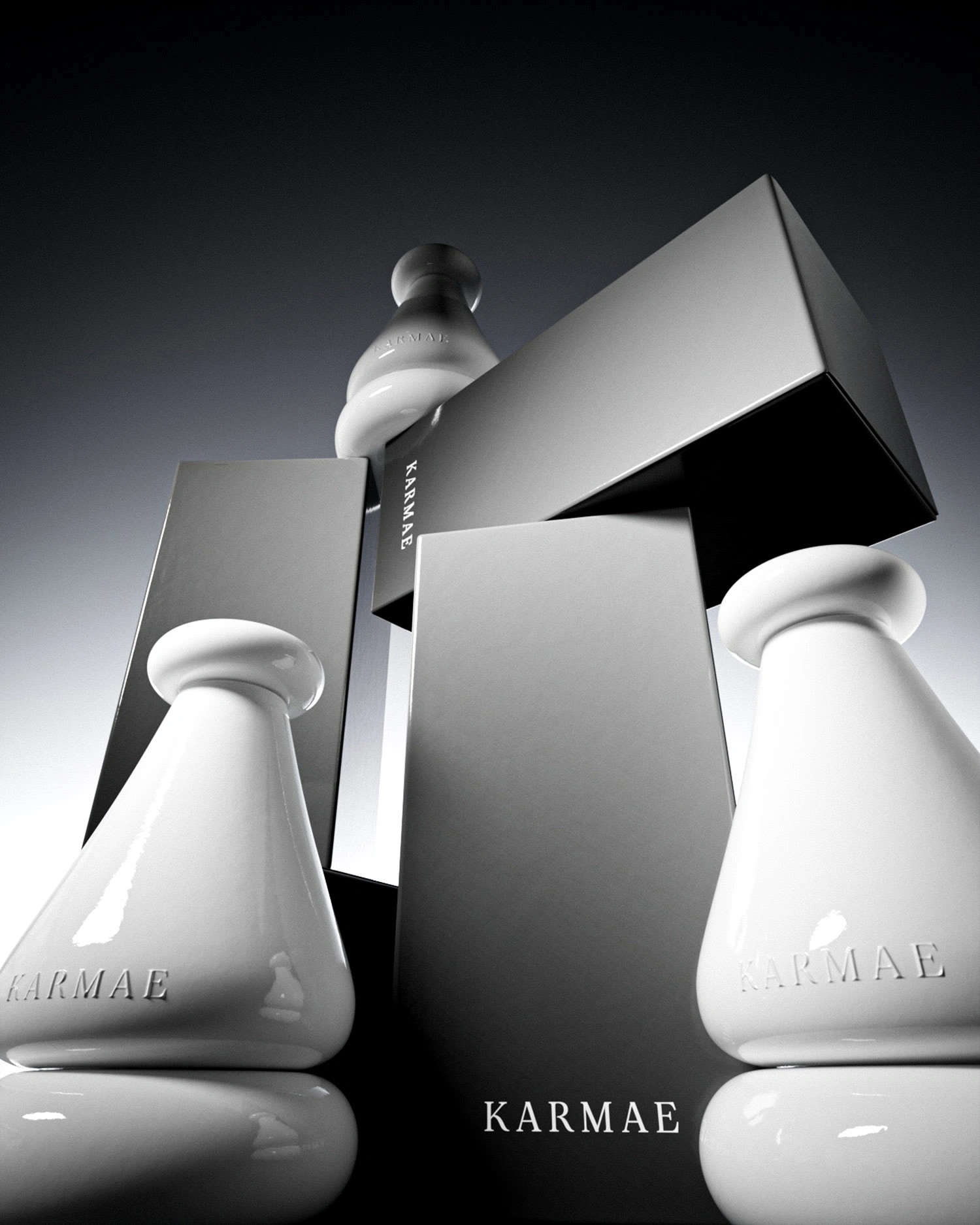 The bottle design is brought to life through 3D modeling and texturing, allowing us to get a glimpse of what an actual product would look like if it was to be manufactured. This unique bottle shape was achieved by bringing many drawn concepts to a 3D program and building models based on each illustration until finally achieving a perfect shape that speaks to Karmae.
